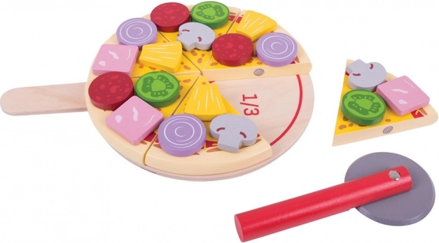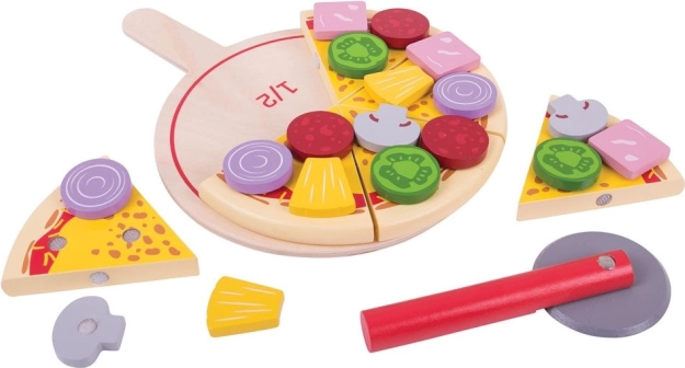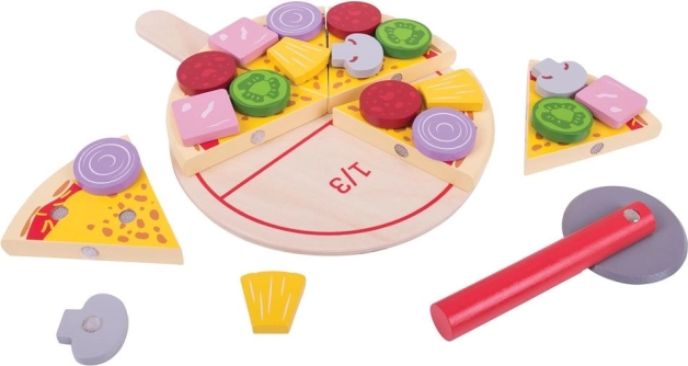 Šest kosov pice z ježkastimi spoji drži skupaj in jih je mogoče »odrezati« z lesenim rezalnikom. Otroci doživijo realistično rezanje in serviranje.