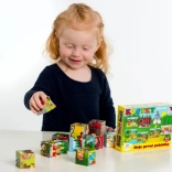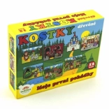 Ta set 12 lesenih slikovnih kock v čvrsti kartonski škatli prinaša otrokom veselje pri sestavljanju in prostem grajenju. Iz kock boste sestavili 6 očarljivih pravljičnih prizorov – od Rdeče kapice do Janka in Metke – hkrati pa boste iz njih gradili dimnike, gradove ali ograde za živalice.