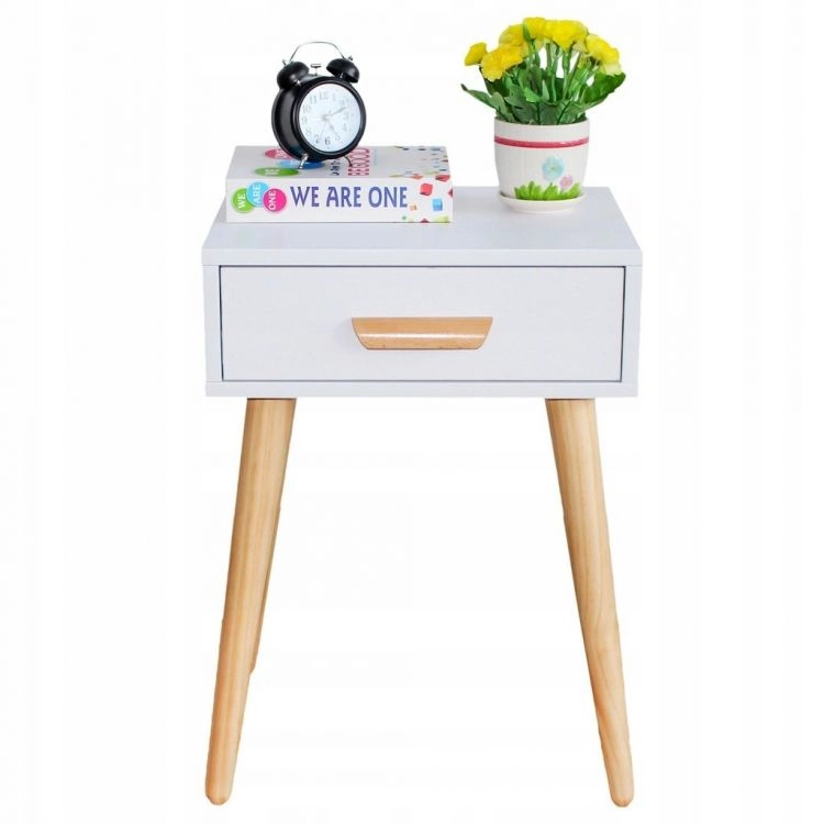 Masivne borove noge držijo mizico trdno na mestu. Predal z lesenim ročajem skrije vse malenkosti, ki jih želite imeti pri roki.