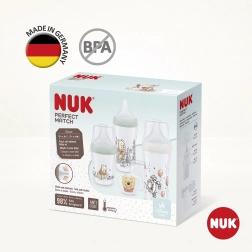 Komplet NUK Perfect Match je zasnovan tako, da podpira enostaven pristav, priporočan s strani babic in pediatrov. Zaradi izjemno mehkega in prilagodljivega cuclja se steklenička nežno prilagodi dojenčkovim ustom in zagotovi udobje pri hranjenju. Klasični sodobni motivi DISNEY iz pravljic z Medvedkom Pu razveselijo male in velike oboževalce.