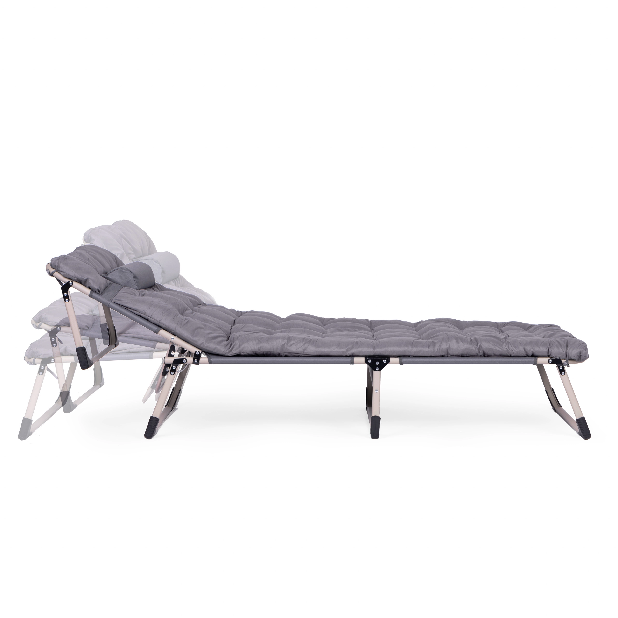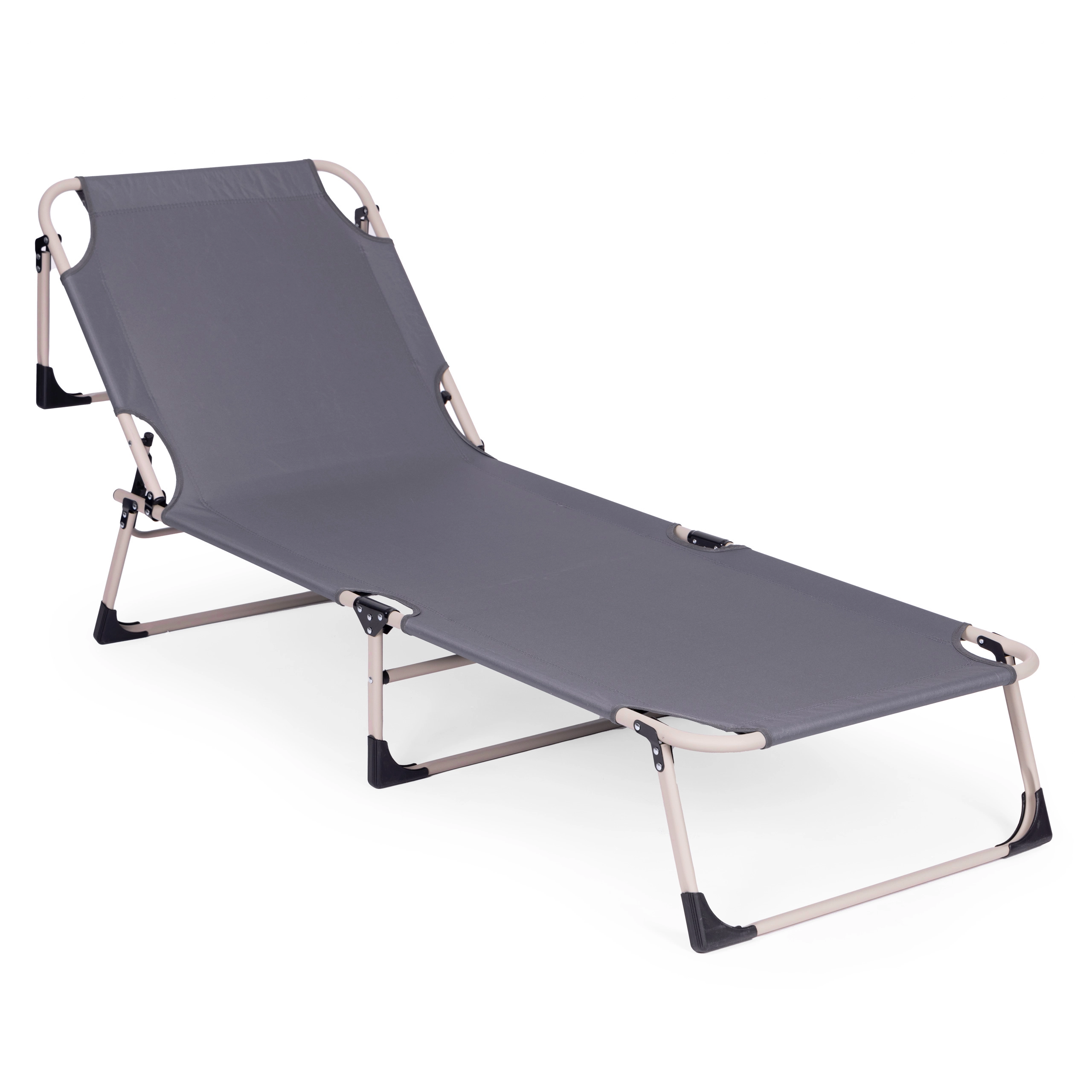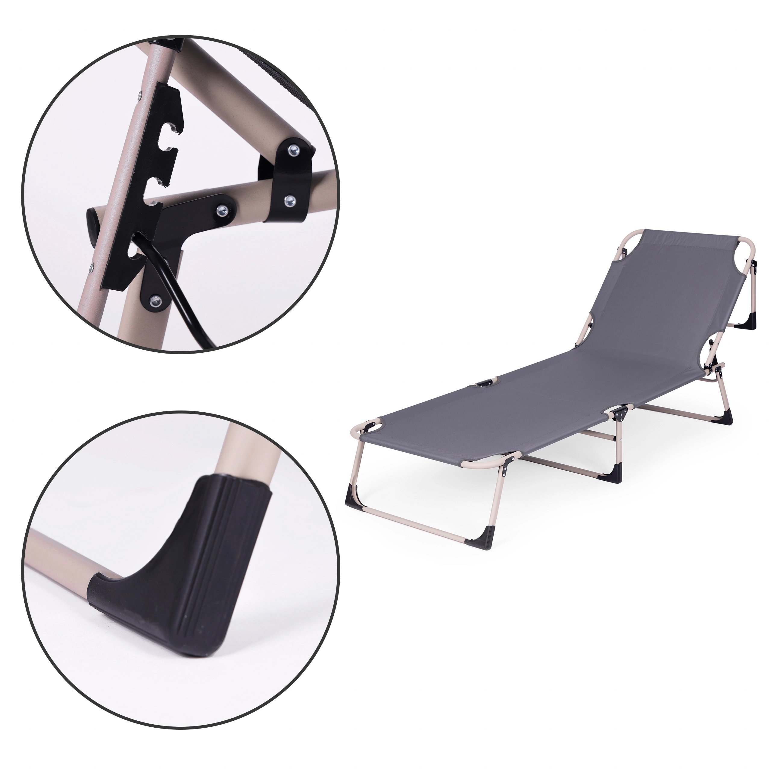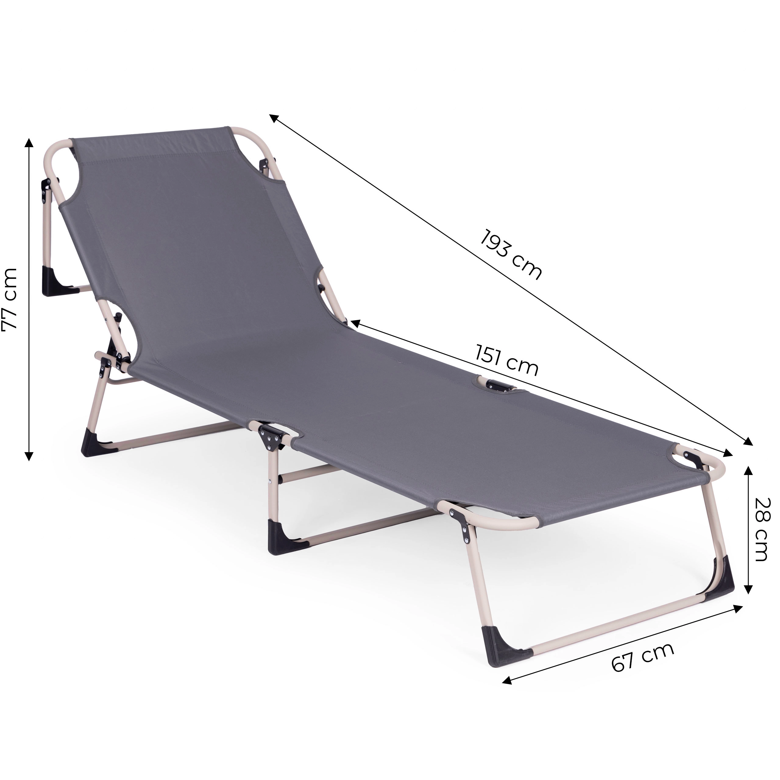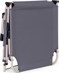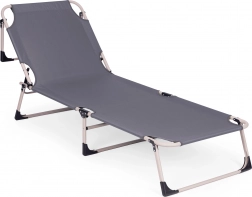 Naslon za hrbet zlahka nastavite v 4 položaje od polsede do povsem vodoravnega položaja. Nedrseči nastavki na nogah povečajo varnost na različnih podlagah. Zahvaljujoč zložljivi konstrukciji ležalnik hitro zložite na kompaktne mere in ga brez napora prenesete.