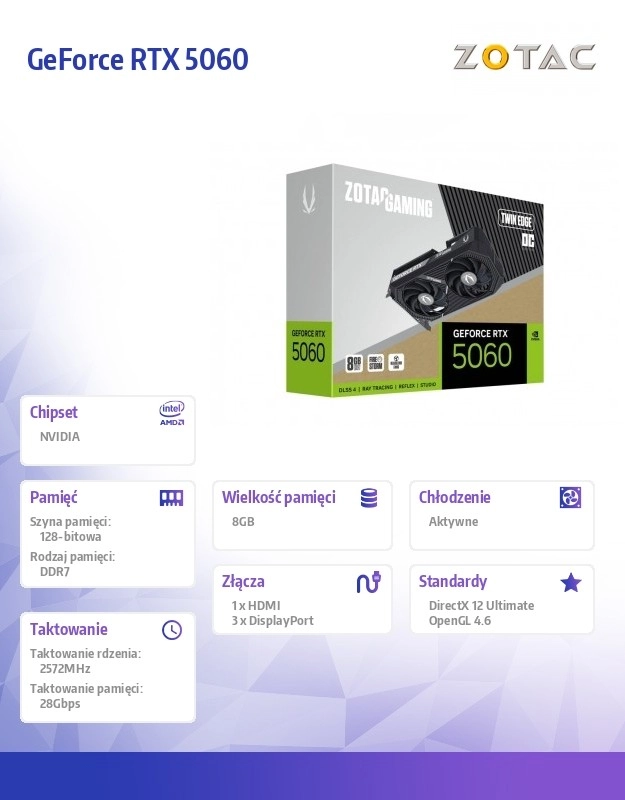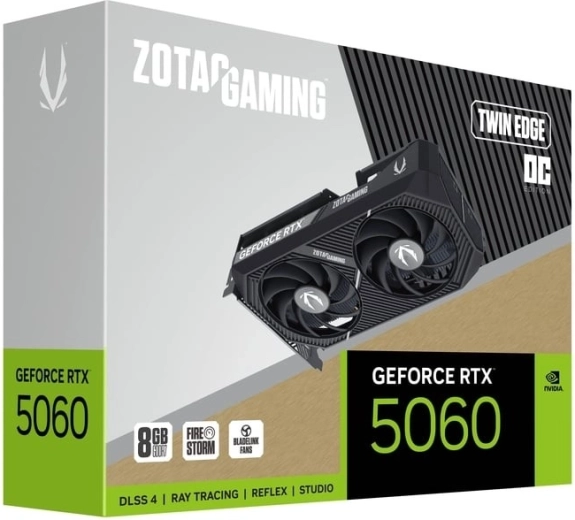 Uživajte v tekočem igranju in AI-pospeševanju s kartico ZOTAC GAMING GeForce RTX 5060 Twin Edge OC. Moderna arhitektura NVIDIA Blackwell, napredne enote za sledenje žarkom (ray tracing) in tehnologija DLSS 4 prinašajo visoke FPS tudi v visokih ločljivostih, medtem ko hiter pomnilnik GDDR7 zagotavlja bliskovito nalaganje tekstur in stabilno zmogljivost.
