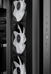 Prednameščeni ventilatorji s 16 ARGB LED v rotorju, PWM nadzorom in obrnjenimi lopaticami na bočni strani za estetski videz in odličen pretok zraka.