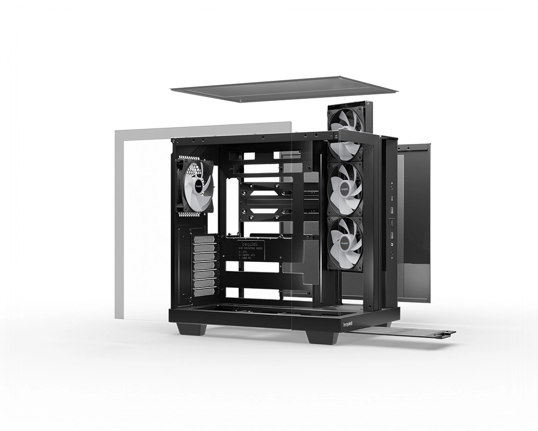 Prostorno zasnovana notranjost sprejme radiator do 360 mm, ATX osnovno ploščo in GPU do približno 400 mm. Pametni nosilci za diske omogočajo hkratno namestitev 1× HDD in 2× SSD brez omejevanja prostora za pladnjem. Dva možna položaja napajalnika olajšata sestavo s ploščami z zadnjimi konektorji (ASUS BTF, MSI Project Zero, Gigabyte Project Stealth). Prašni filtri ob strani in na dnu zagotavljajo enostavno vzdrževanje in čist zrak v ohišju.