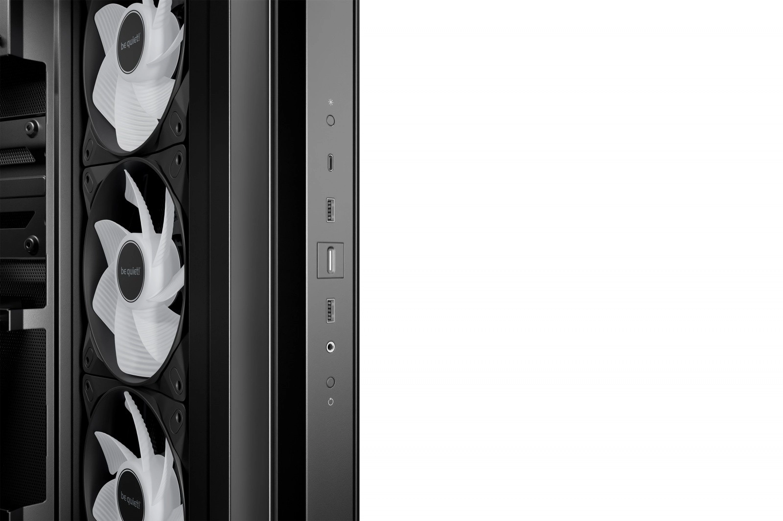 Štirje Light Wings LX 120 mm PWM (zadnji + stranski z obrnjenimi lopaticami) zagotavljajo visok pretok zraka in impresivno ARGB osvetlitev s 16 LED v pestu rotorja. Integriran ARGB gumb na I/O panelu ponuja vnaprej nastavljene efekte in barve, priloženi 6-kanalni ARGB/PWM hub pa pušča še 4 proste priključke za dodatne naprave.