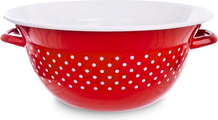 Emajlirana skleda z ročaji v priljubljenem retro slogu je odlična za gnetenje testa, mešanje sestavin in pripravo solat. Odporno jeklo s kakovostno emajlirano plastjo je higiensko, nevtralnega okusa in varno za vsakodnevni stik z živili. Elegantna rdeča izvedba z belimi pikami polepša vsako kuhinjo in jedilno mizo.