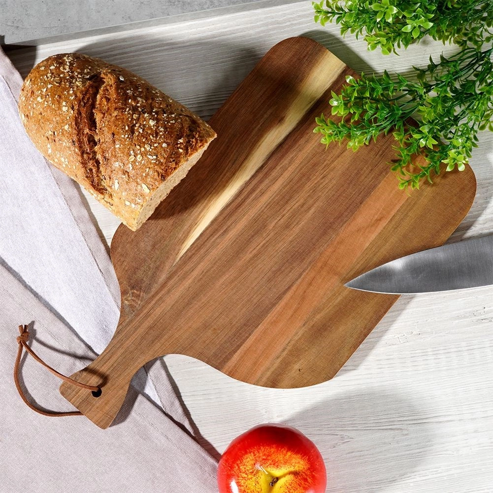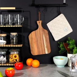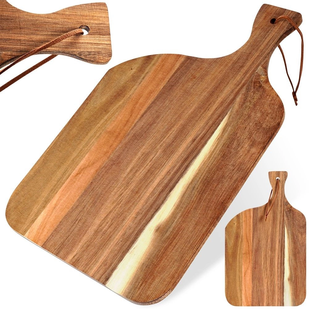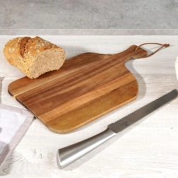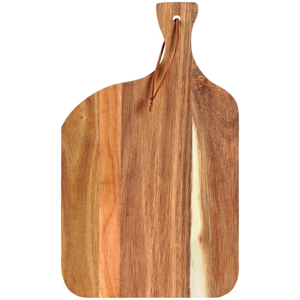 Univerzalna deska iz kakovostnega akacijevega lesa je praktičen pomočnik v vsaki kuhinji. Odlikujejo jo lepa struktura lesa, udoben oprijem in odprtina z usnjeno zanko za enostavno obešanje. Odlično služi za rezanje mesa, zelenjave in sadja ter serviranje sirov in predjedi.