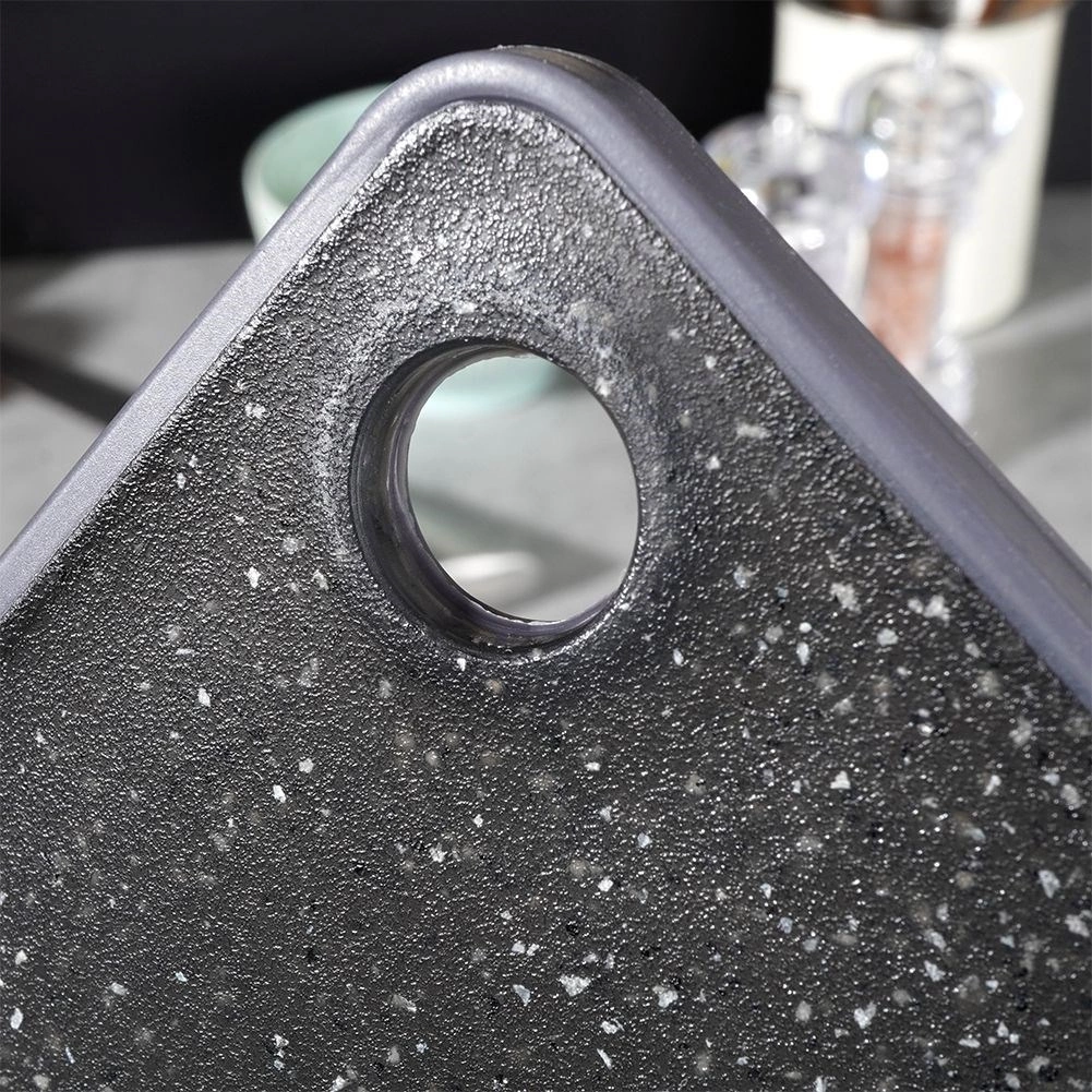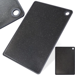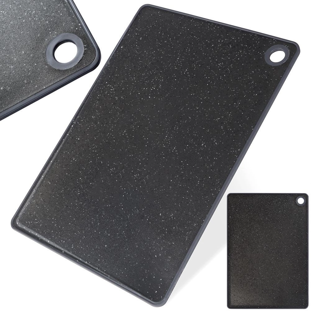 Vzdržljiva kuhinjska deska iz plastike v črnem granitnem videzu za vsakodnevno rezanje. Mere: 33 × 23 cm, debelina 0,5 cm, proti zdrsu obroba, utor za sokove in odprtina za obešanje. Je higienska, ne prevzema vonjav, ščiti delovno površino in jo je mogoče pomivati v pomivalnem stroju.