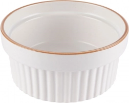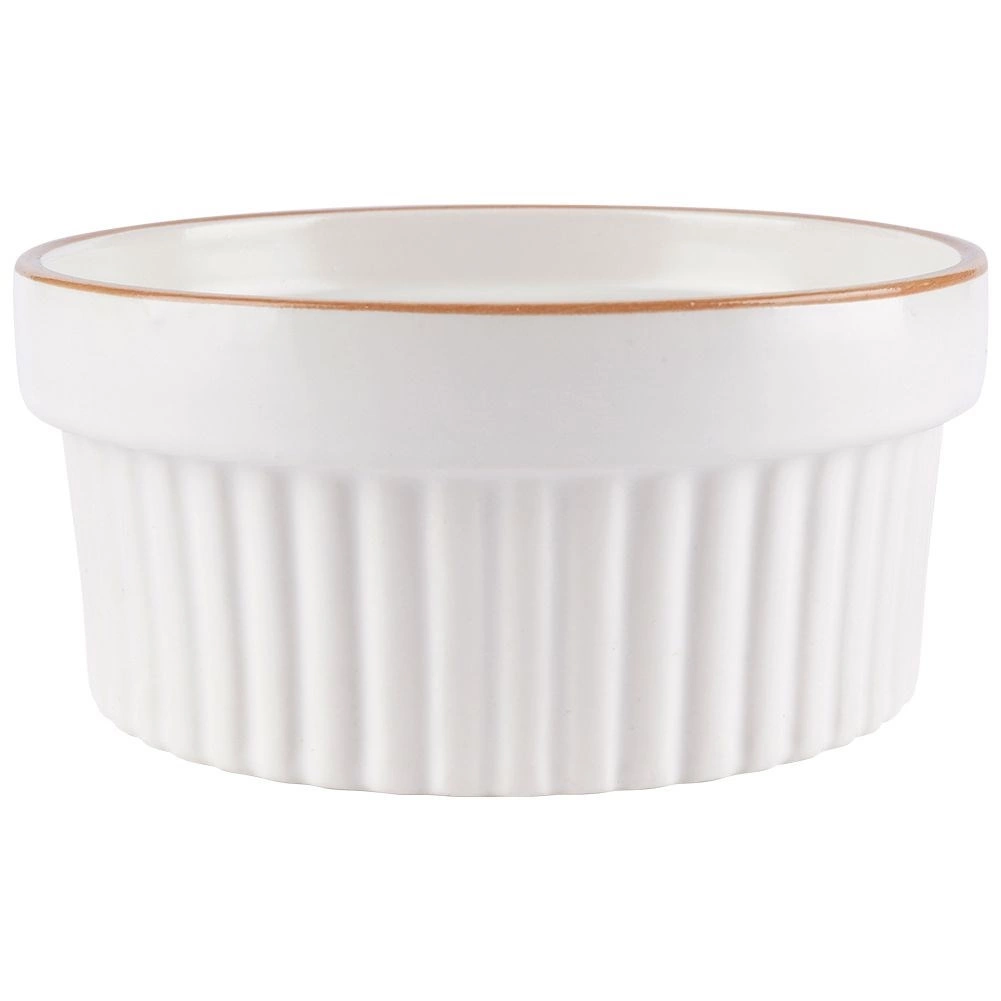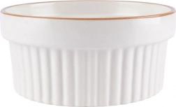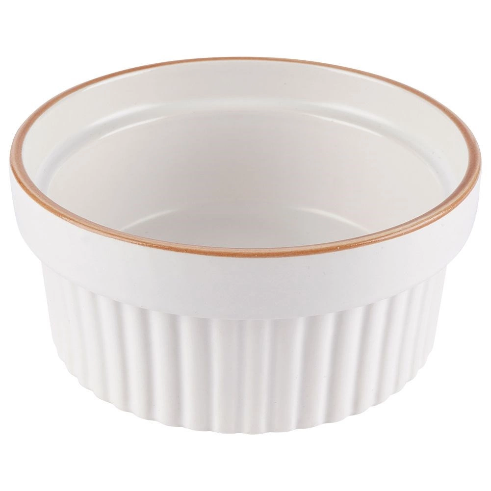 Bele porcelanaste ramekine z nežnim bež robom in navpičnim rebrastim vzorcem dajejo vašim sladicam in slanim jedem profesionalen videz.