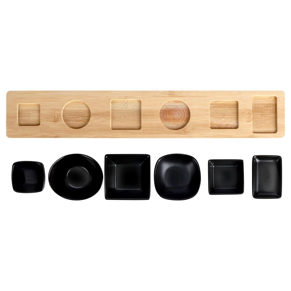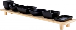 Ta dizajnerski komplet združuje praktičnost in estetiko pri vsakodnevnem serviranju. Šest keramičnih skledic v črni barvi dopolnjuje čvrst bambusov podstavek na nogicah, ki vse pregledno organizira in elegantno dvigne nad mizo. Zahvaljujoč natančno oblikovanim izrezom sklede ostanejo na svojem mestu tudi med prenašanjem.