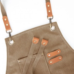 Premišljena zasnova z navzkrižnimi naramnicami na hrbtu enakomerno porazdeli težo in drži predpasnik varno na mestu. Sprednji dvojni žep in manjši predalček sprejmeta kuhinjske ali delovne drobnarije, medtem ko sta dve zanki idealni za svinčnik ali orodje.