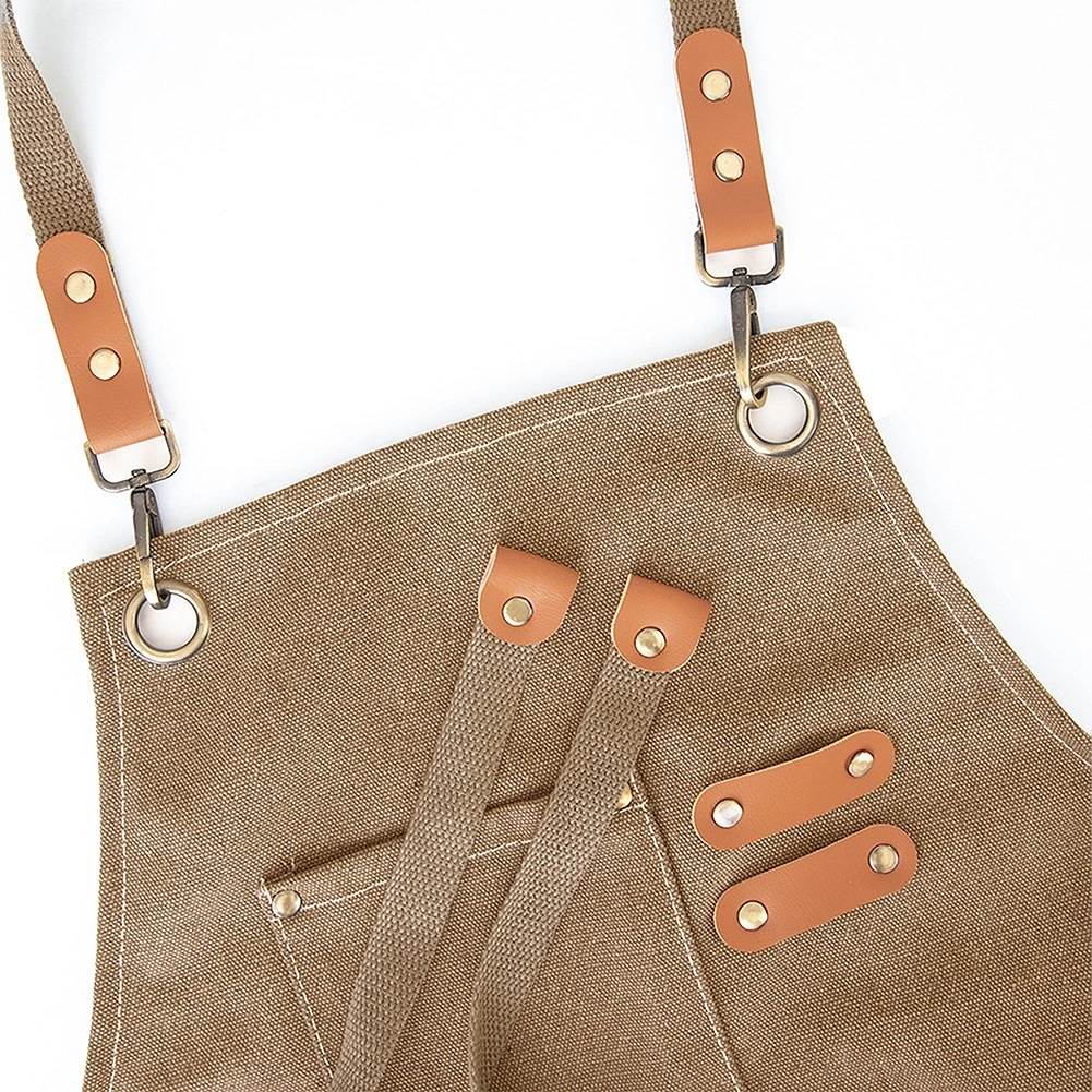 Močno platno z ojačanim šivom, kovinska očesca in detajli iz umetnega usnja za dolgo življenjsko dobo v kuhinji in delavnici.