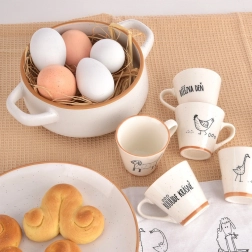 Vzdržljiva keramika v beli barvi z rjavim robom in pikčasto površino se lepo poda na vsako mizo.