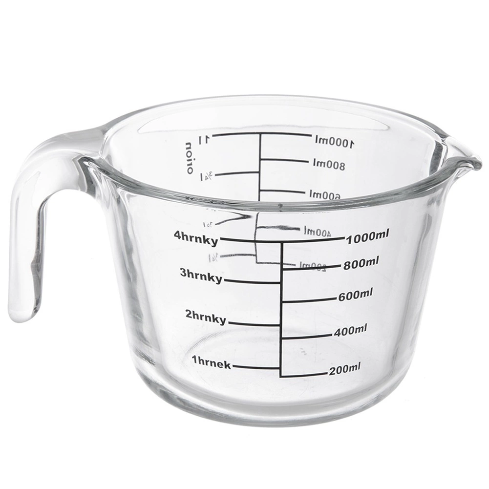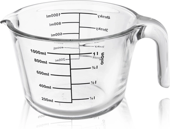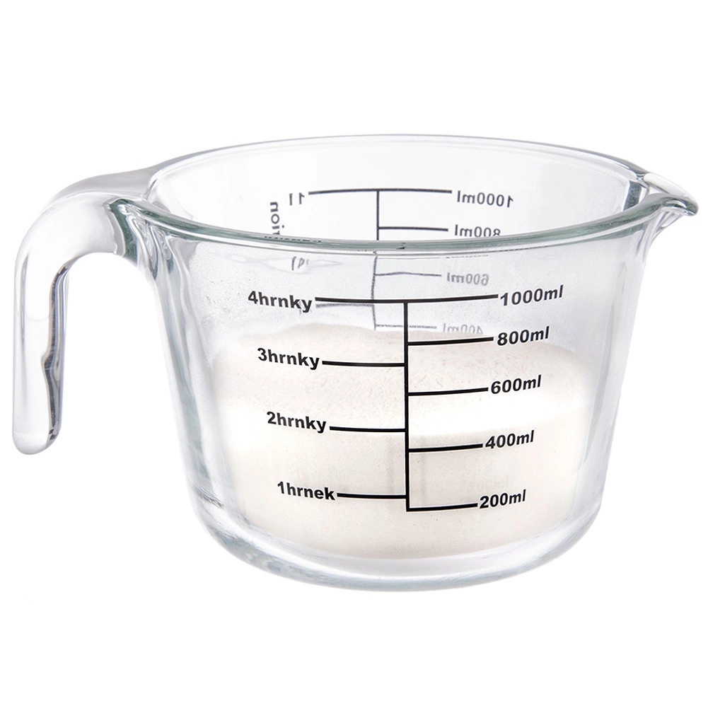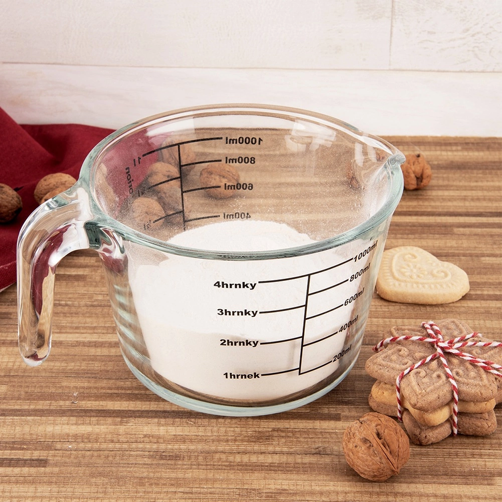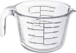 Merilna posoda meri v mililitrih od 200 do 1000 ml (na 200 ml), v litrih od 1/4 l do 1 l in v skodelicah od 1 do 4. Odporno borosilikatno steklo prenese ekstremne temperaturne razlike, zato lahko merilno posodo postavite v hladilnik, mikrovalovko in pečico.