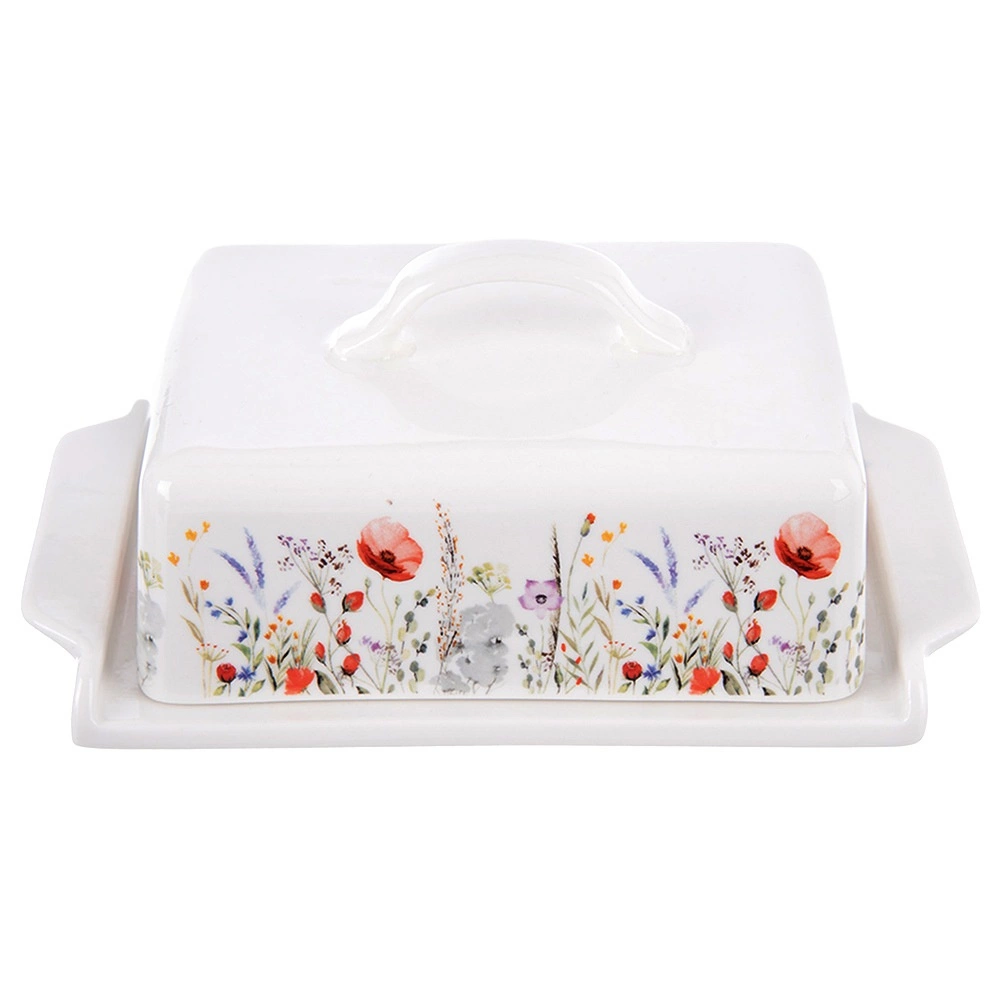 Porcelanasta posoda za maslo z nežnim dekorjem makov in travniških cvetov je zasnovana za shranjevanje in postrežbo masla. Pokrov s praktičnim ročajem ščiti maslo pred vonjavami iz hladilnika in pomaga ohraniti njegovo svežino in poln okus. Časovno neodvisna, klasična oblika se lepo poda vsaki kuhinji in se ujema z različnimi vrstami namiznih kompletov.