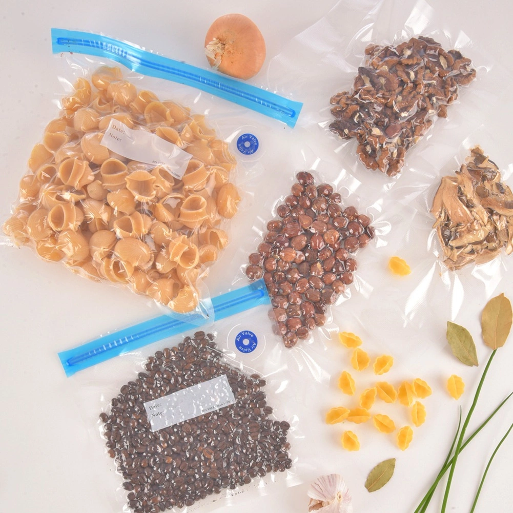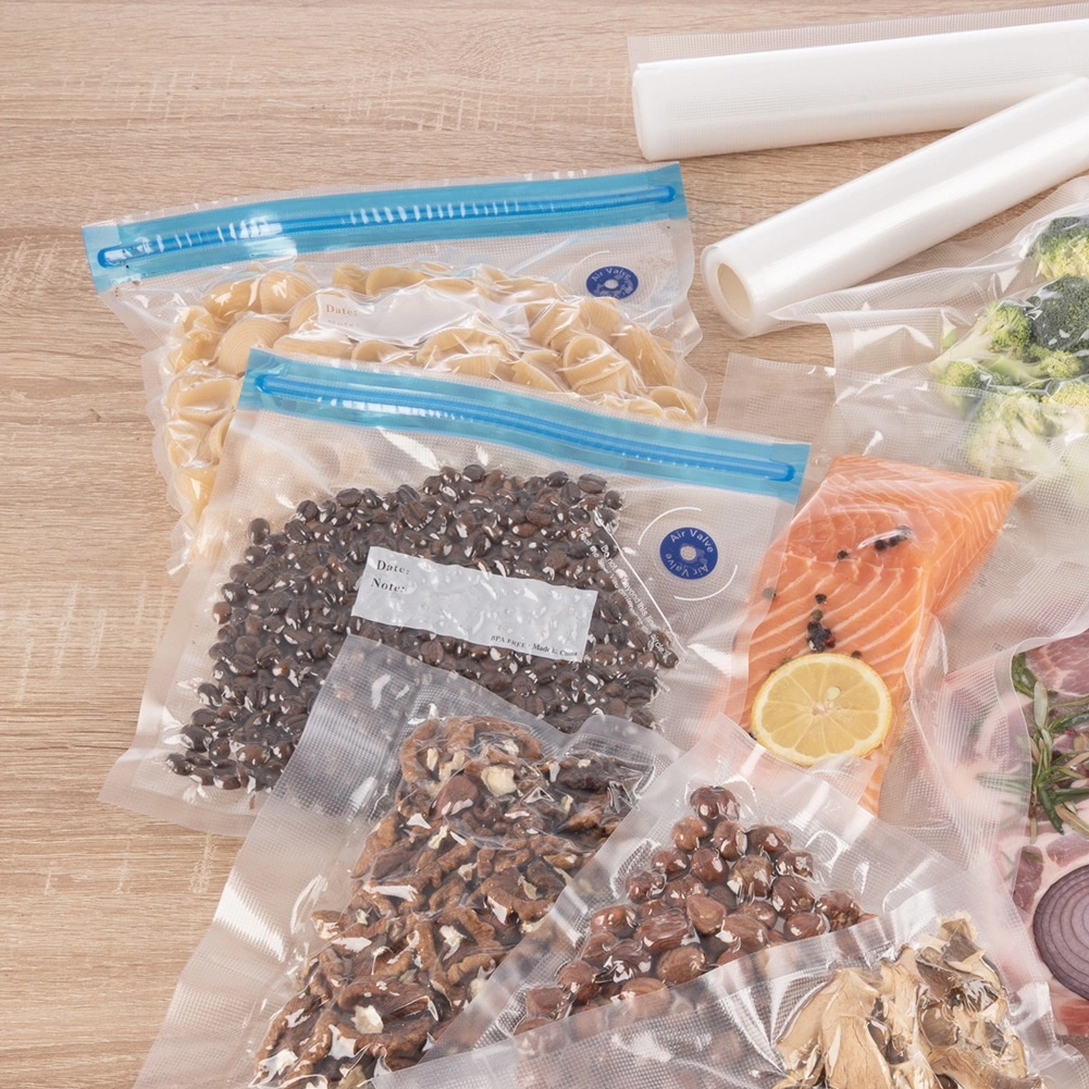 Ohranite živila dlje sveža in pregledno organizirana. Vakuumske vrečke s praktično zadrgo in enosmernim ventilom omogočajo hitro izsesavanje zraka in zanesljivo zapiranje. Ena stran je gladka, druga ima strukturirano površino za enakomerno izsesavanje.