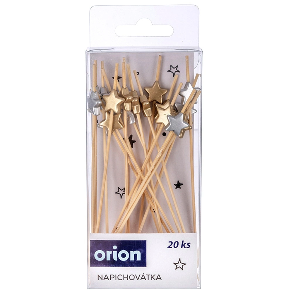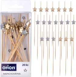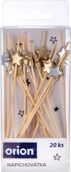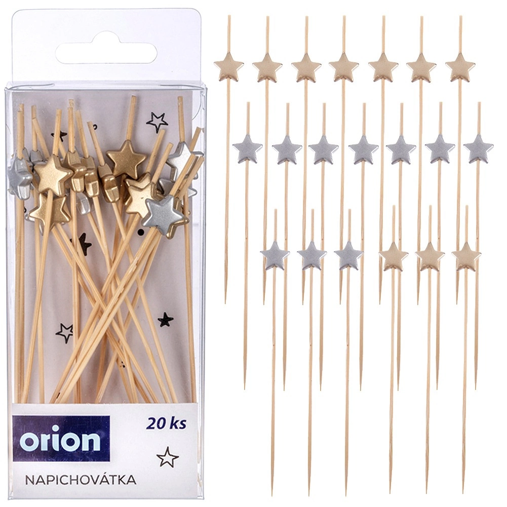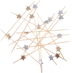 Popestrite serviranje prigrizkov z dekorativnimi palčkami z zvezdicami. Naravni bambus v kombinaciji z lesenim okraskom v zlatem in srebrnem videzu poskrbi za privlačno predstavitev in udobno nabadanje. Vsako pakiranje vsebuje 20 kosov v univerzalni dolžini 12 cm.