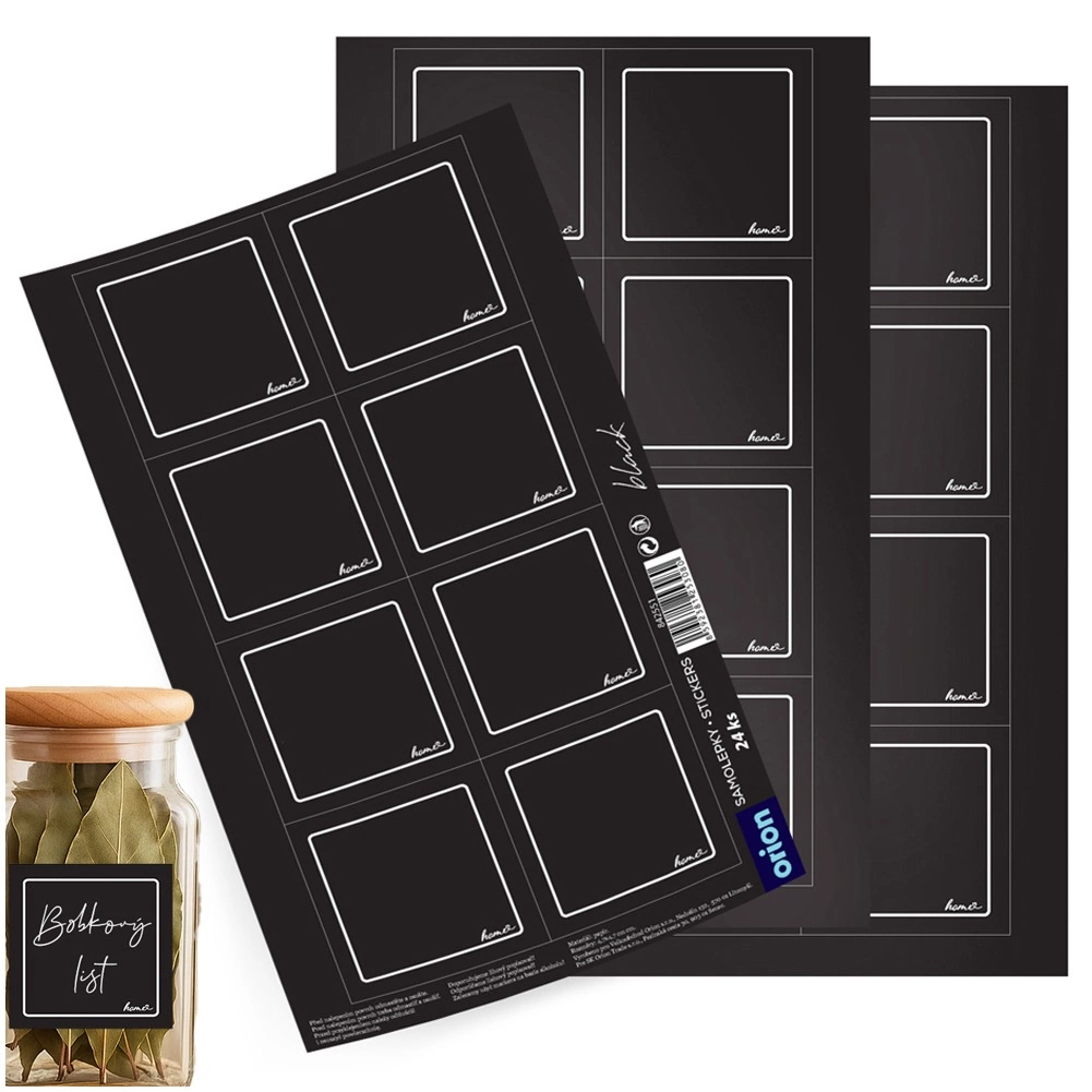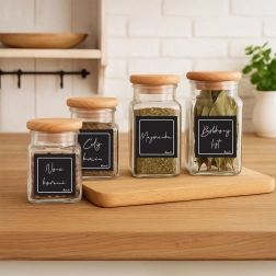 Ohranite red v shrambi s stilom. Črne samolepilne nalepke so primerne za domače vložnine, začimbe, sipka živila in tudi za darilno pakiranje. Laminirana površina je bolj odporna proti nečistočam, vsaka nalepka pa ponuja namenski prostor za naziv, sestavo ali datum.