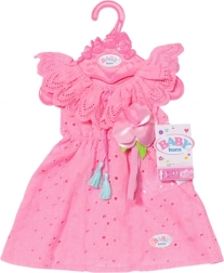 Obleka v rožnatem odtenku z nabranym ovratnikom, dekorativnimi vrvicami in resicami pričara nežen videz vsake punčke BABY born.