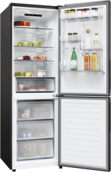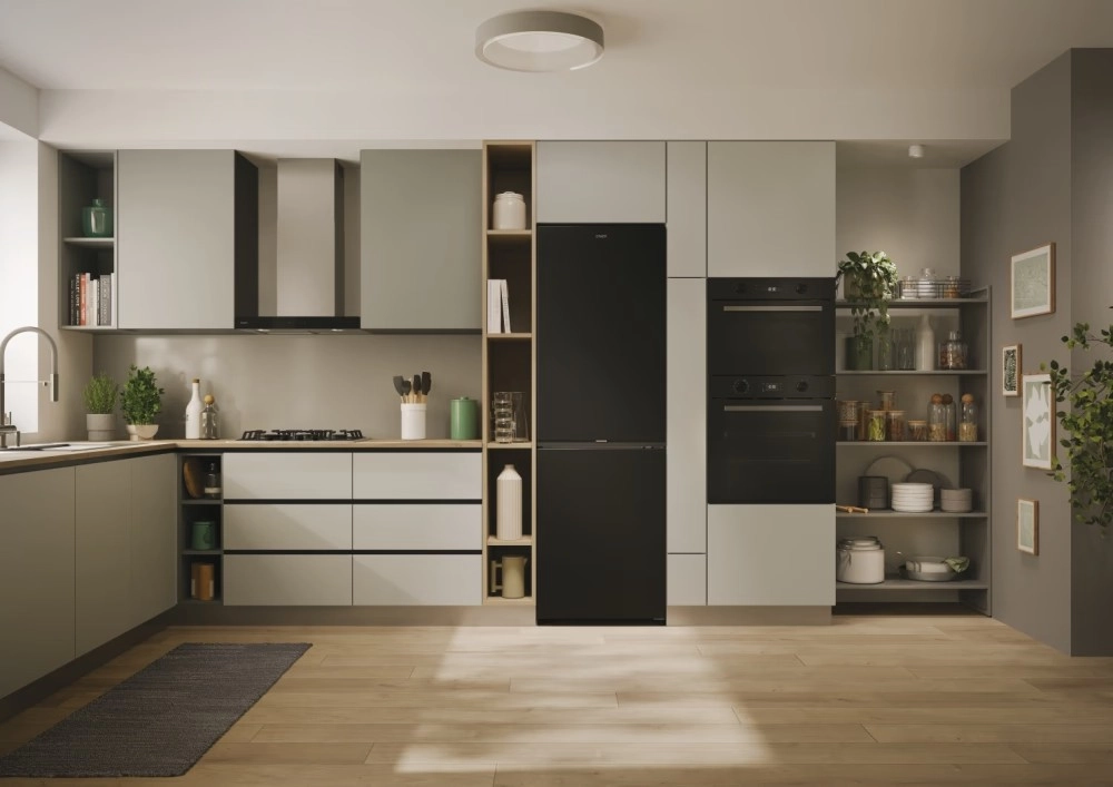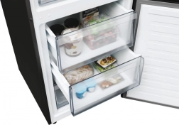 Ta prostostoječi hladilnik z zamrzovalnikom spodaj združuje eleganten črn dizajn s praktično notranjo razporeditvijo. Široke steklene police, po višini nastavljive vratne police in svetla LED osvetlitev zagotavljajo odličen pregled nad živili. Prosojni predali v zamrzovalniku olajšajo organizacijo in hitro iskanje shranjenih sestavin.