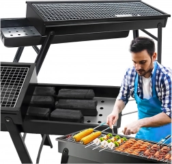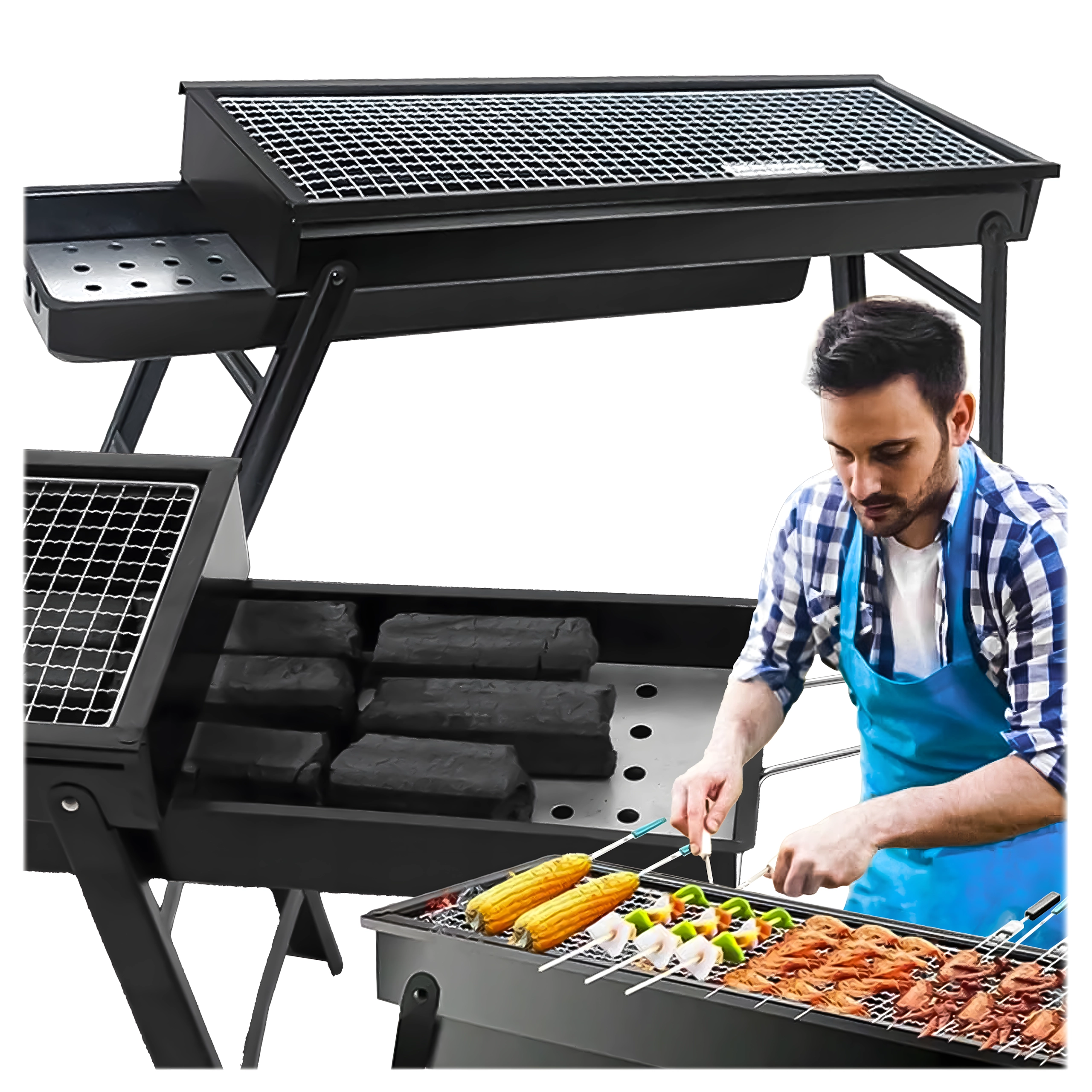 Ta prenosni zložljiv žar iz prašno lakiranega jekla v črni barvi je zasnovan za hitro in udobno peko v naravi, na vrtu ali terasi. Zaradi lahke konstrukcije in zložljivih nog ga v nekaj sekundah pripravite za uporabo, po peki pa ga preprosto pospravite ali odpeljete.