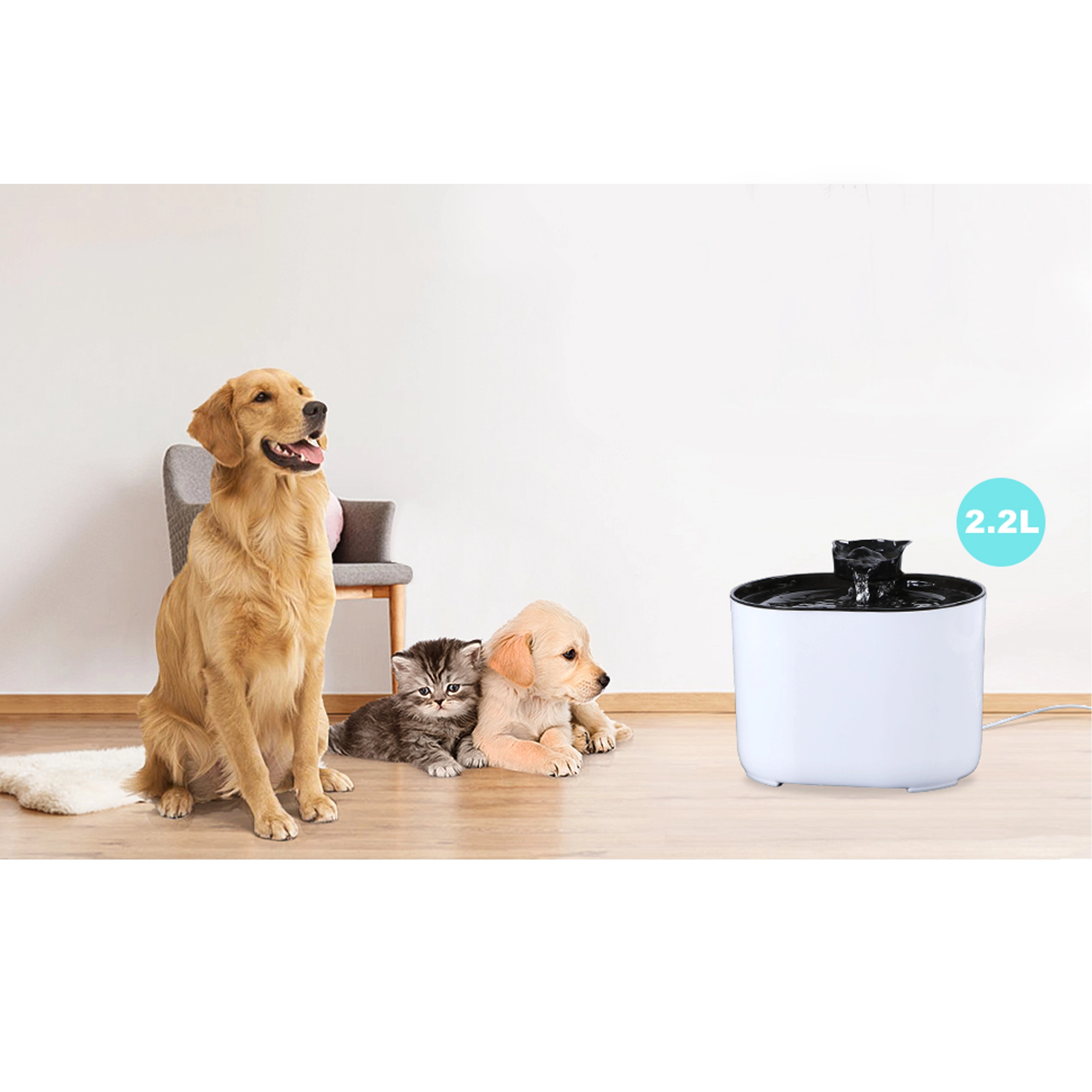 Ta moderna fontana za hišne ljubljenčke združuje tiho delovanje, cirkulacijo vode in učinkovito filtracijo, da je voda za vašega kosmatega prijatelja vedno sveža, čista in privlačna za pitje. Prostornina 2,2 l je idealna za mačke in male pse ter zmanjšuje potrebo po pogostem dolivanju.