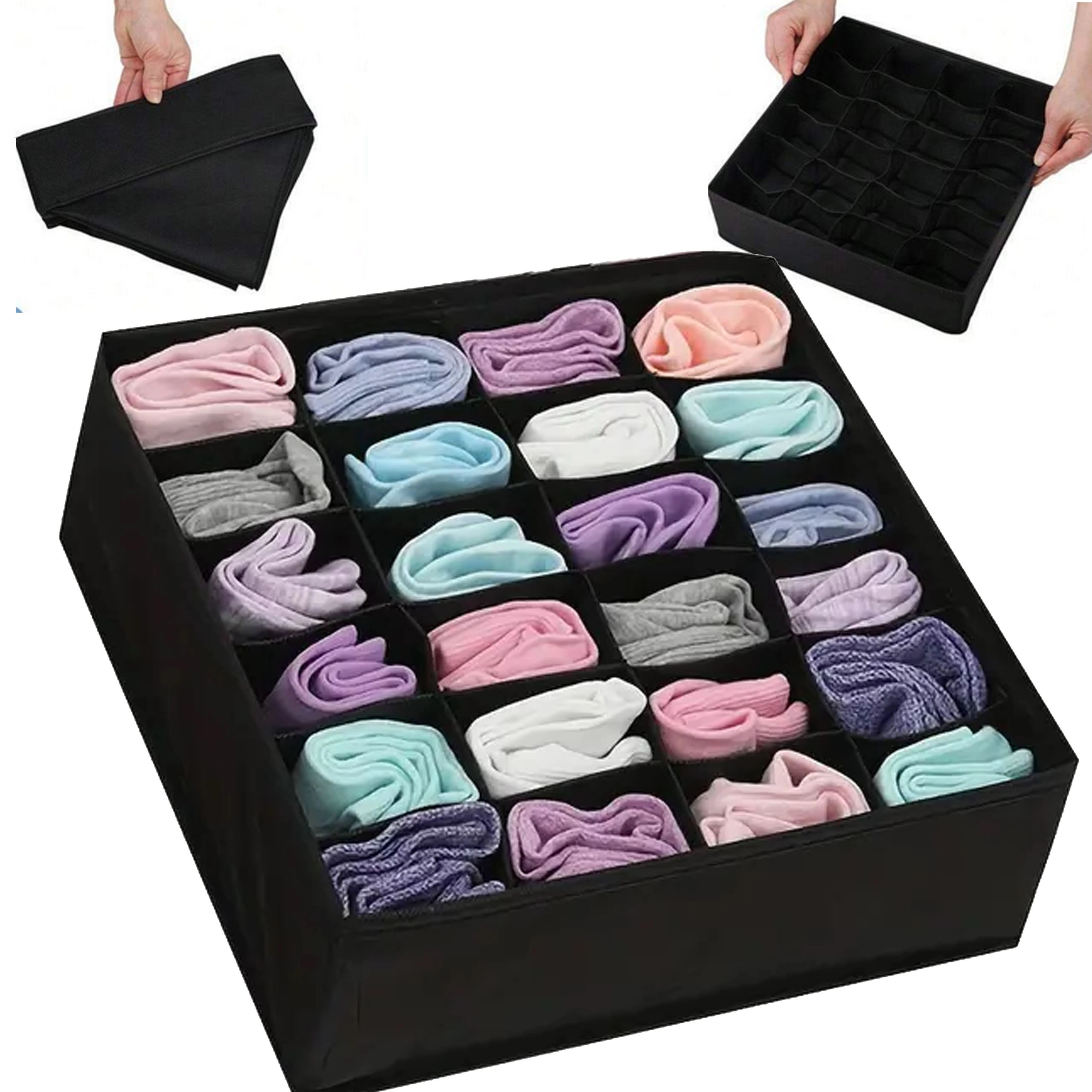 Praktičen organizator za predal pomaga ukrotiti nered v komodi in omari. Zaradi 24 samostojnih celic boste perilo zlahka razvrstili, vsak kos pa bo imel svoje mesto. Trdno ojačane stene držijo obliko in olajšajo rokovanje, medtem ko zračna netkana tkanina zagotavlja kroženje zraka.