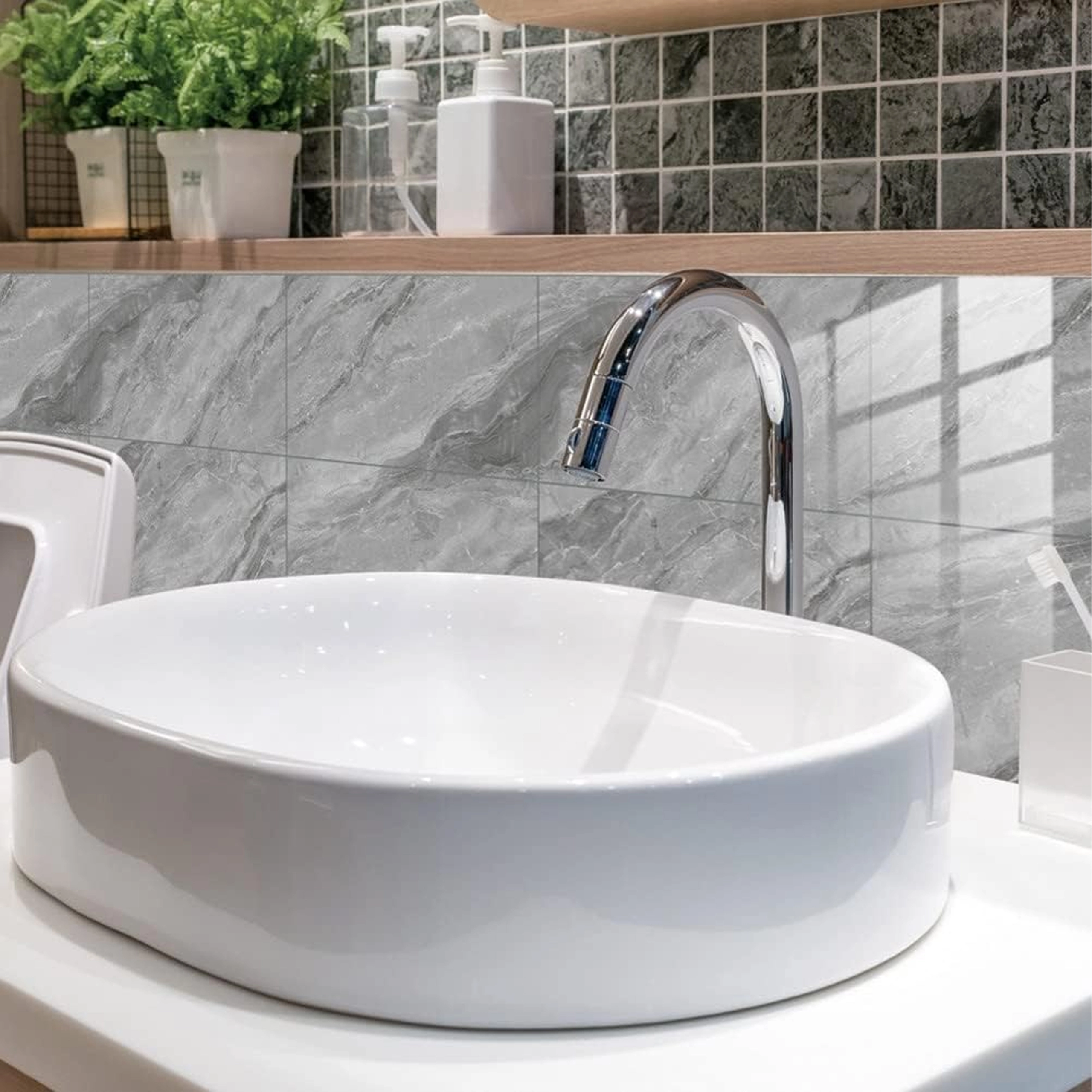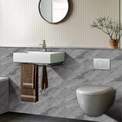 Sive marmorne žile dajejo stenam eleganten in brezčasen značaj brez drage obložniške izvedbe.