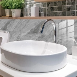 Sijoča površina z marmornim učinkom kljubuje vlagi v kopalnici in kuhinjskim kapljam. Vzdrževanje je stvar enega brisa.