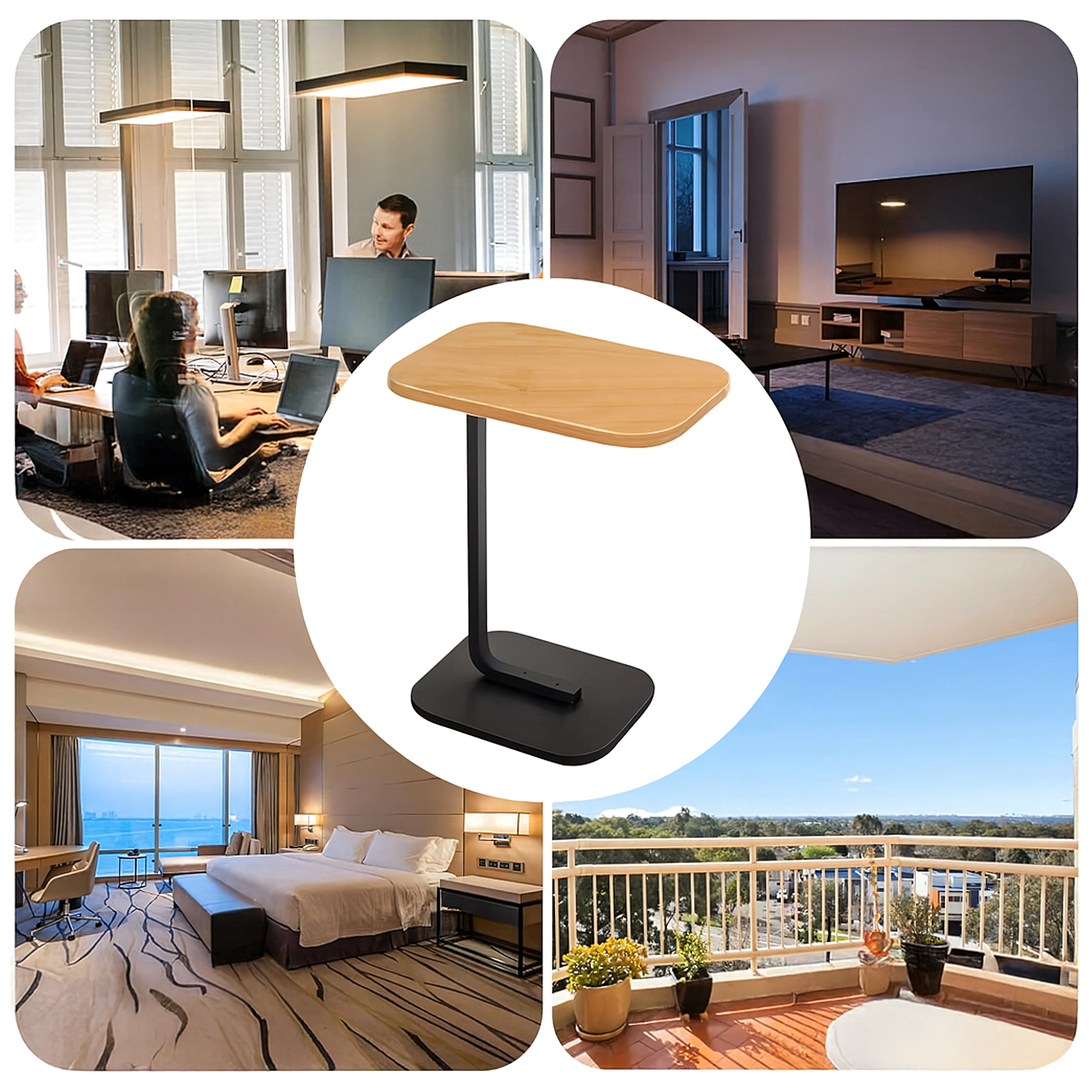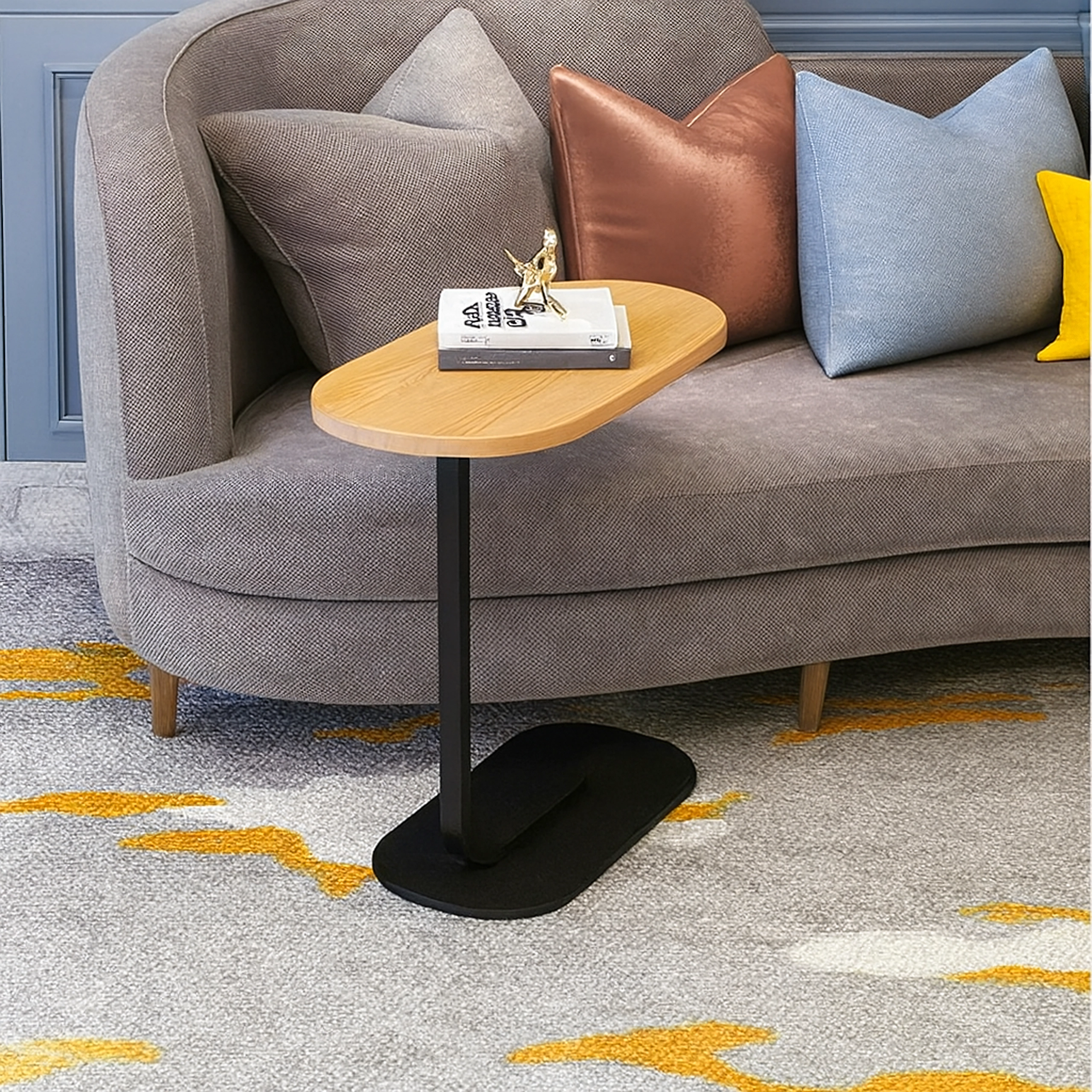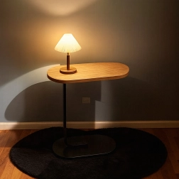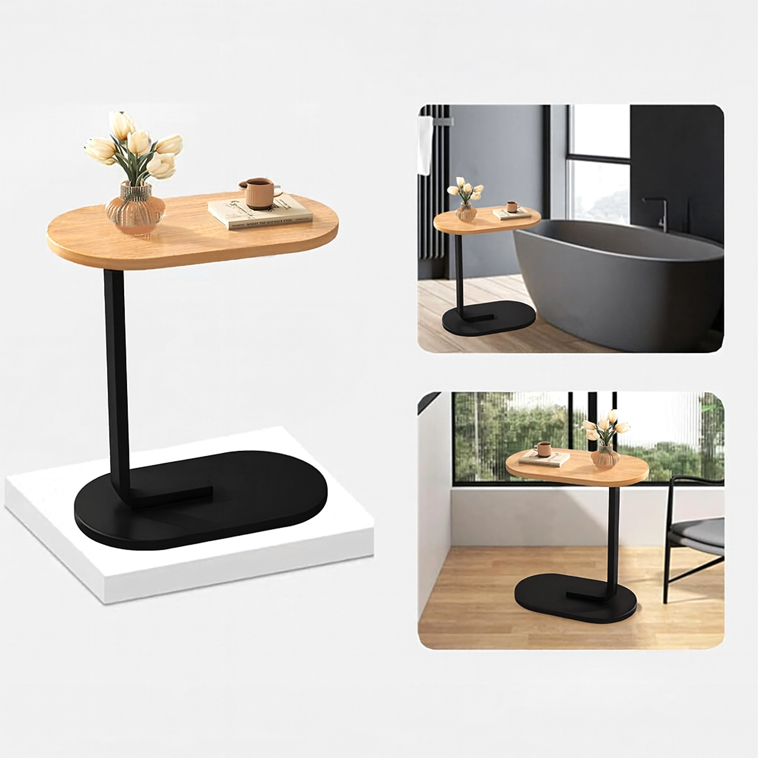 Elegantna mizica v obliki črke C združuje ploščo v svetlem lesnem dekorju z vzdržljivo črno kovinsko konstrukcijo. Idealna kot stranska mizica ob sedežni garnituri, nočna omarica ob postelji ali mobilna osnova za delo s prenosnikom. Zaradi ozke baze jo zlahka potisnete pod pohištvo in prihranite prostor.