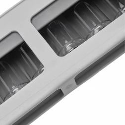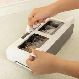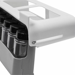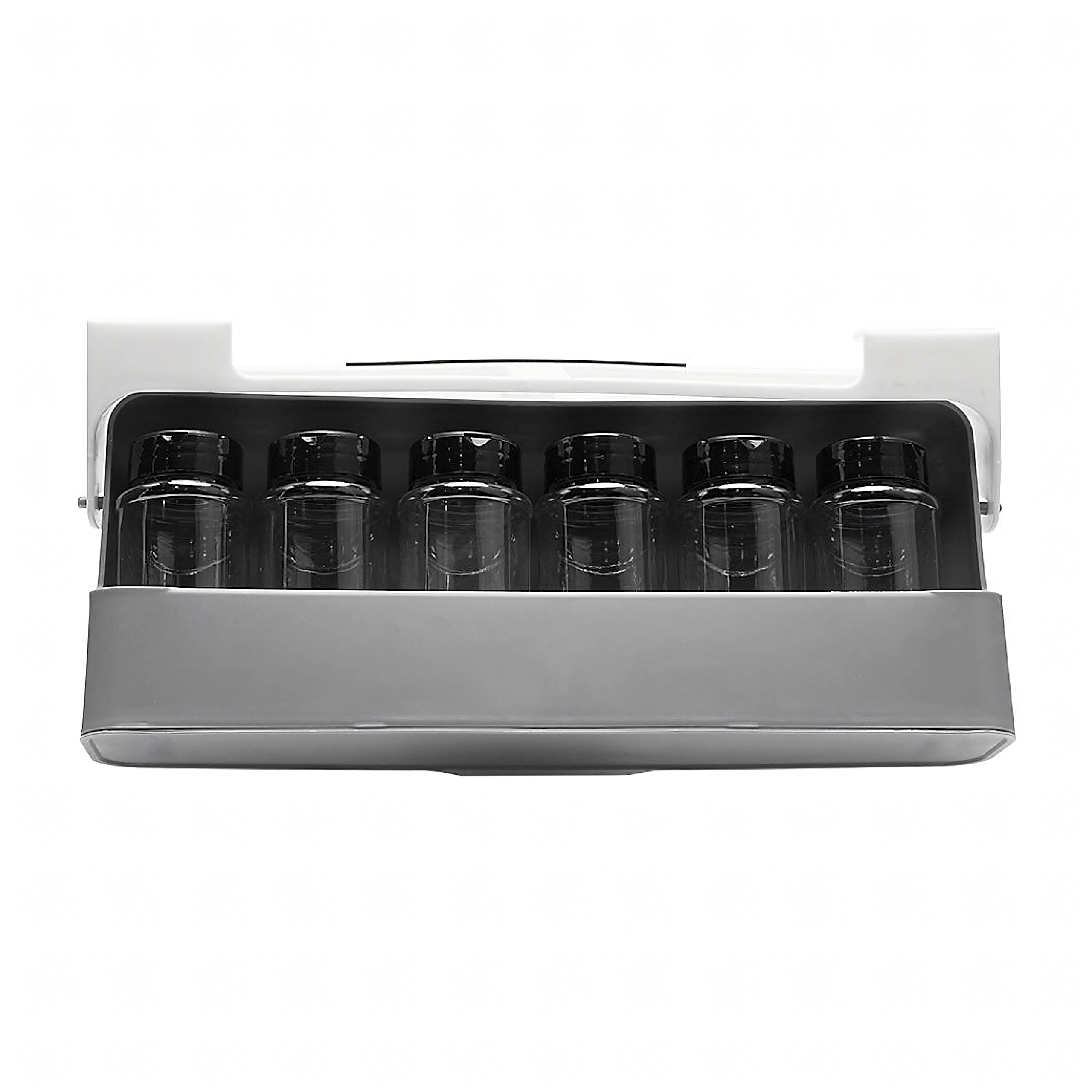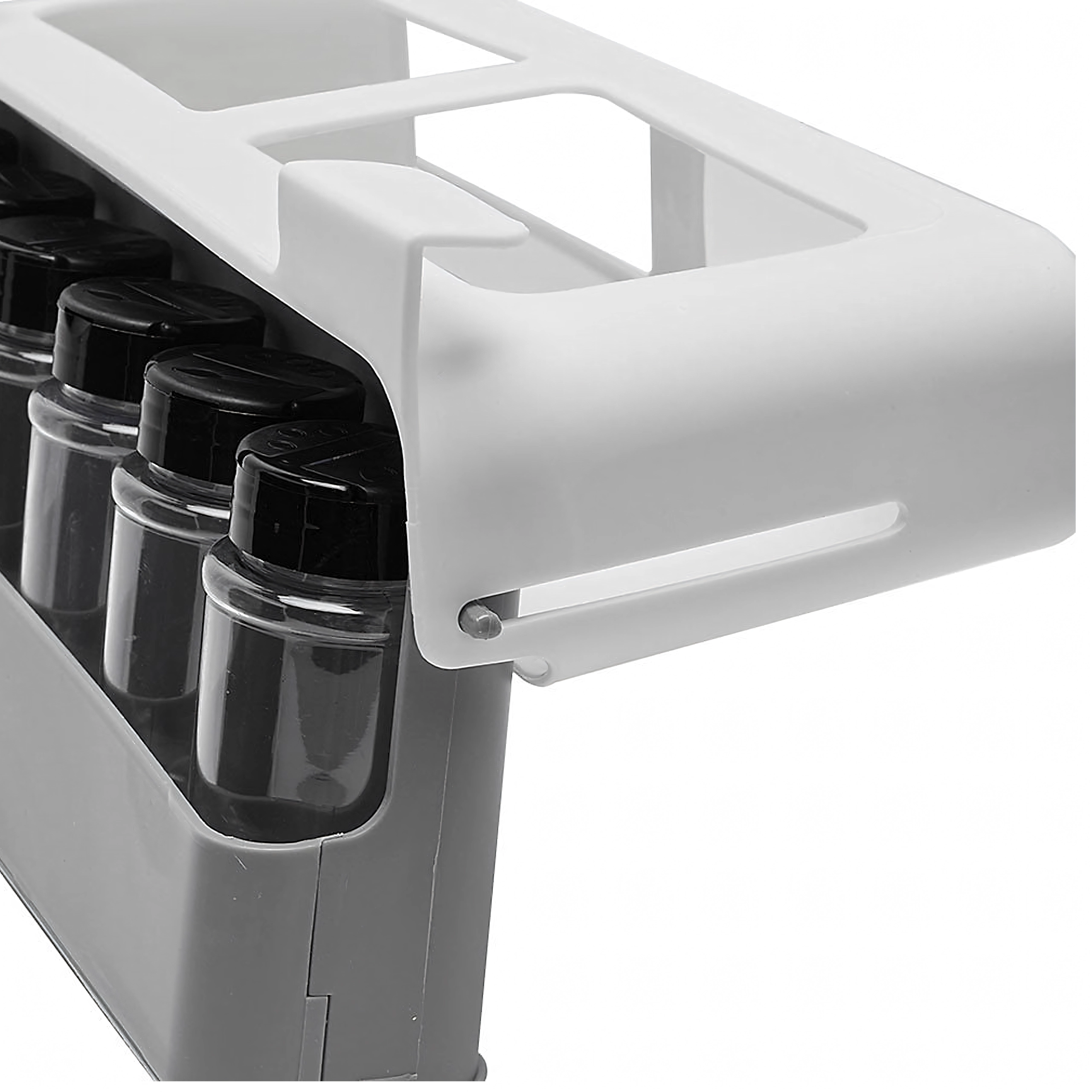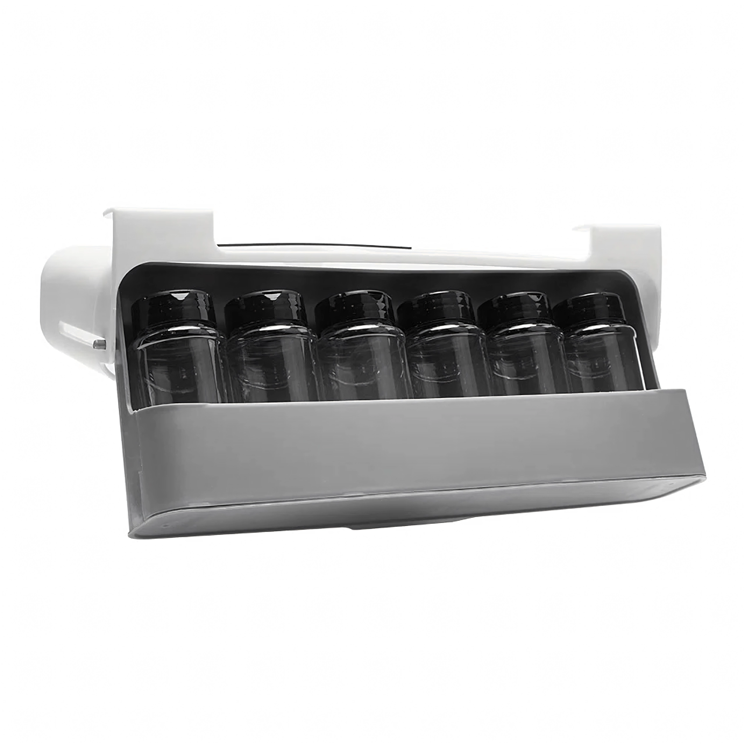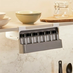 Šest prozornih steklenih doz s črnimi pokrovčki ohranja začimbe sveže in čiste. Minimalistično izvedbo v belo-sivi barvi lahko umestite v moderne in klasične kuhinje, hkrati pa učinkovito izkoristi prostor pod polico ali v omari.