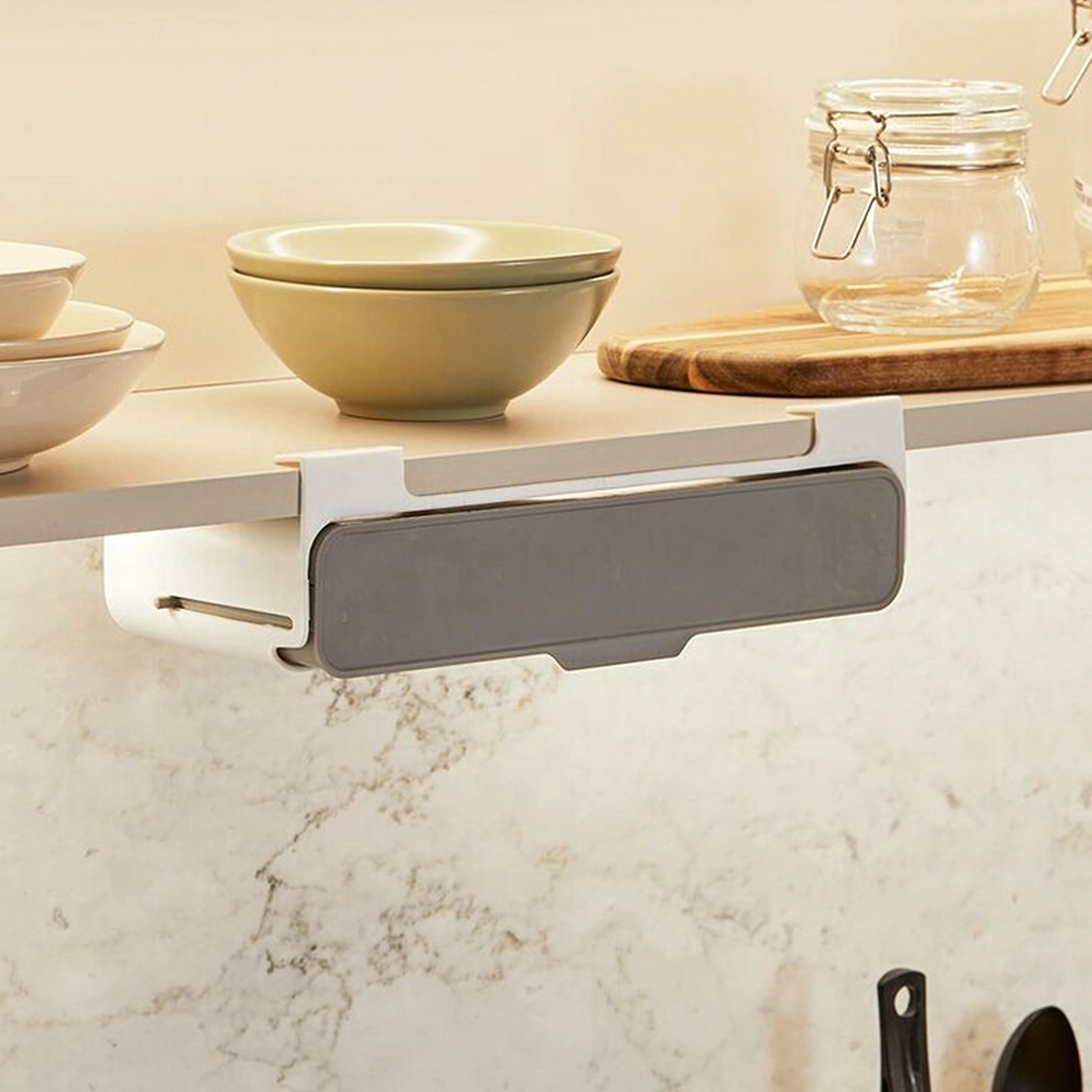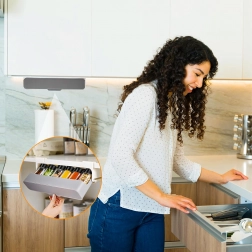 Močan samolepilni trak 3M trdno drži organizator pod polico ali v omari. Namestitev vzame le nekaj minut in ne zahteva orodja niti vrtanja.