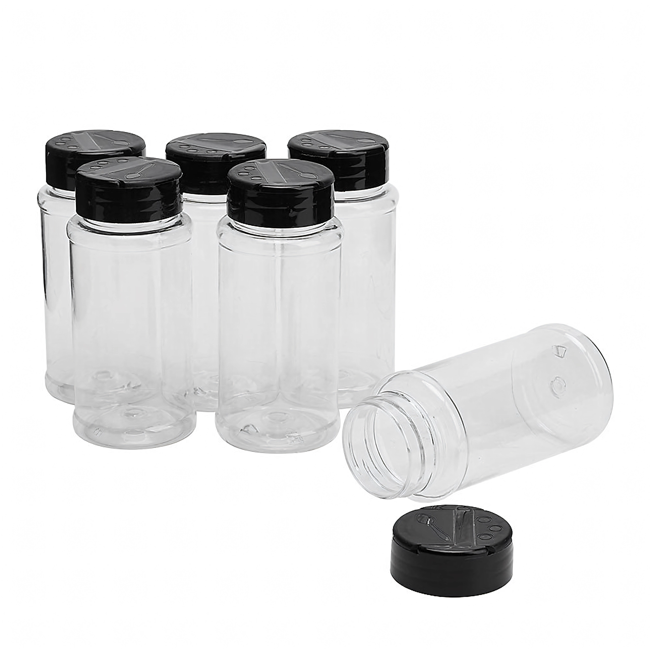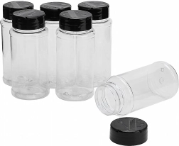 Set vključuje šest enotnih posodic za začimbe. Prosojne stene olajšajo prepoznavanje vsebine, pokrovčki pa ohranjajo svežino.