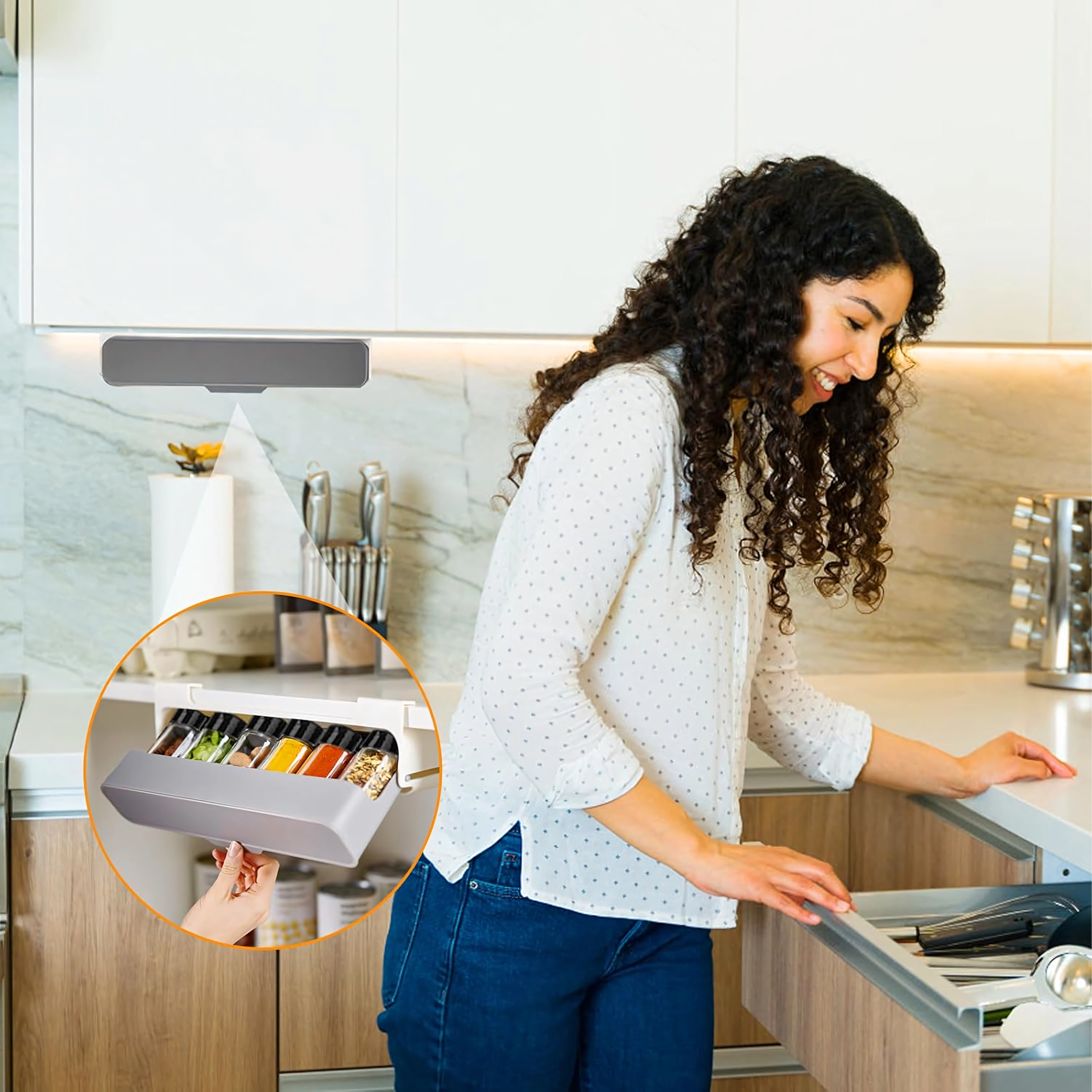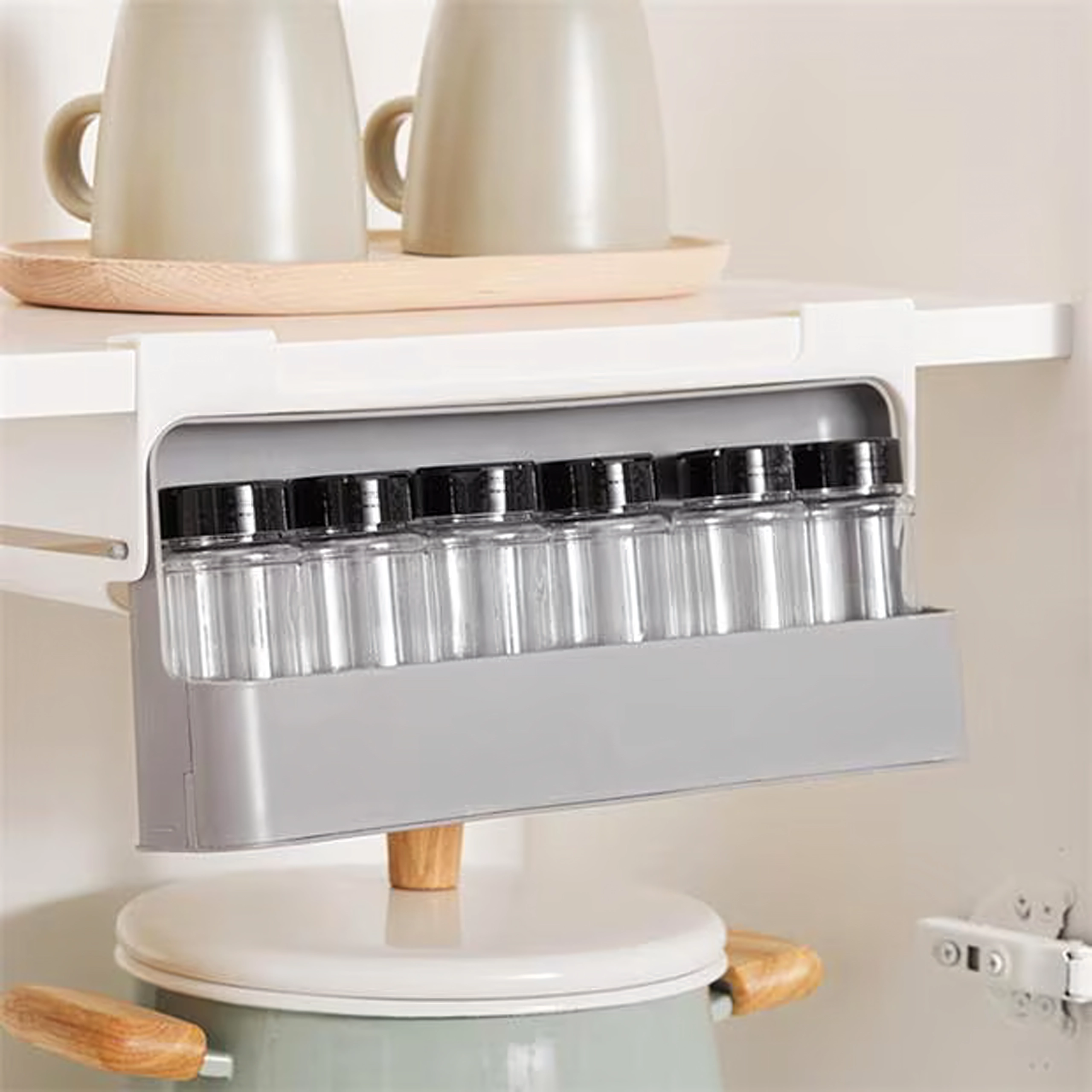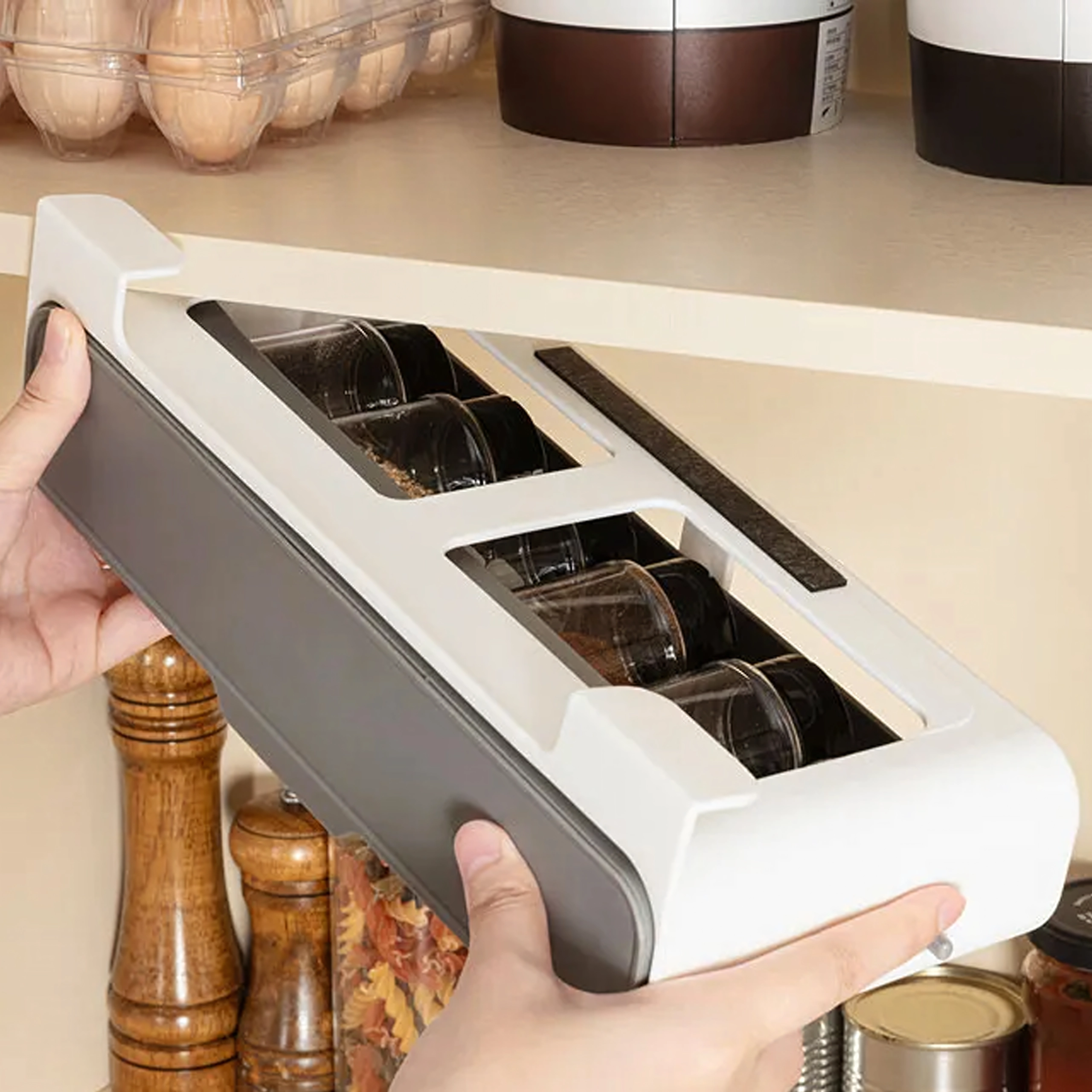 Praktičen viseči organizator za začimbe vam omogoča, da imate priljubljene začimbe vedno pri roki in hkrati sprostite delovno površino. Zahvaljujoč pregledni izvlečni konstrukciji enostavno potegnete letvico s kozarčki in takoj vidite, kar potrebujete. Samolepilna montaža s trakom 3M zagotovi trdno pritrditev brez vrtanja in brez poškodb pohištva.