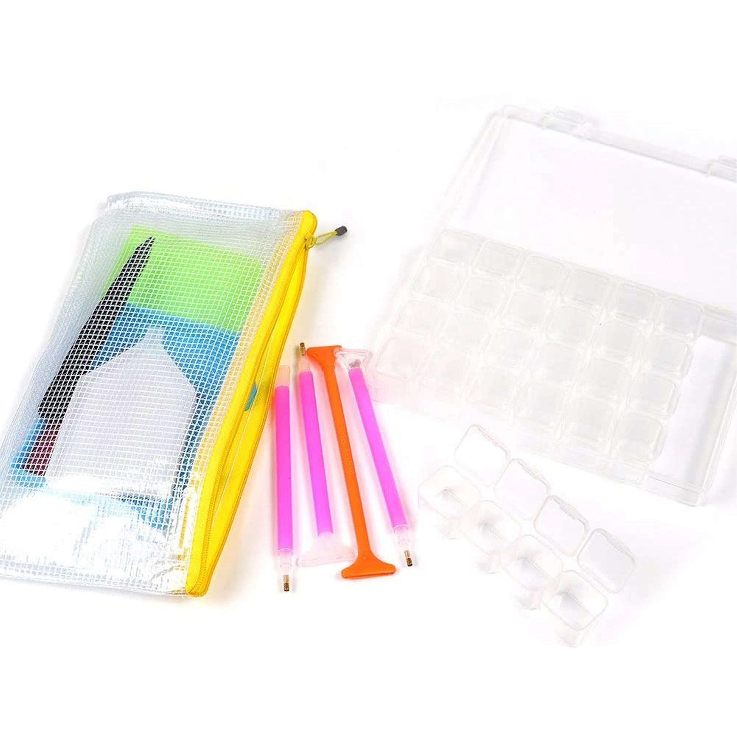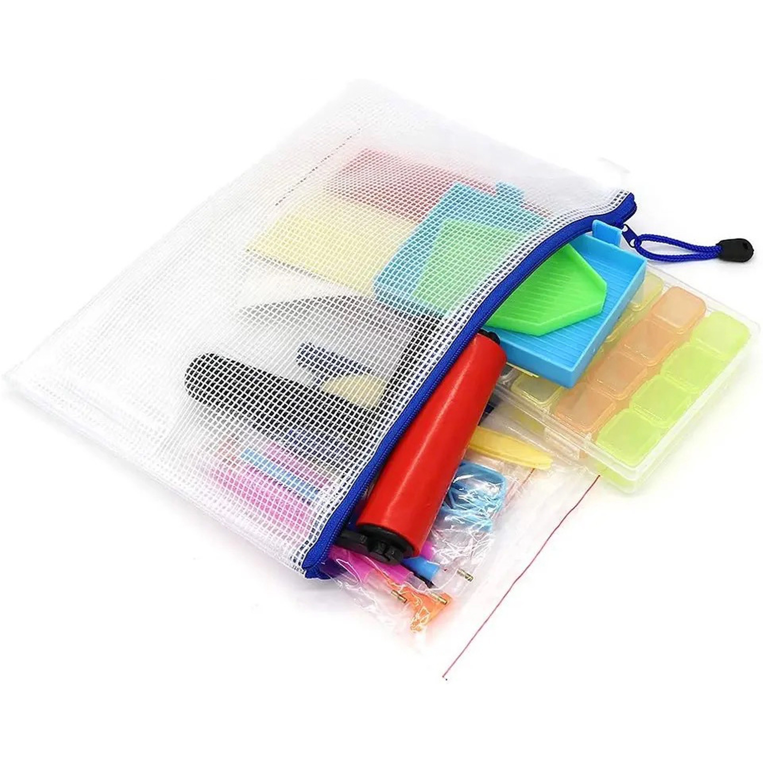 Prozorna mrežasta torbica z zadrgo in škatlica s predelki ohranjata vse pregledno in pripravljeno za ustvarjanje kjerkoli.