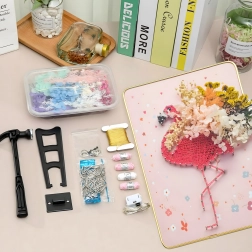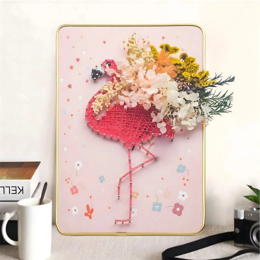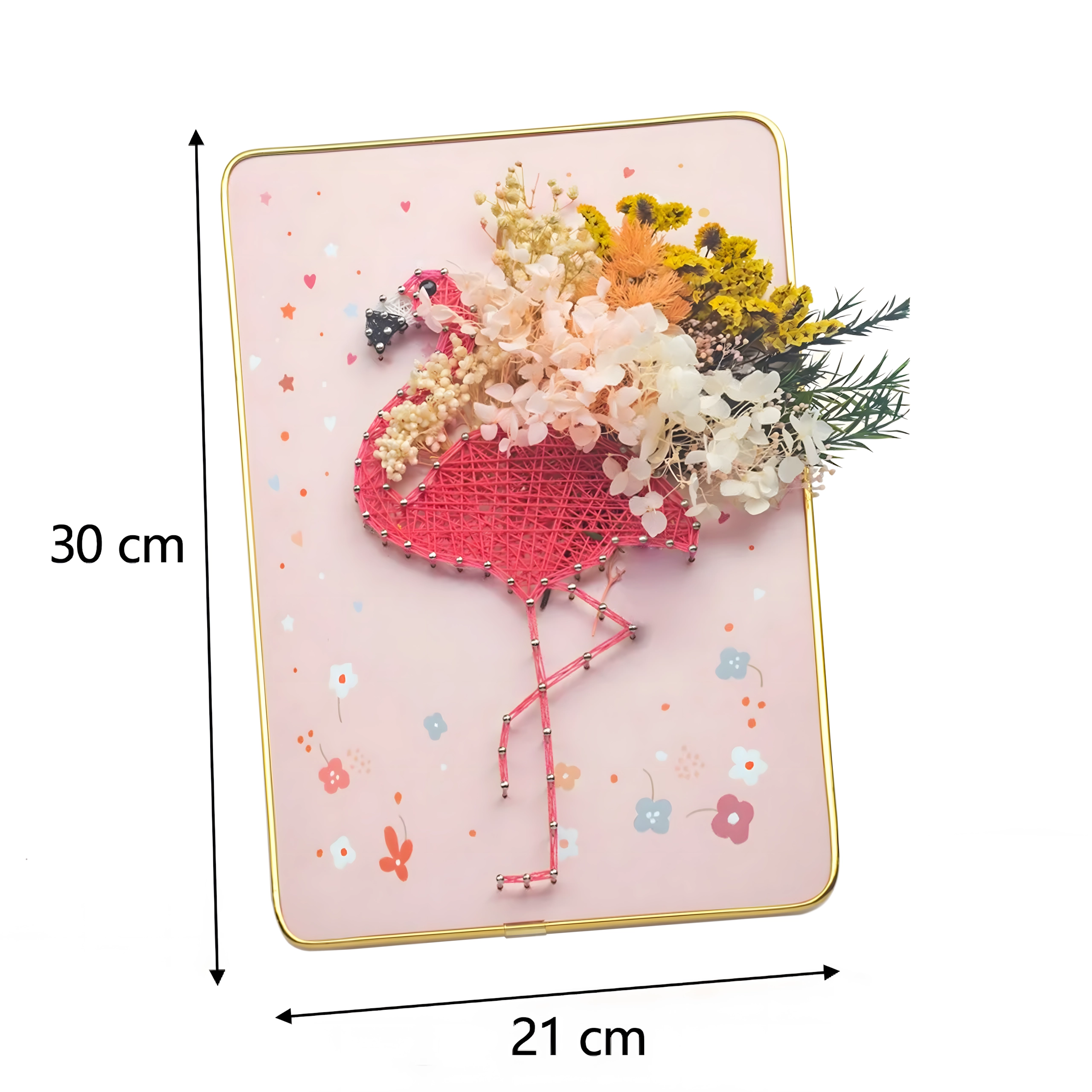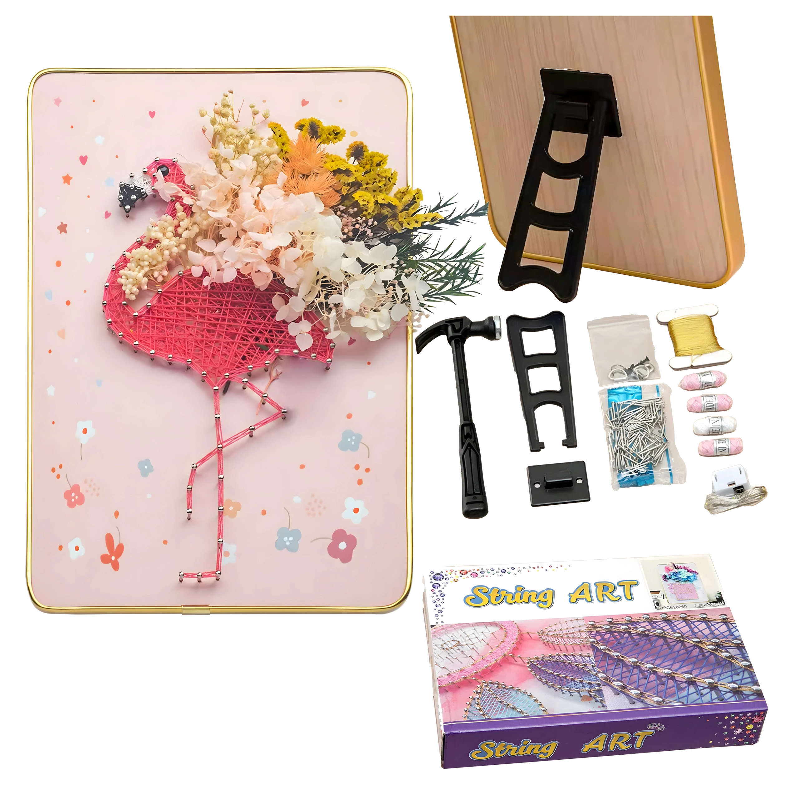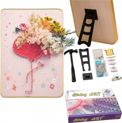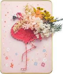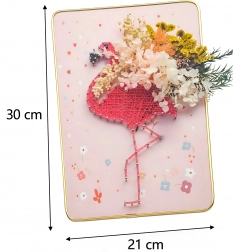 Ta kreativni komplet za string art (ovijanje niti okoli žebljičkov) vam omogoča, da preprosto ustvarite stilizirano sliko z motivom flaminga in cvetja. Končno sliko lahko obesite na steno ali postavite na polico. Integrirana LED osvetlitev bo motiv oživila in ga spremenila v privlačno svetlobno dekoracijo.