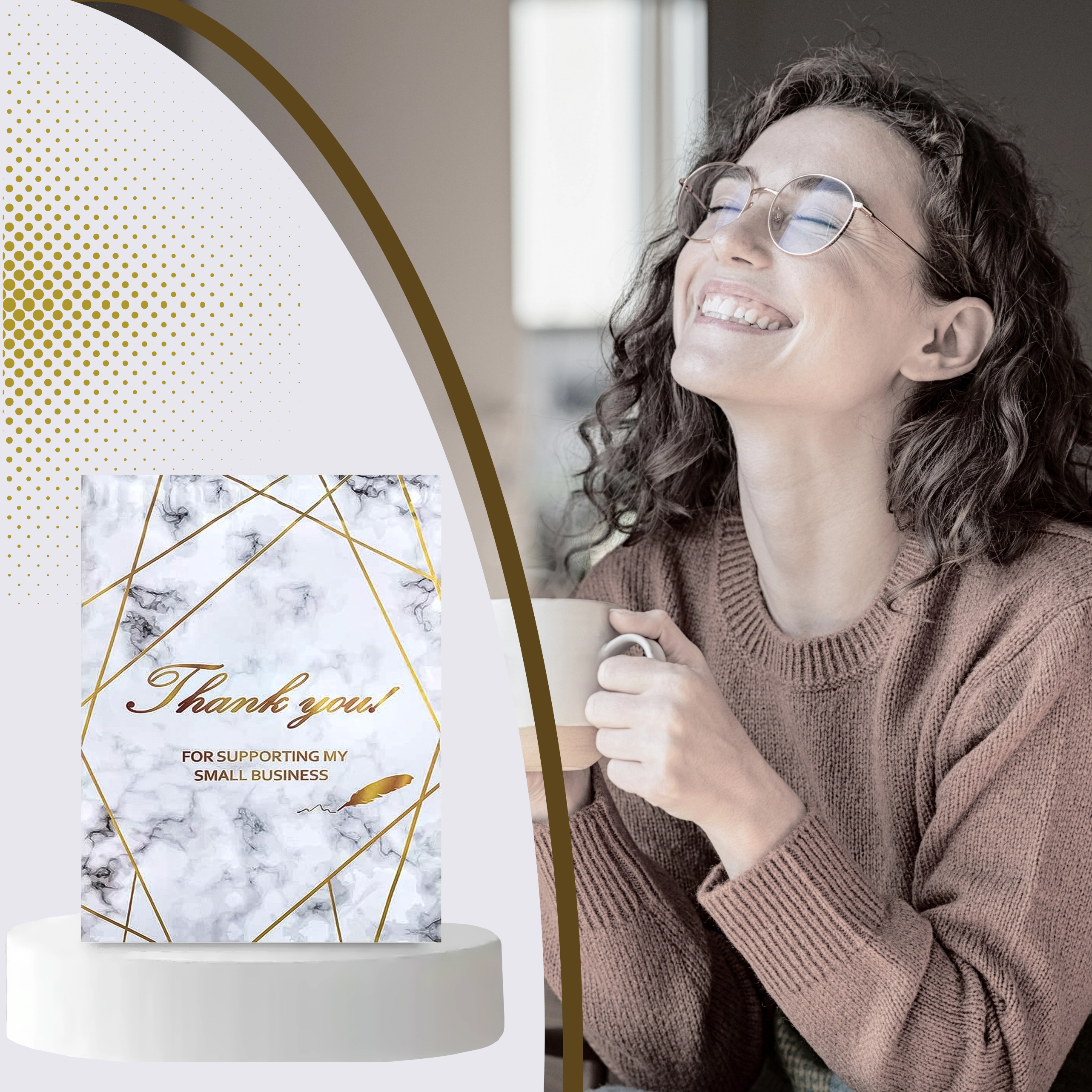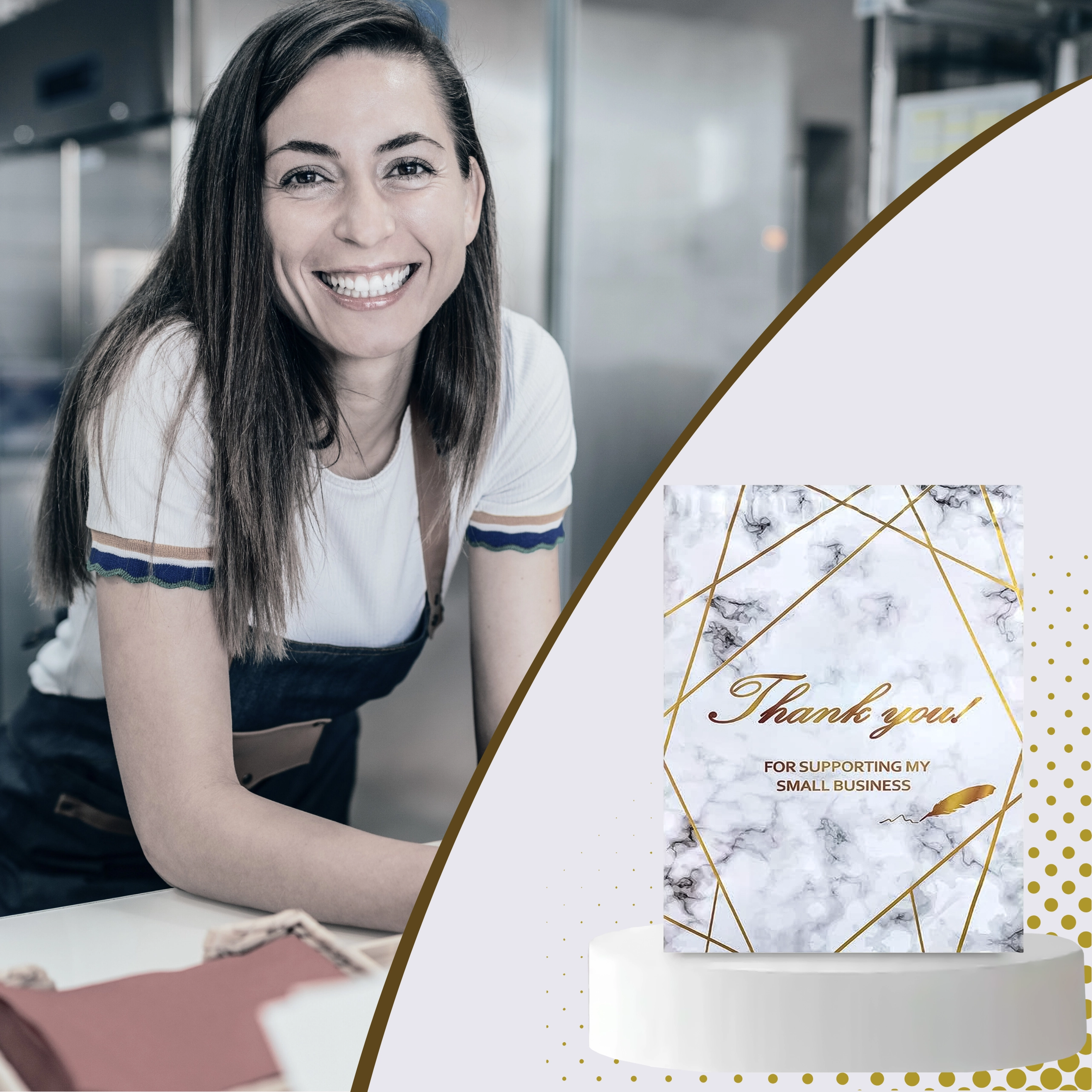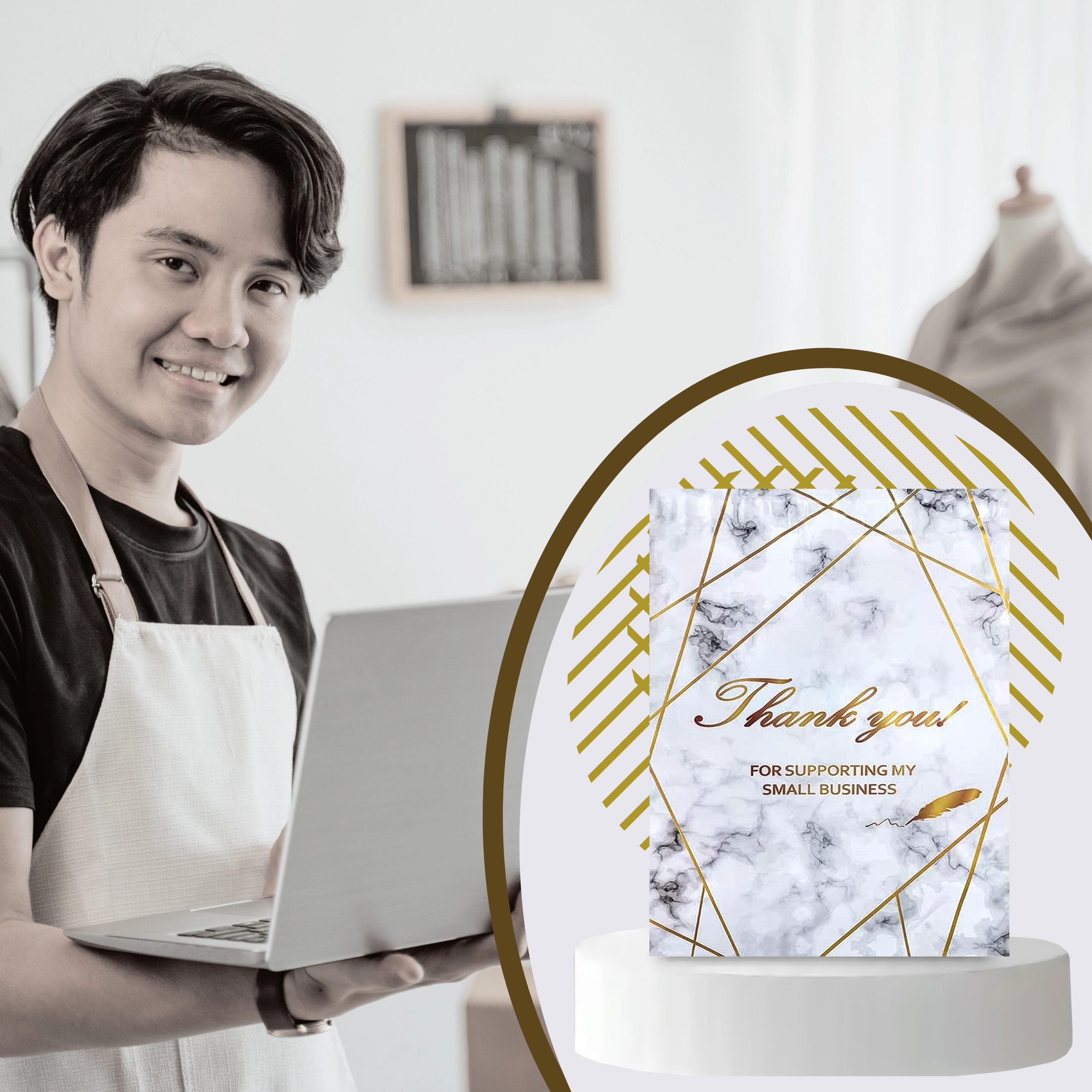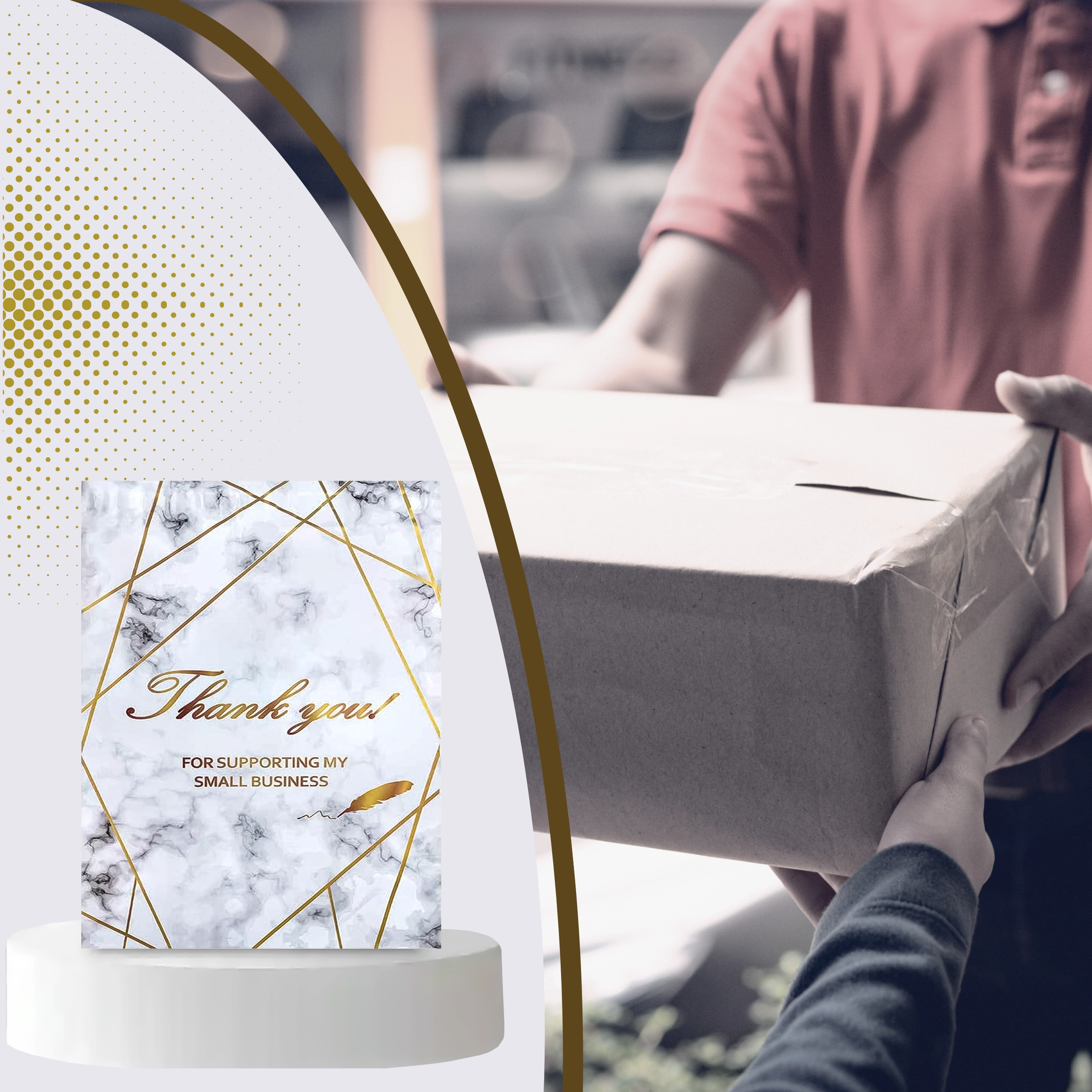 - Reprezentativen videz: zlatni marmor s potiskom Thank You za boljši vtis pri strankah.