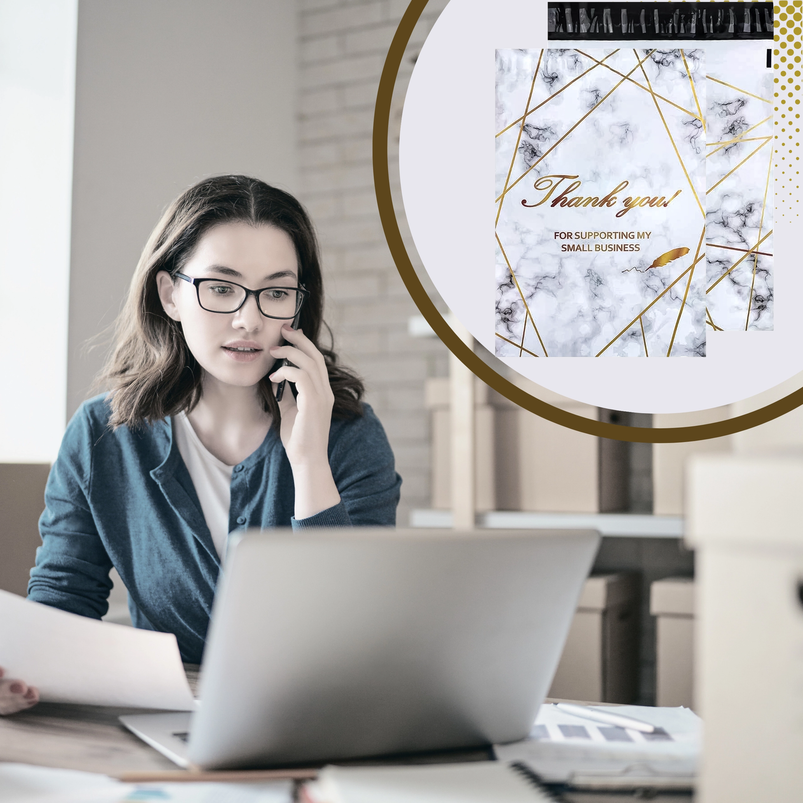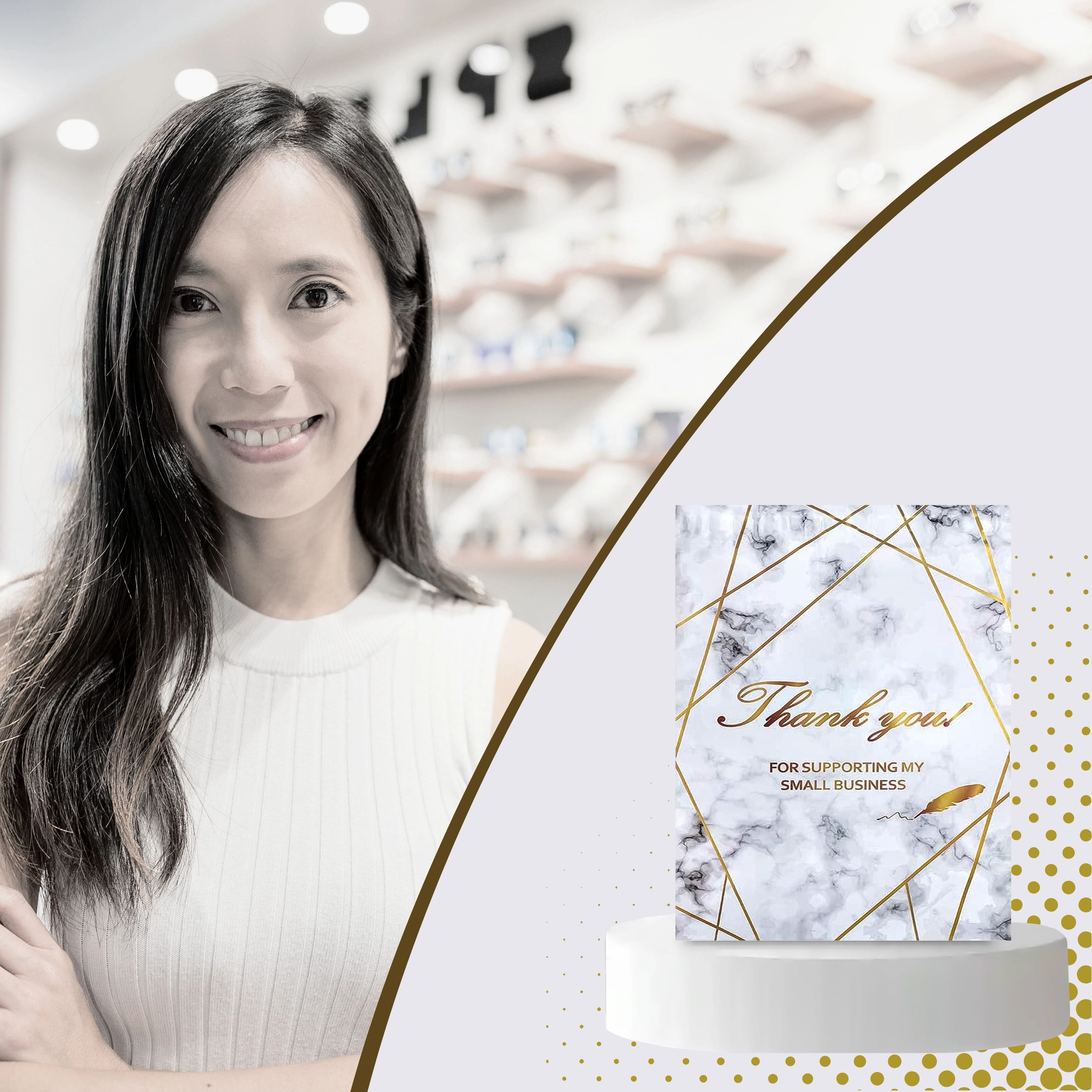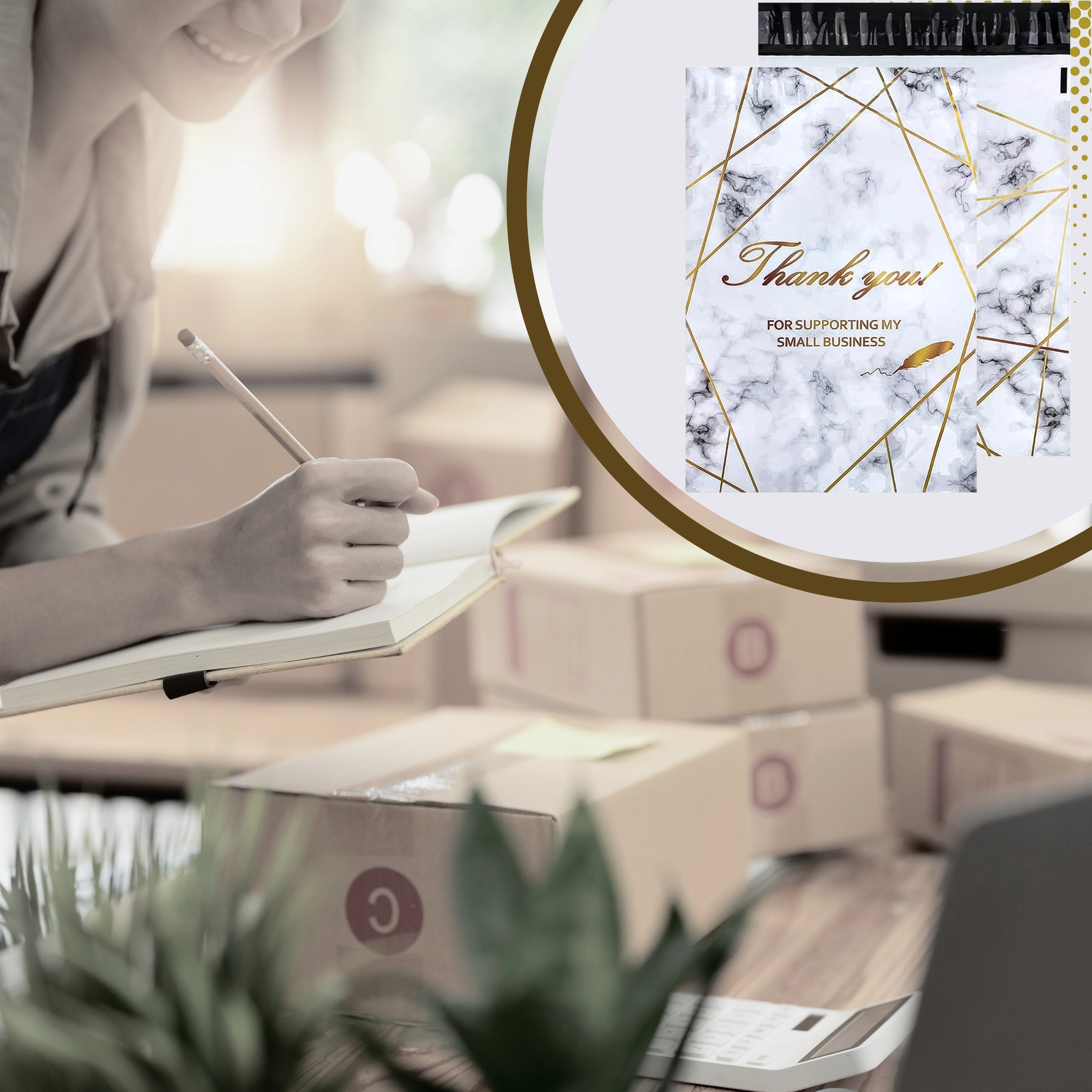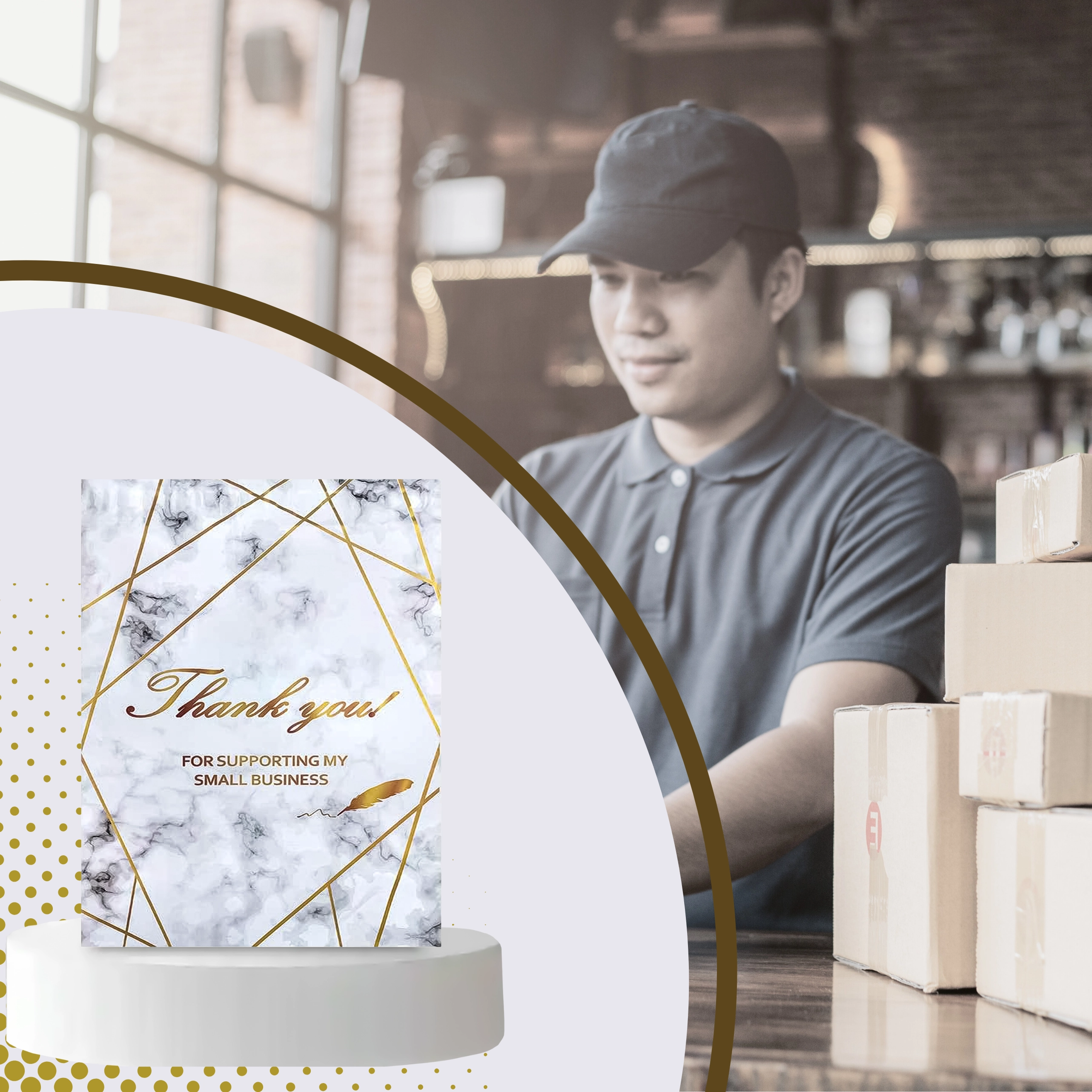 - Reprezentativen videz: zlatni marmor s potiskom Thank You za boljši vtis pri strankah.