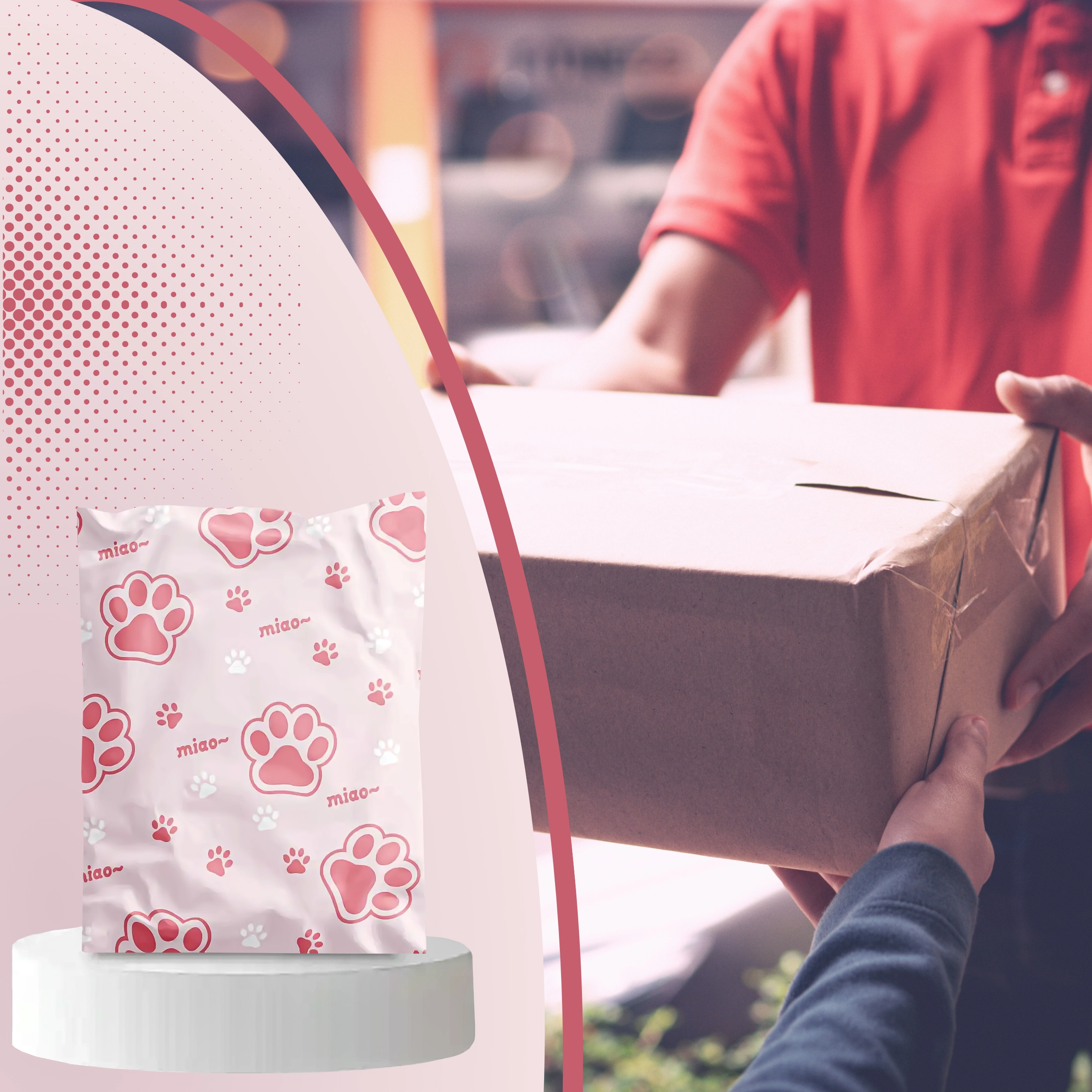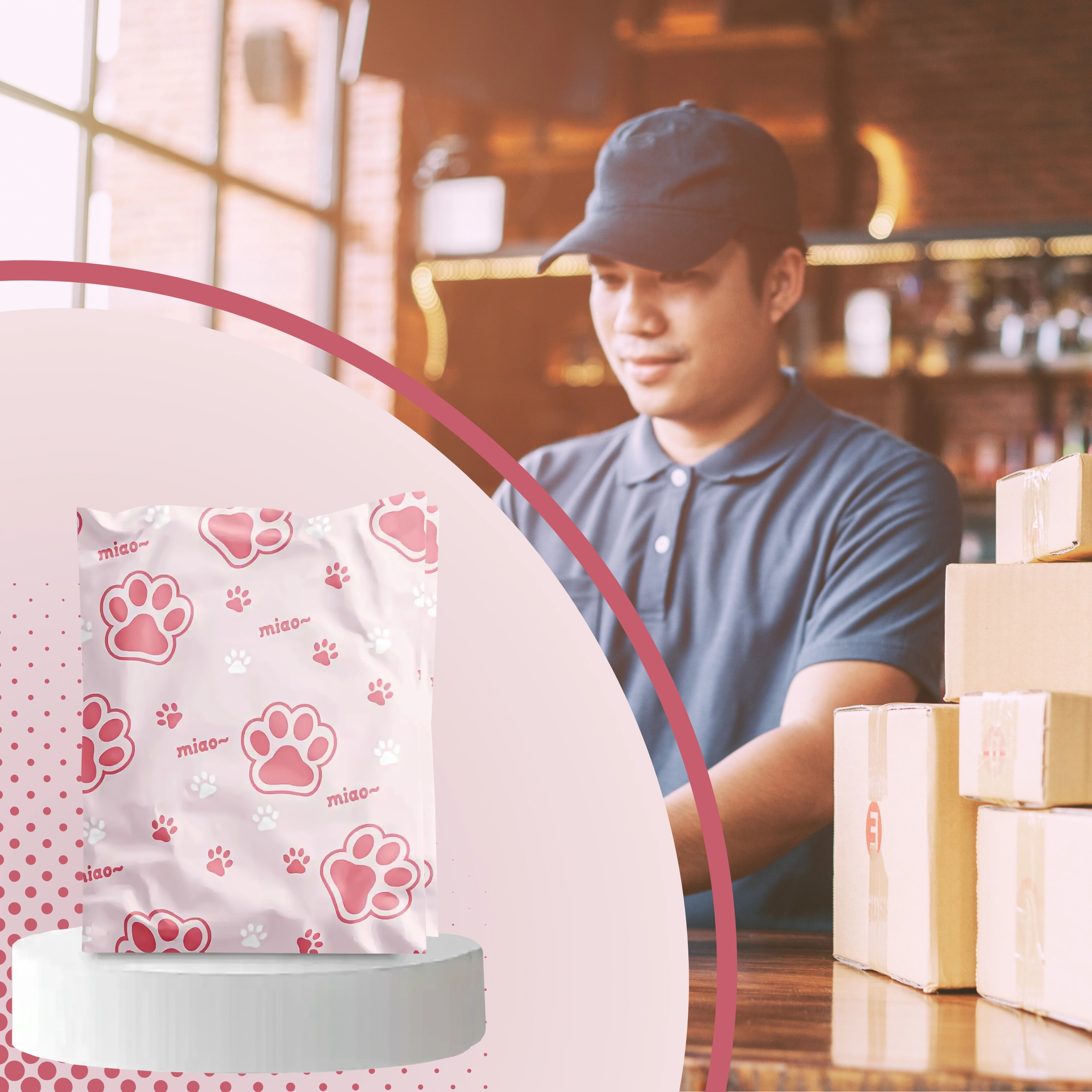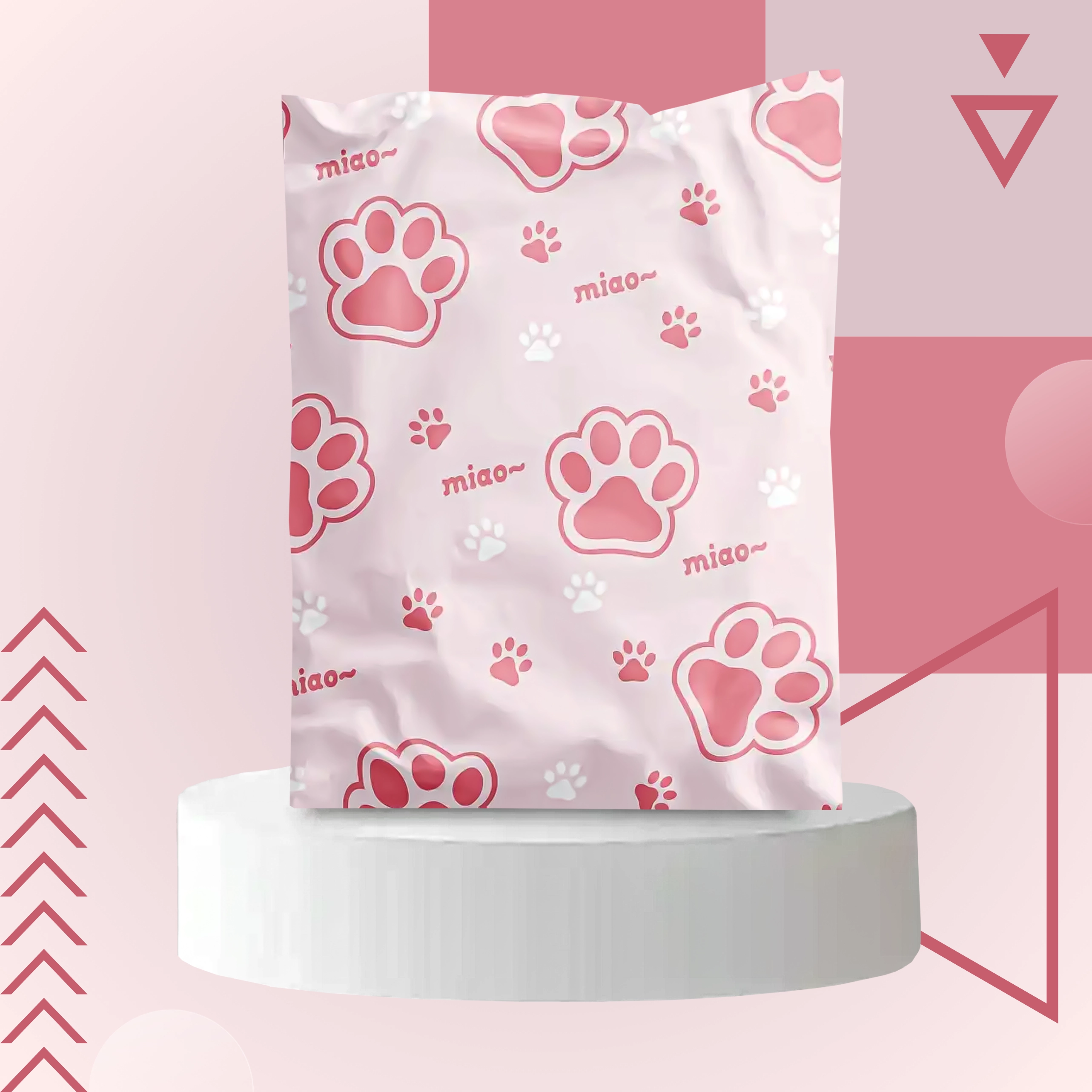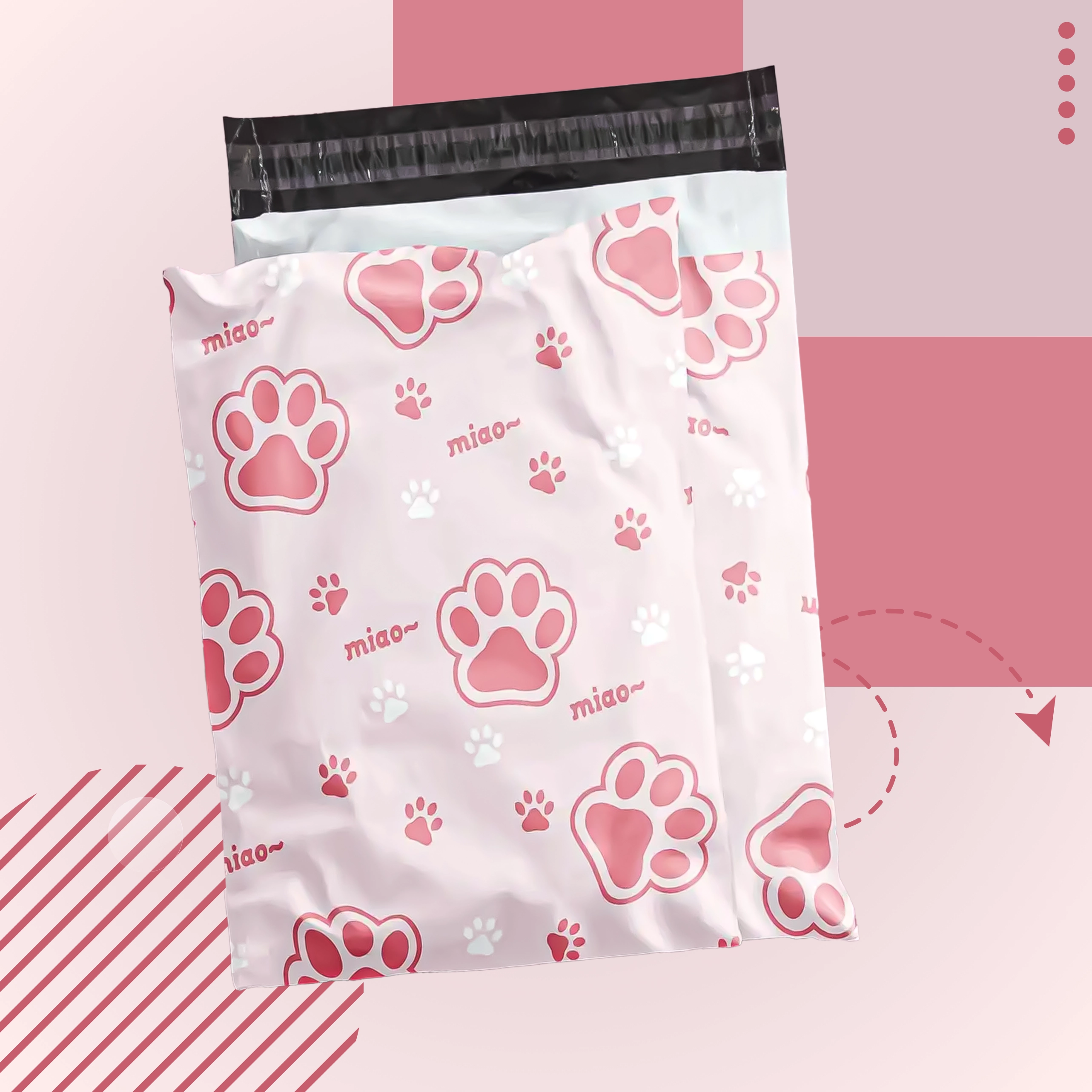 Rožnato-bel potisk z napisom “miao” doda pošiljkam osebnost in izstopa med običajnimi paketi.