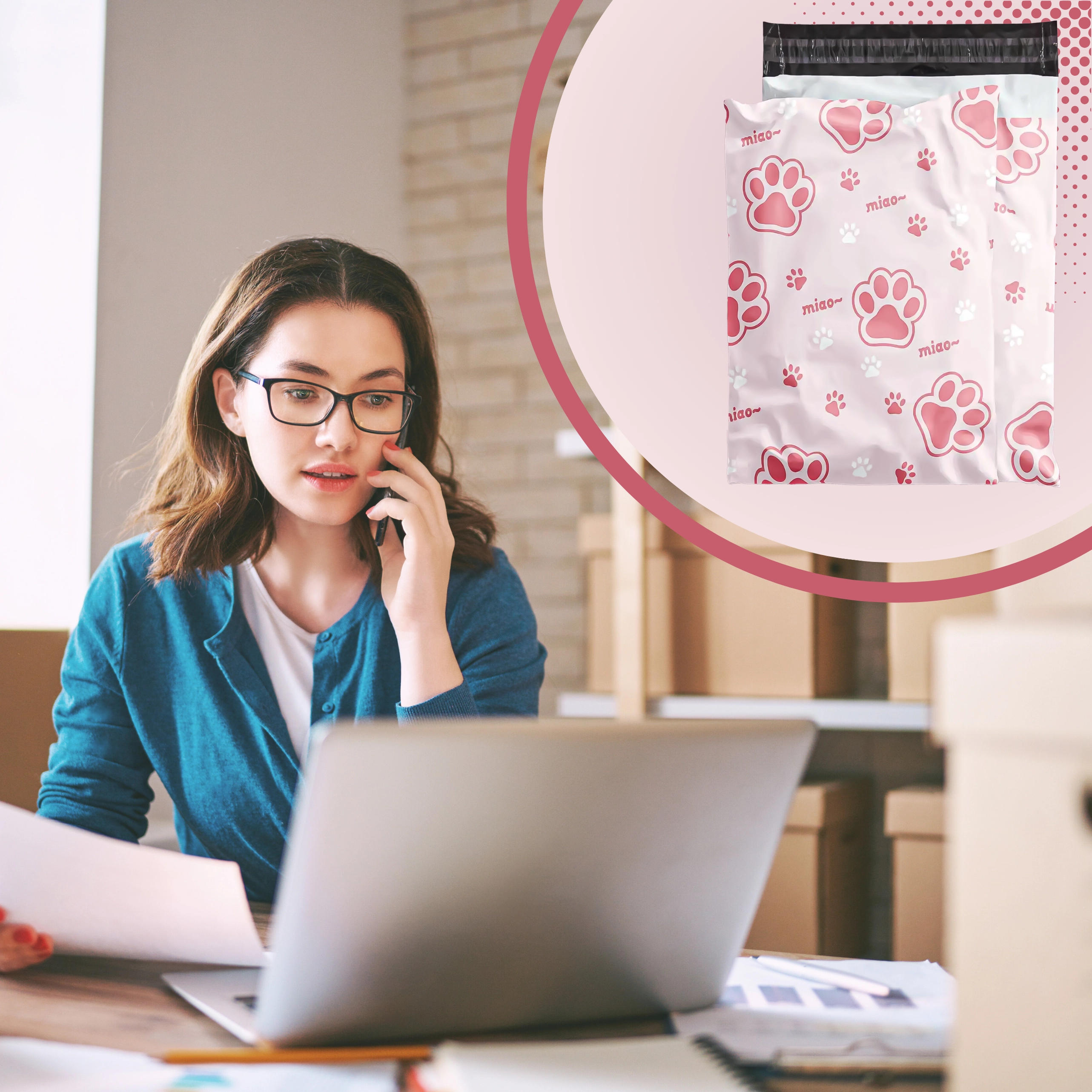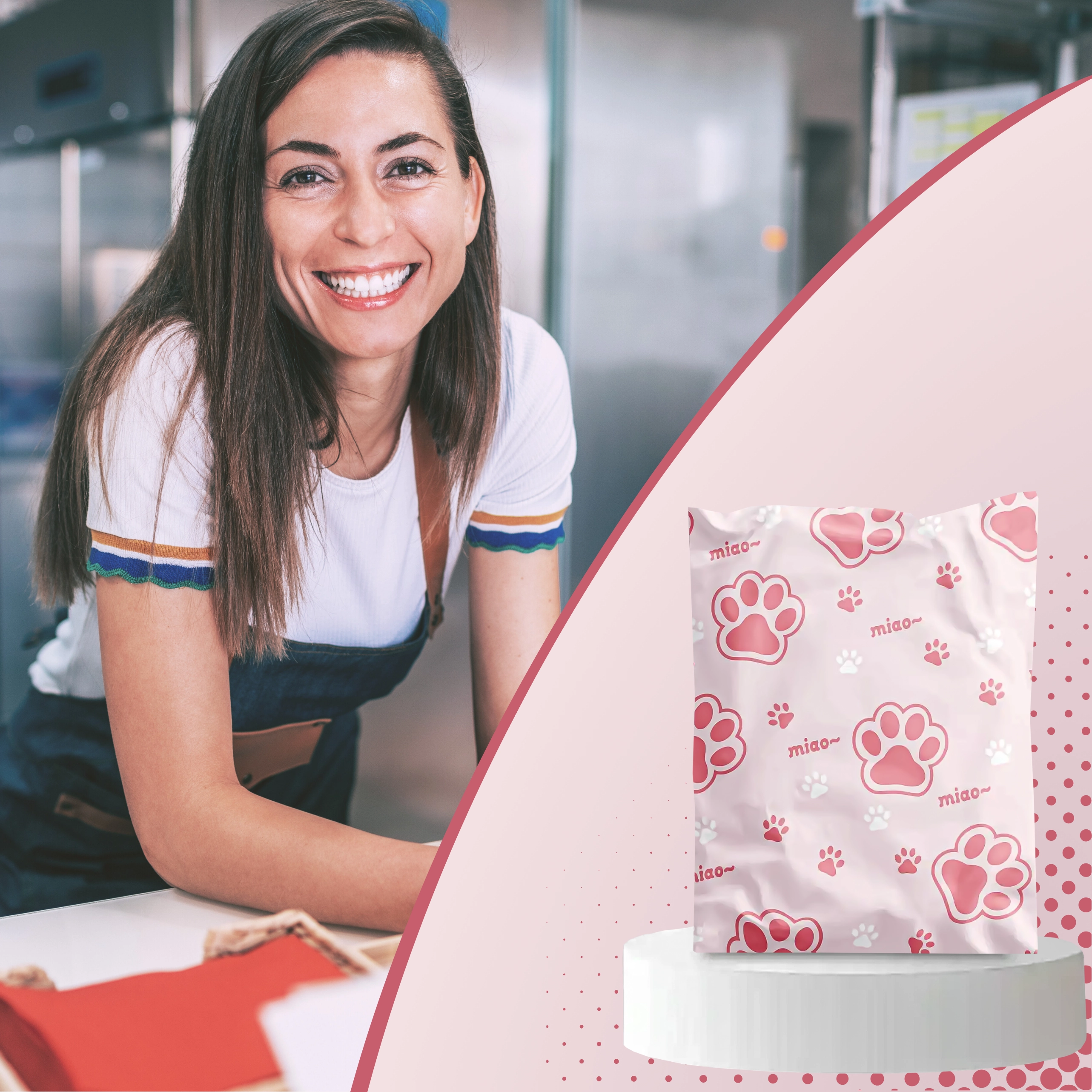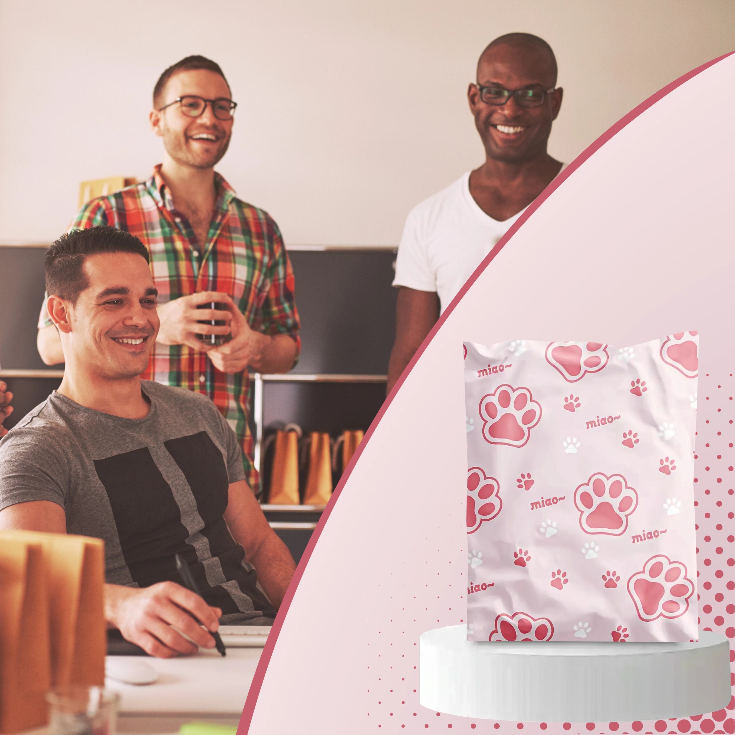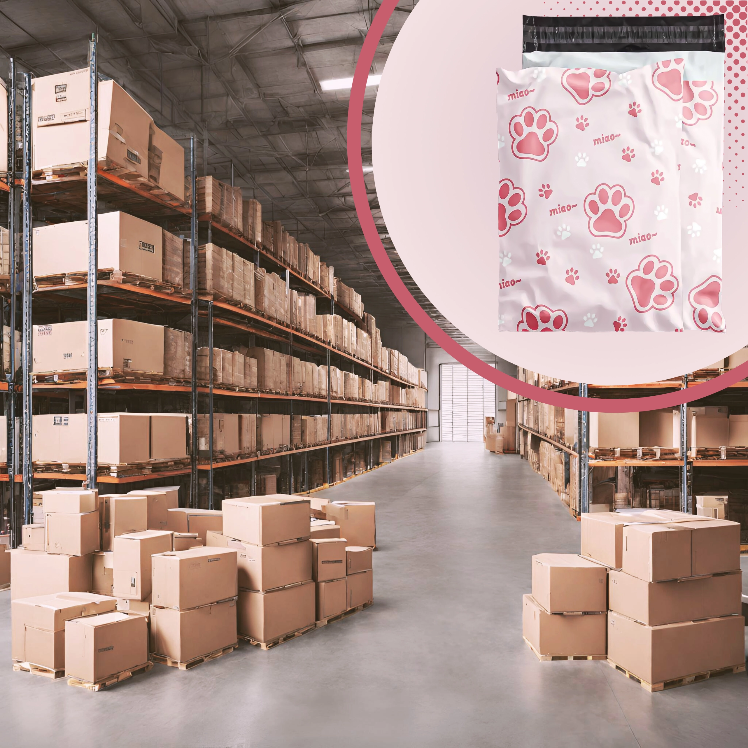Rožnato-bel potisk z napisom “miao” doda pošiljkam osebnost in izstopa med običajnimi paketi.