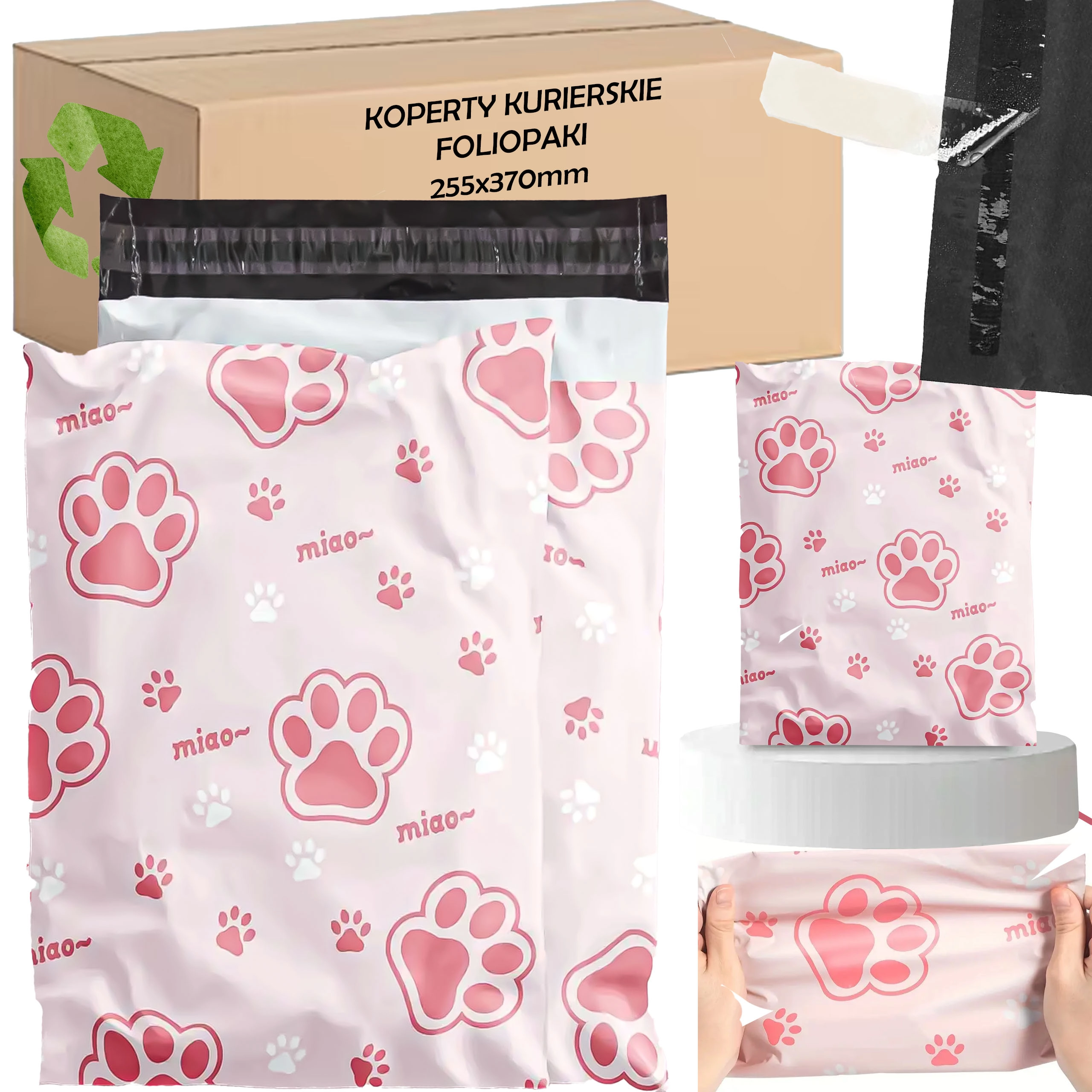 Slogovni in trpežni plastični poštni ovitki za e-trgovino in domače pošiljanje. Ponuja varno zapiranje zahvaljujoč samolepilnemu traku, hitro pakiranje ter lahek, vodoodporen material. Mere 255 × 370 mm, dizajn z mačjimi tačkami, pakiranje 50 kos.