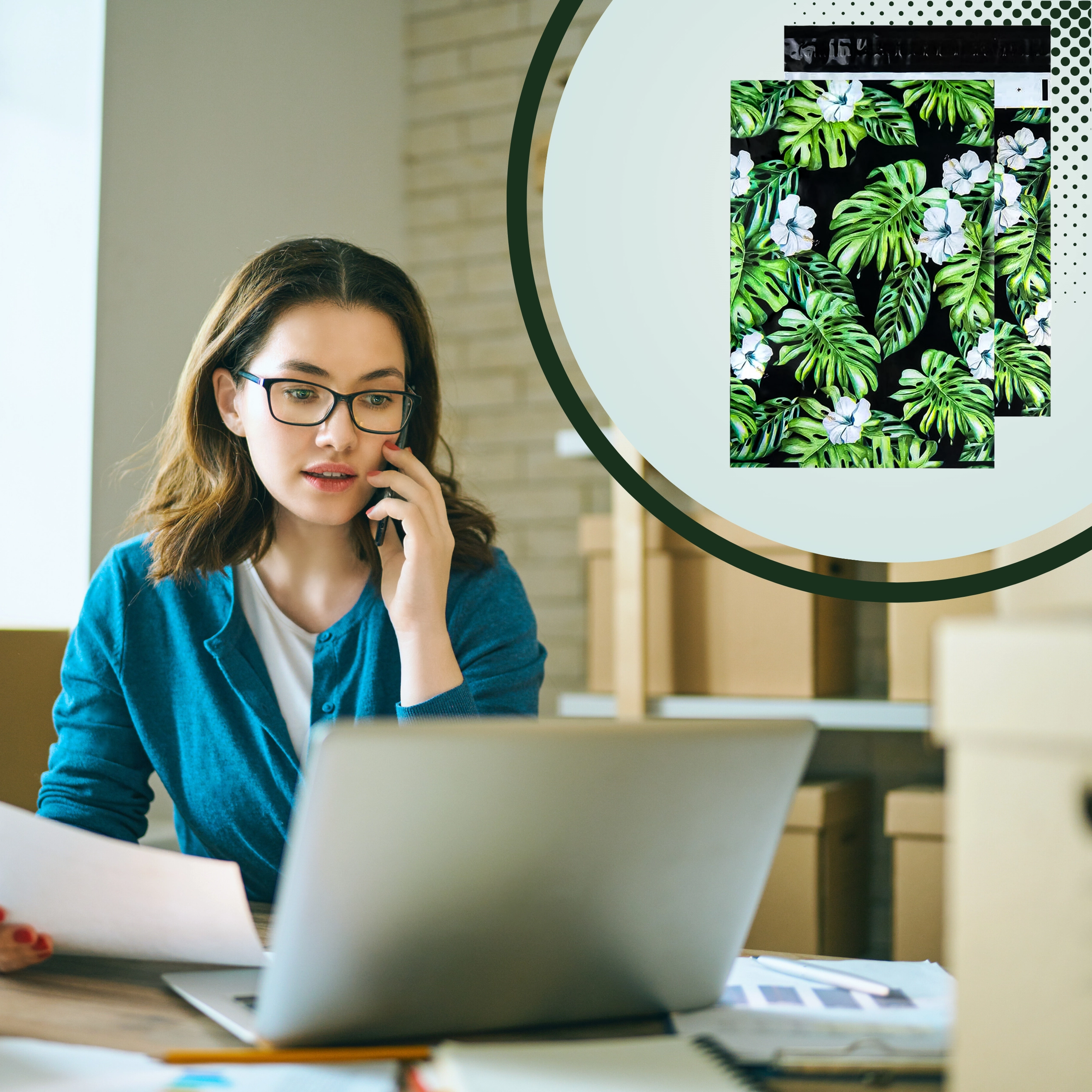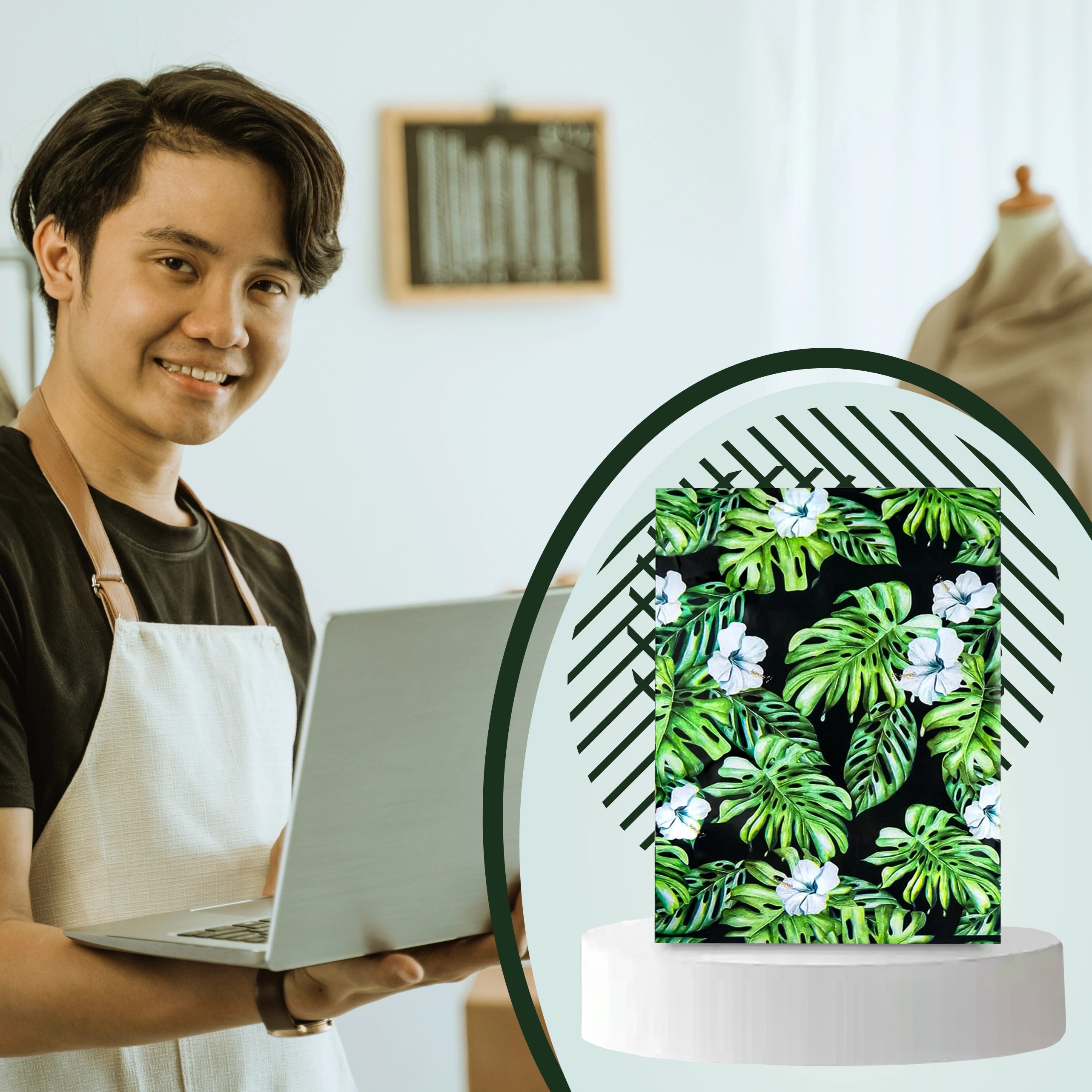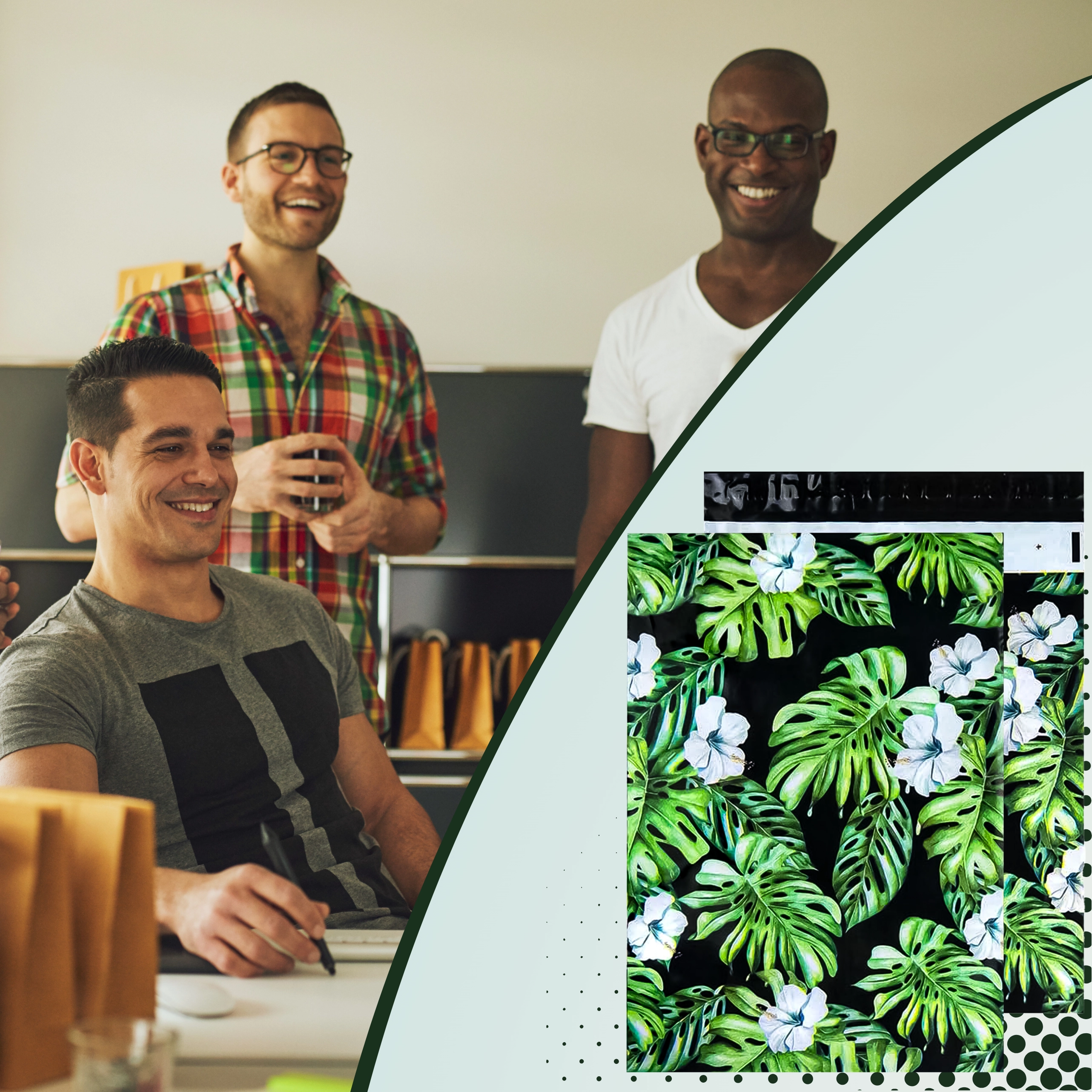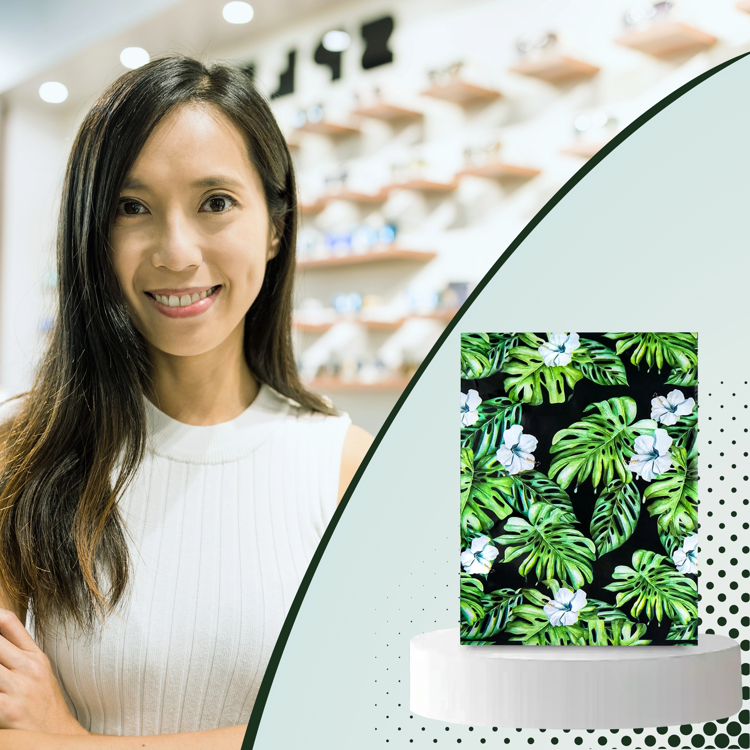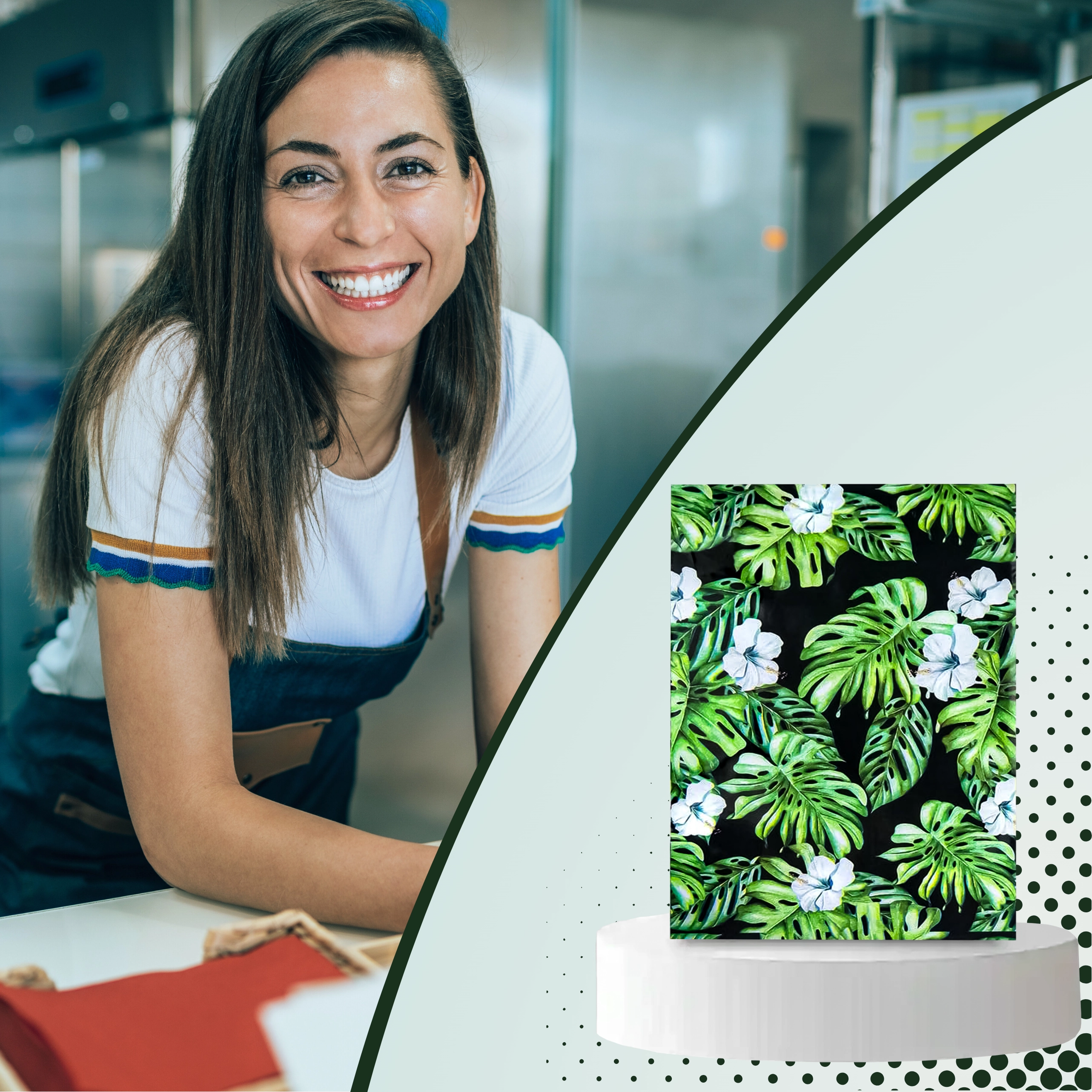 Tisk z motivom listov in cvetov na temnem ozadju daje vašim pošiljkam izrazit videz in krepi prepoznavnost blagovne znamke ob dostavi.