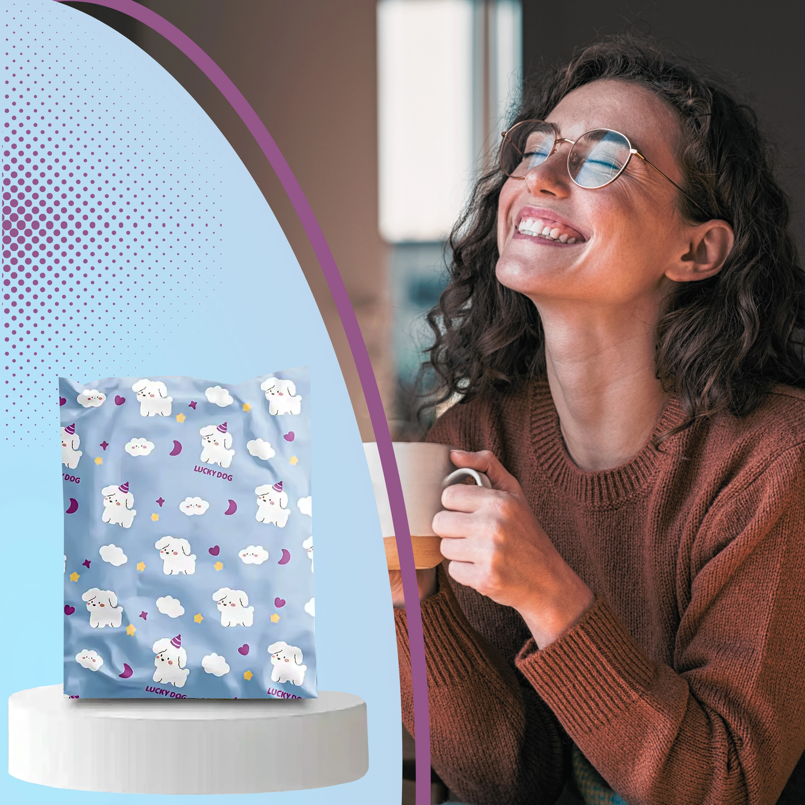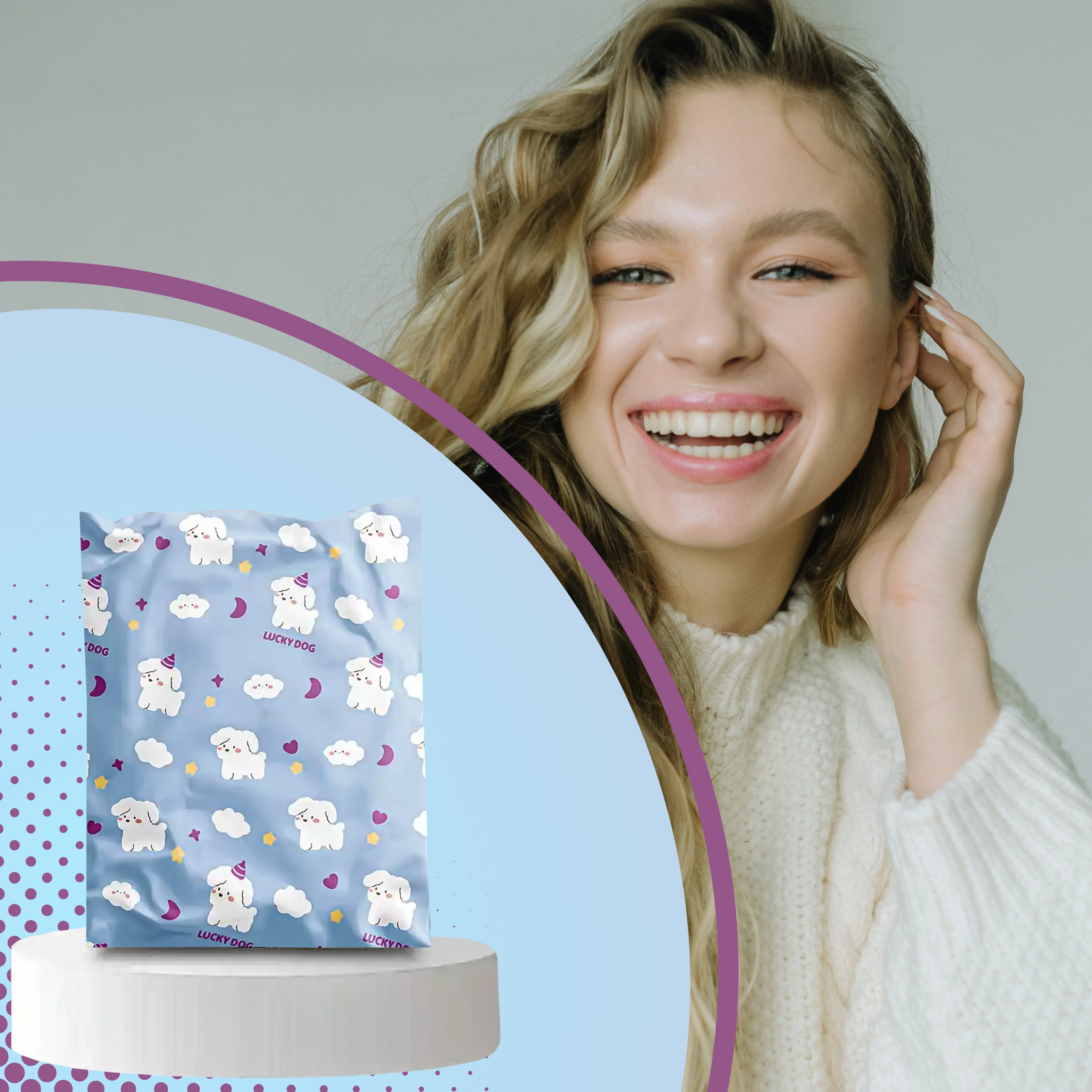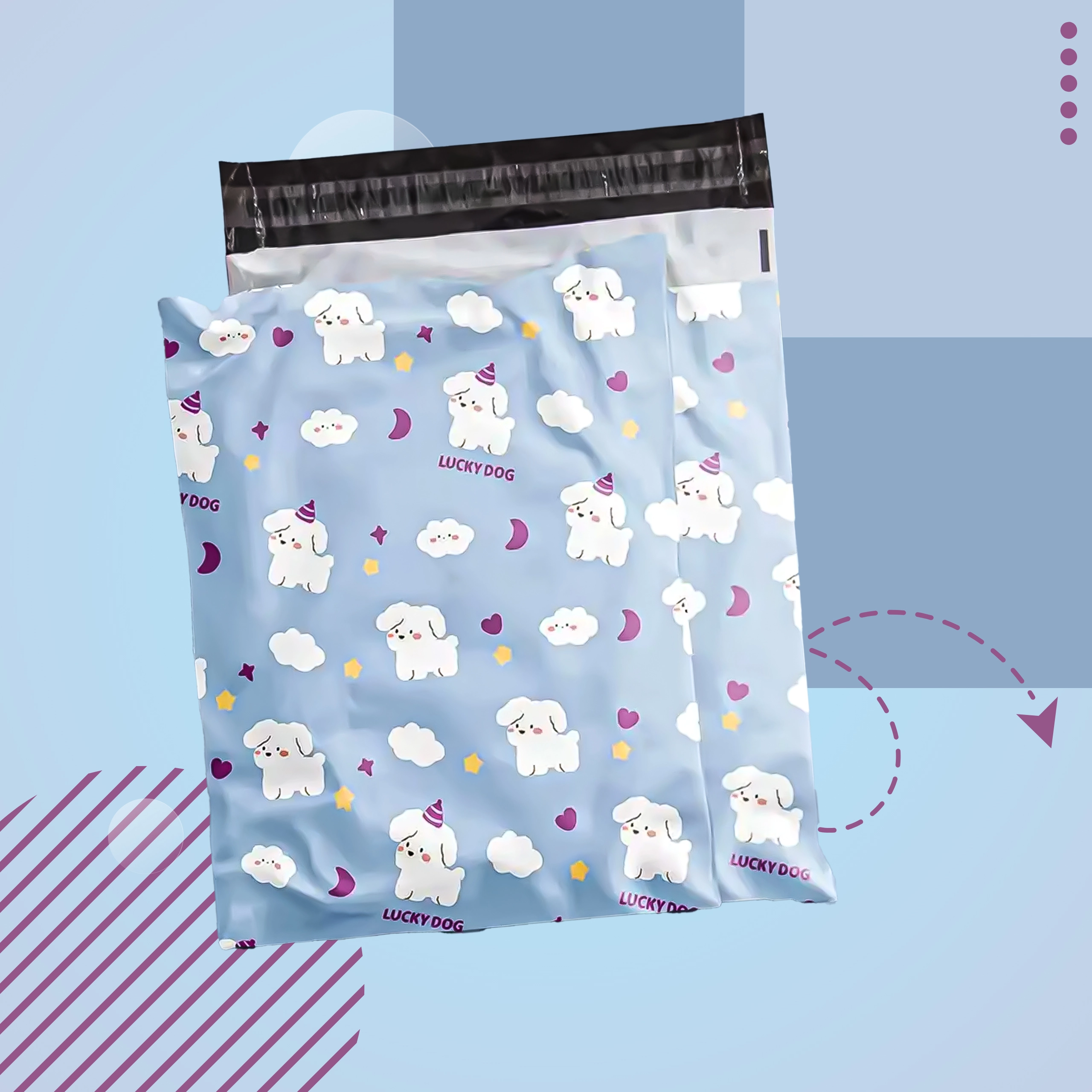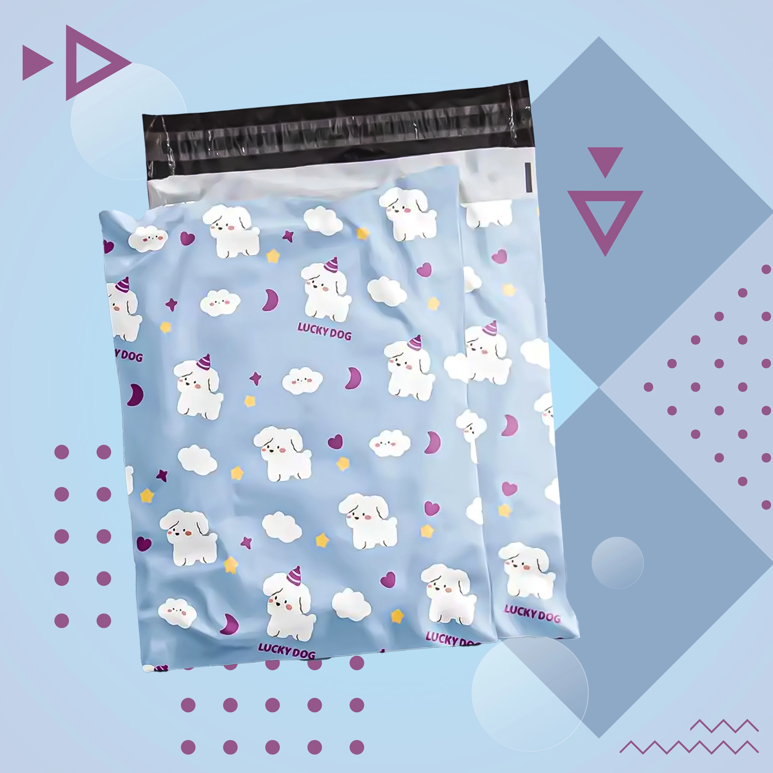 Svetlo modra zasnova z ljubkimi kužki izboljša vtis ob dostavi in podpre izkušnjo razpakiranja. Idealno za modne spletne trgovine in darilno pakiranje.