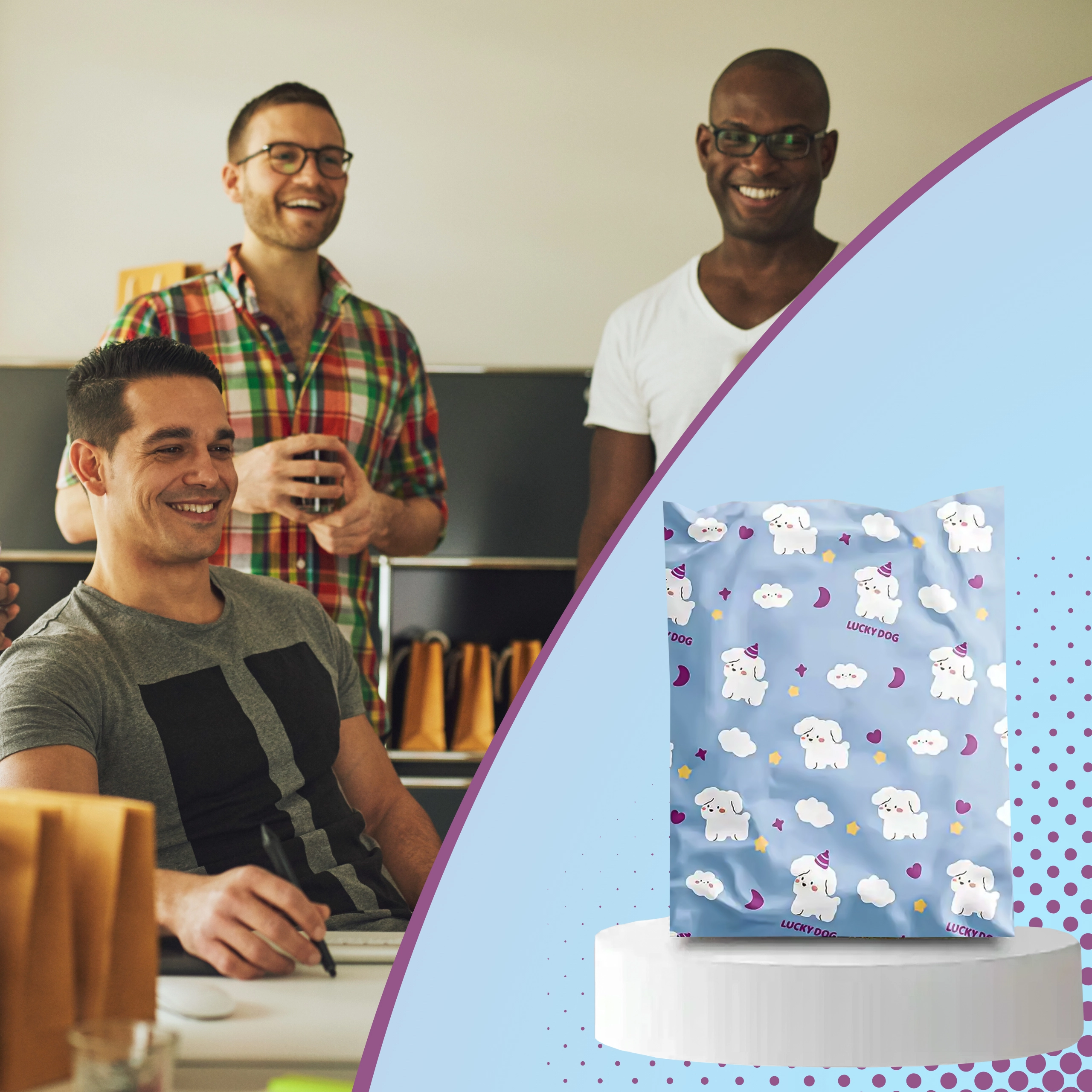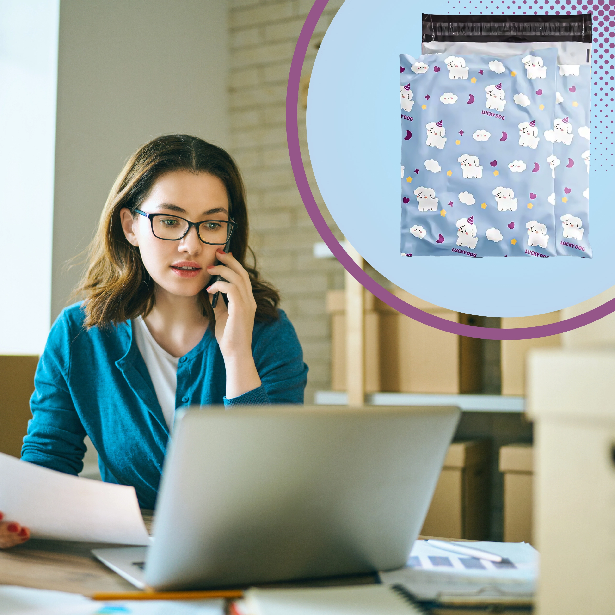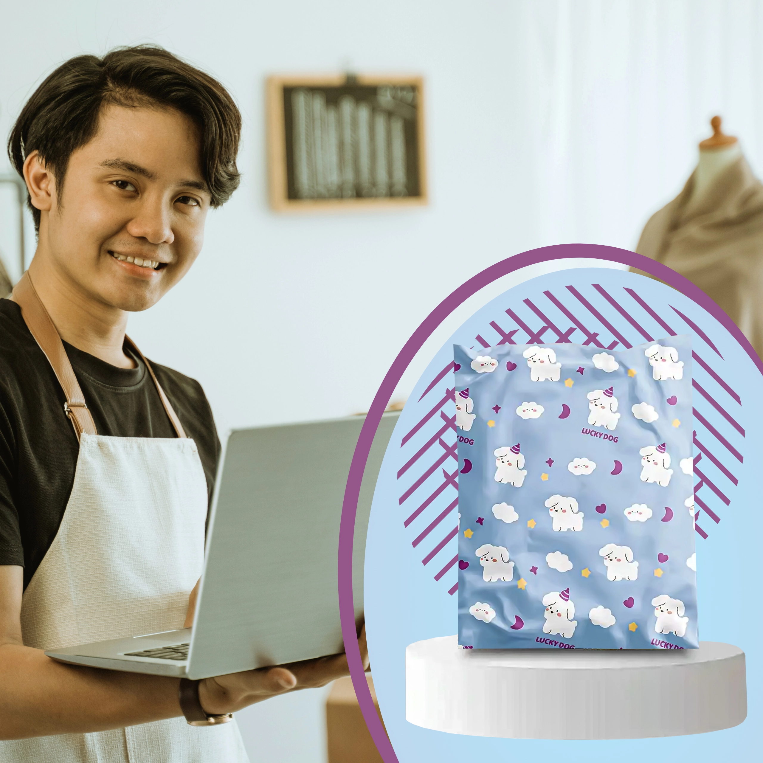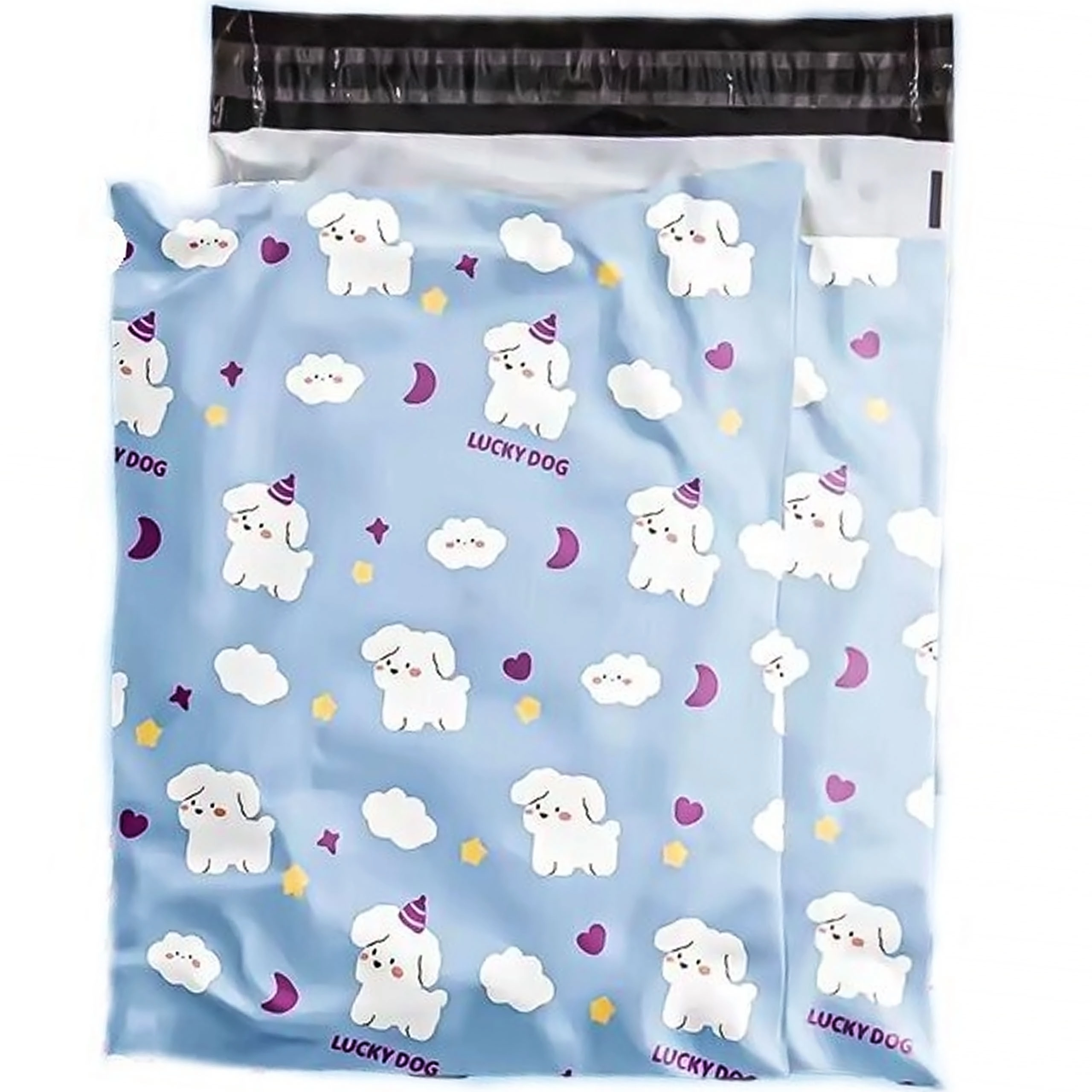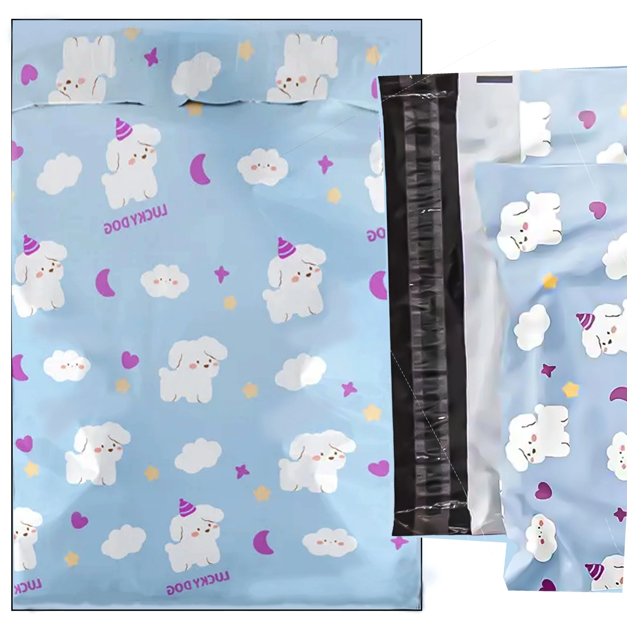 Svetlo modra zasnova z ljubkimi kužki izboljša vtis ob dostavi in podpre izkušnjo razpakiranja. Idealno za modne spletne trgovine in darilno pakiranje.