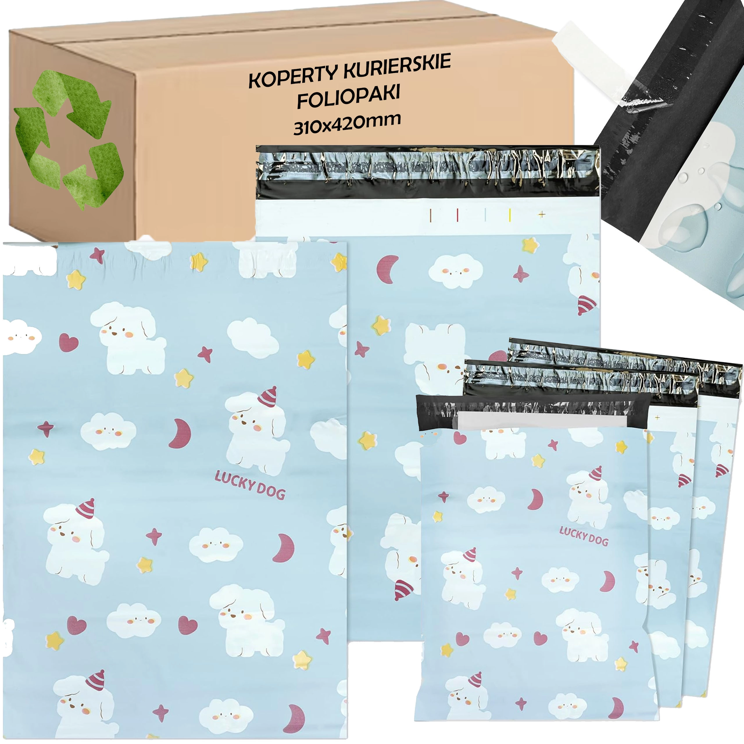 Praktični in trpežni kurirski plastični ovitki z motivom LUCKY DOG za hitro in varno pošiljanje paketov. Dimenzije 310 × 420 mm, samolepilni trak za enostavno zapiranje, lahek in vodoodporen material. Idealno za spletne trgovine ter pošiljanje tekstila in drugih mehkejših izdelkov. Pakiranje vsebuje 50 kos.