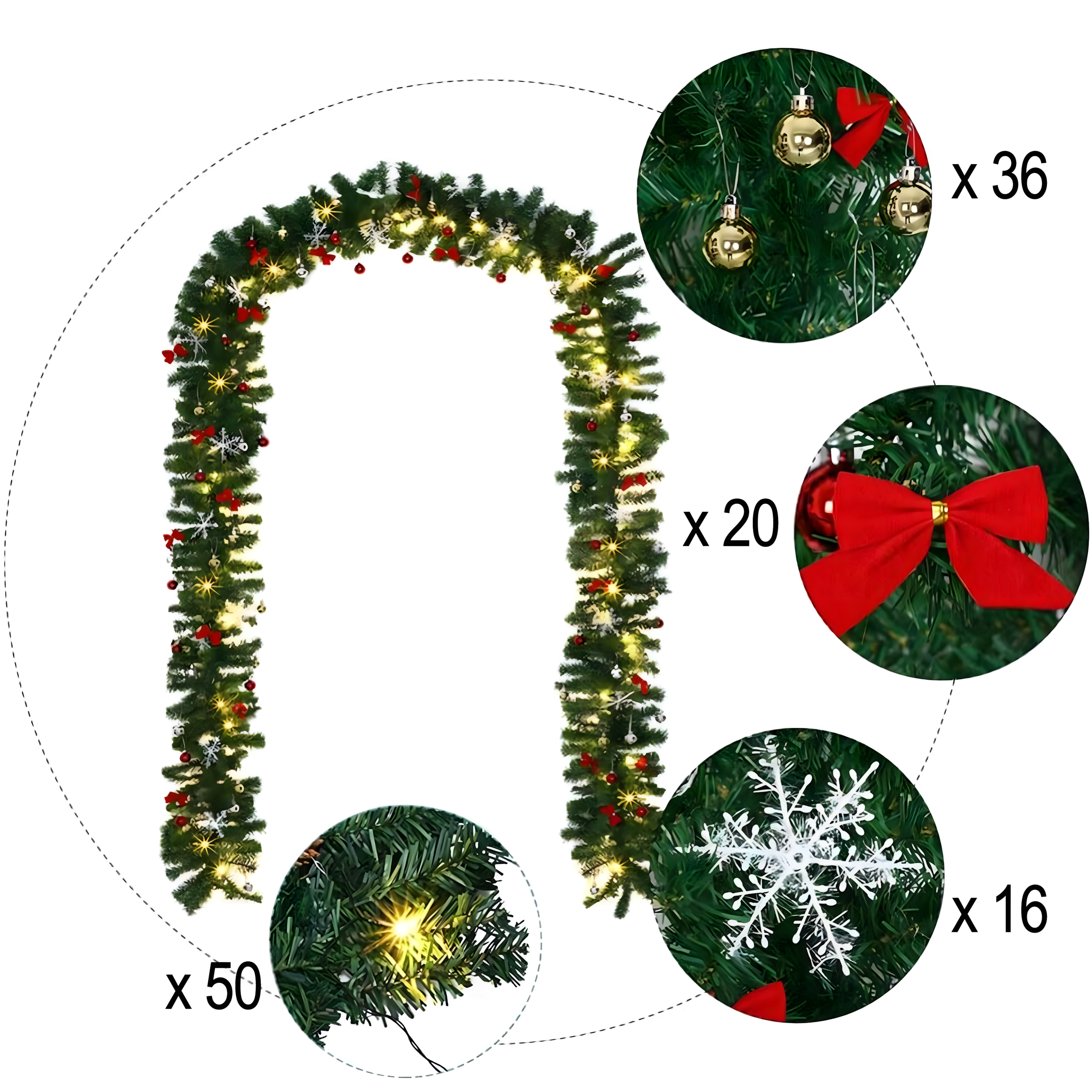 Zaradi goste strukture z 260 vejicami deluje girlanda polno in realistično, hkrati pa je fleksibilna ter jo je enostavno oblikovati okoli ograj, okenskih in vratnih okvirjev. Dolžina 2,7 m omogoča vsestransko uporabo v notranjih in pokritih zunanjih prostorih.