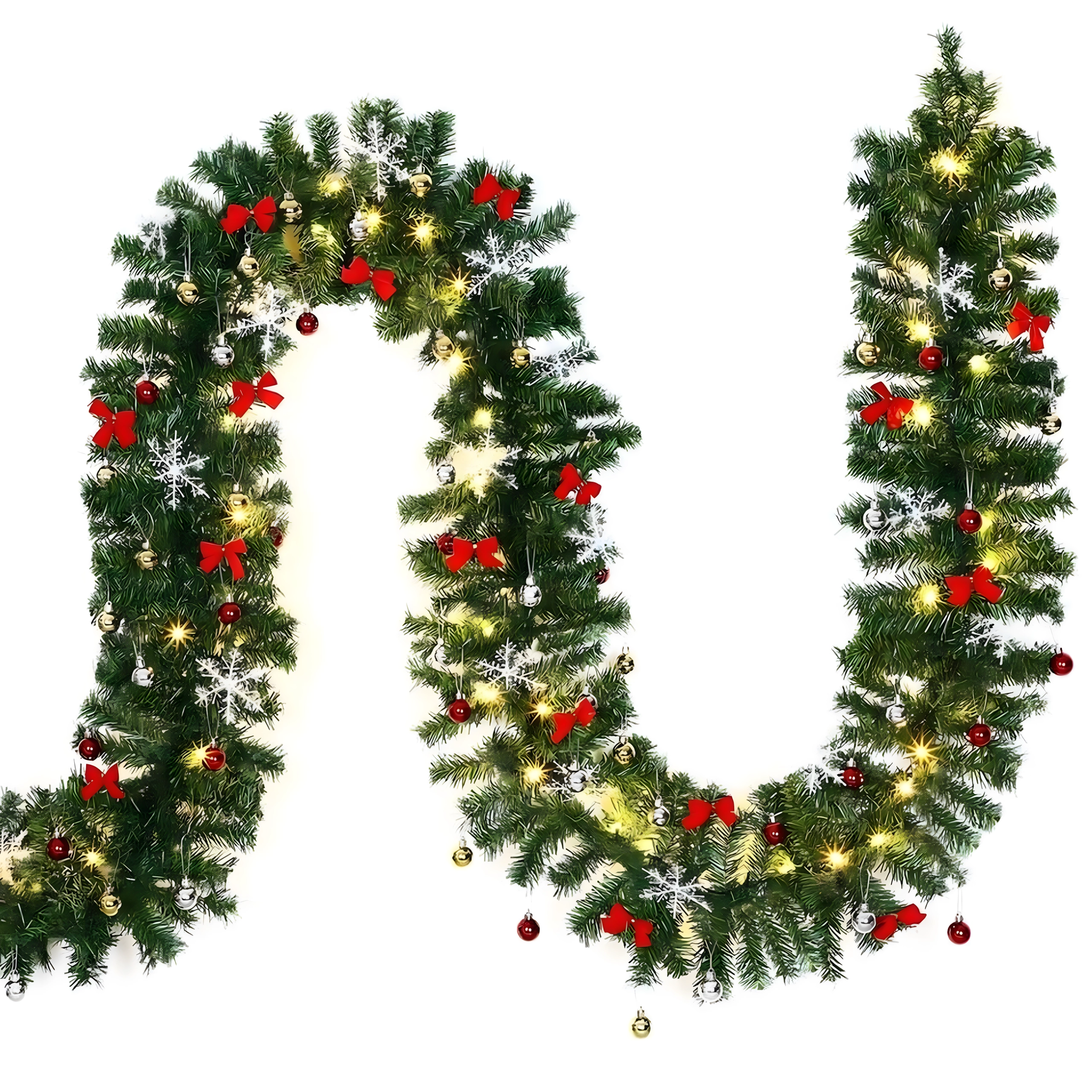 Ta elegantna božična girlanda spremeni vsak vhod, ograjo ali kaminsko polico v praznični poudarek. Vgrajene tople LED luči poskrbijo za prijetno, domačno osvetlitev, brezčasni okraski v obliki bunkic, pentelj in snežink pa za slavnosten videz brez skrbi.