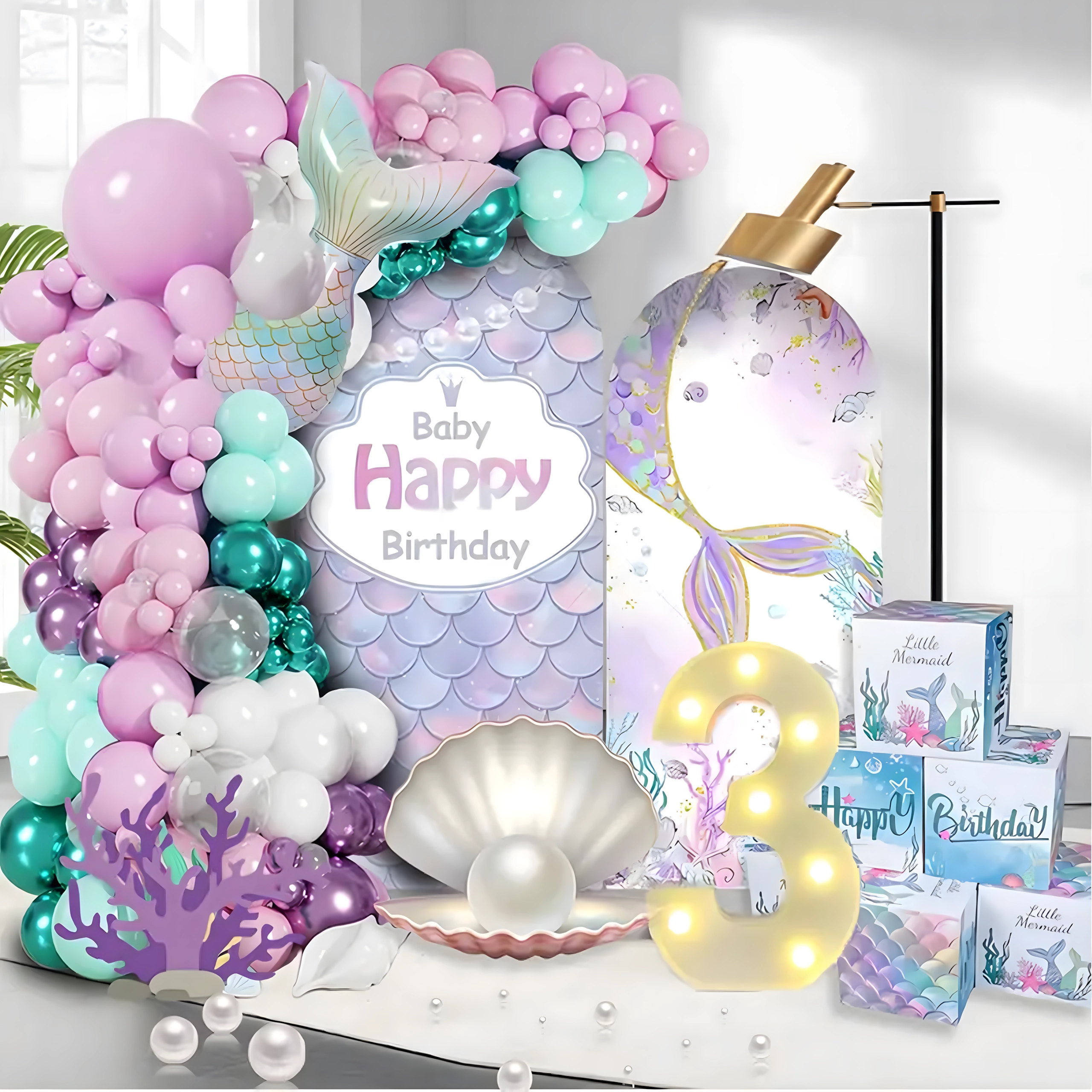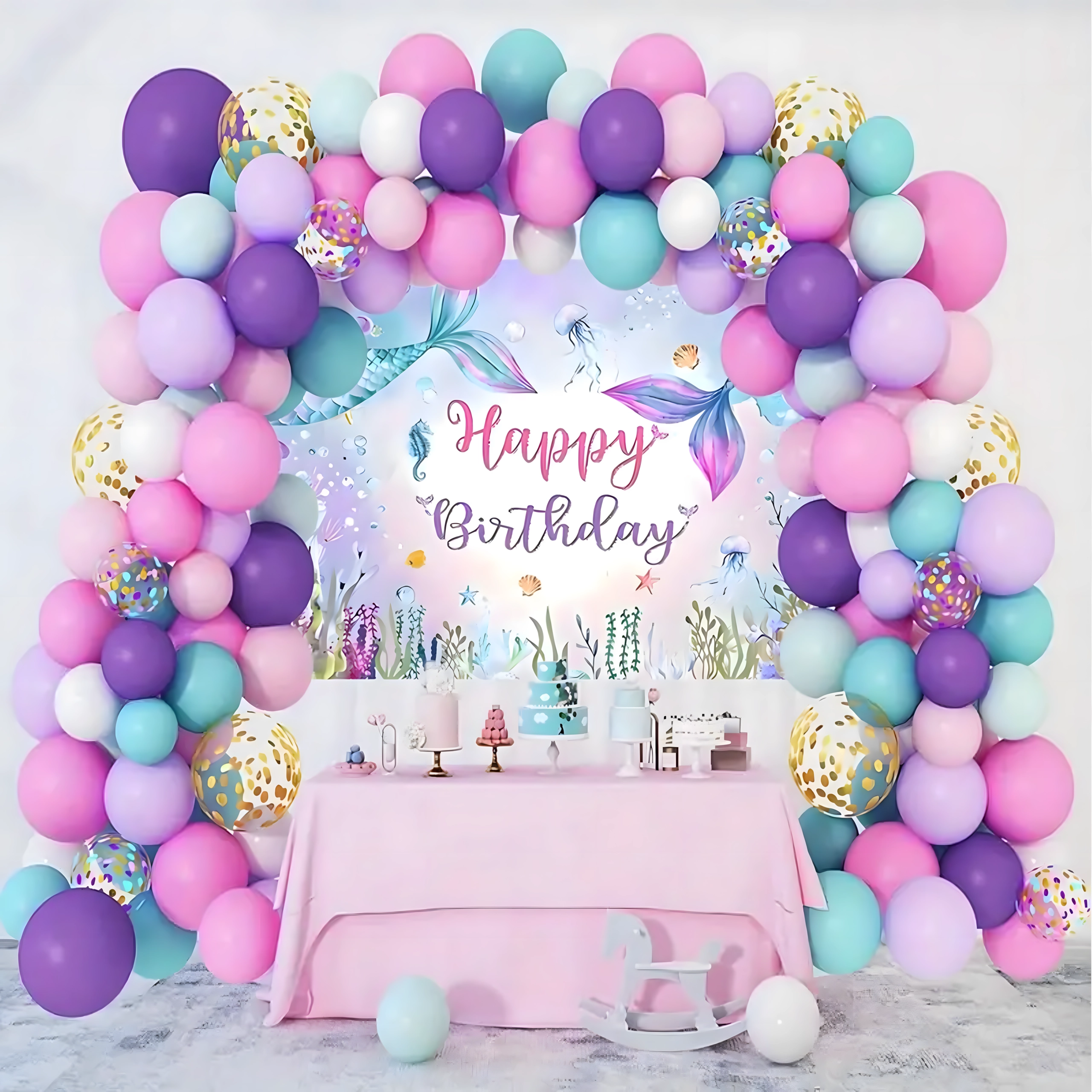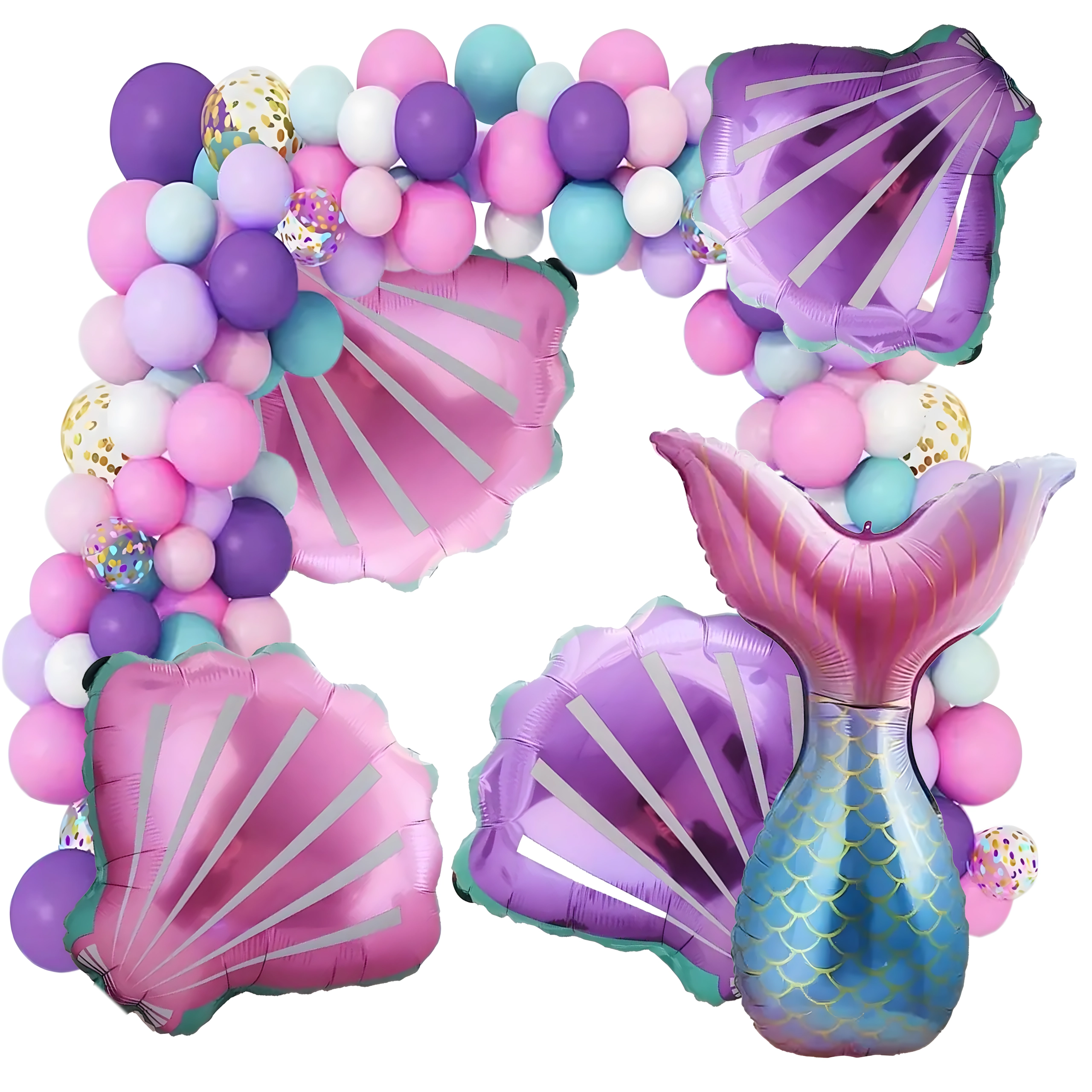 Ta dekorativna girlanda iz balonov z motivom morske vile bo vašemu praznovanju dodala nežen pastelen pridih in pravljično vzdušje. V pakiranju boste našli različne oblike in velikosti balonov, vključno z bleščečimi konfeti in motivom školjk, tako da boste zlahka ustvarili privlačno lokasto aranžma.