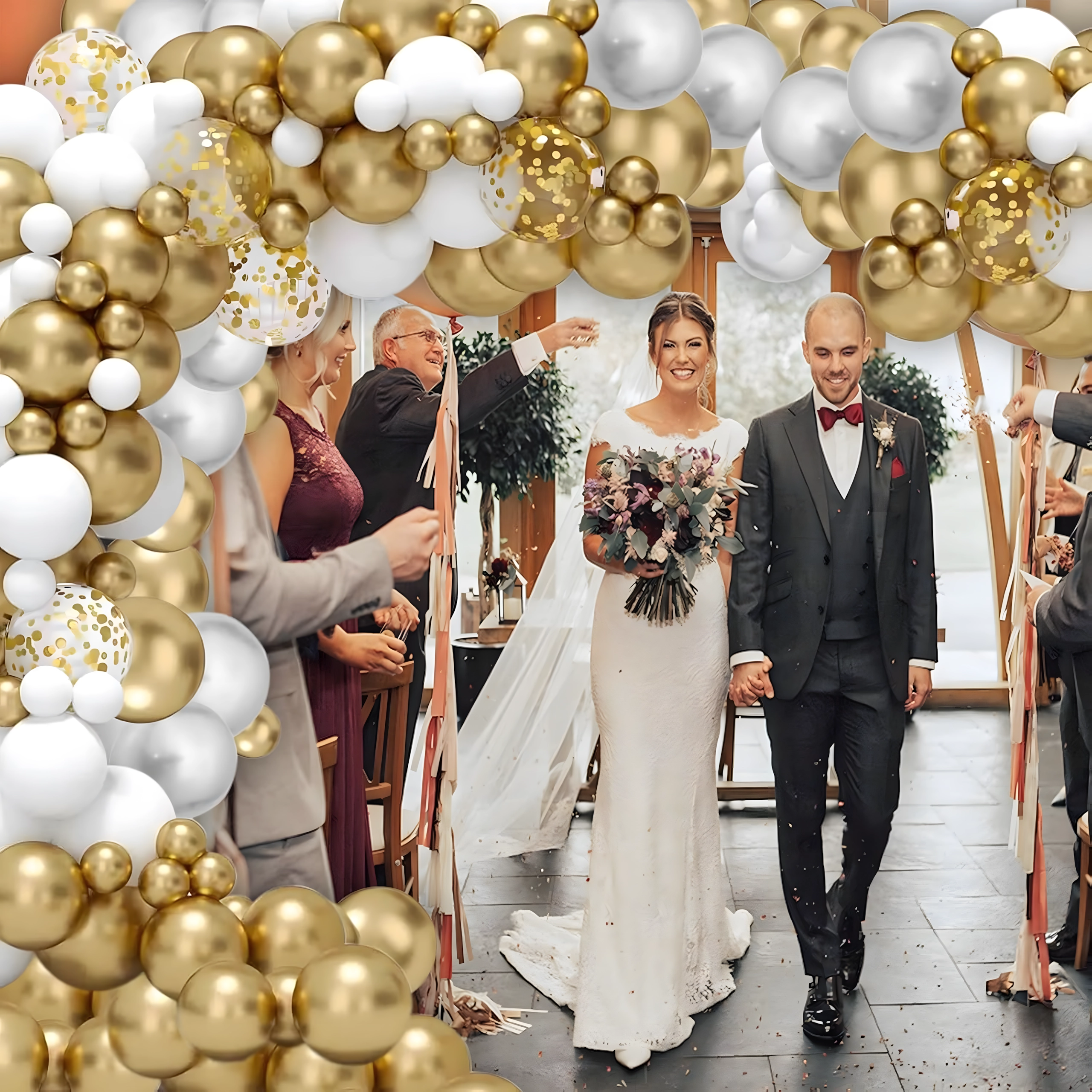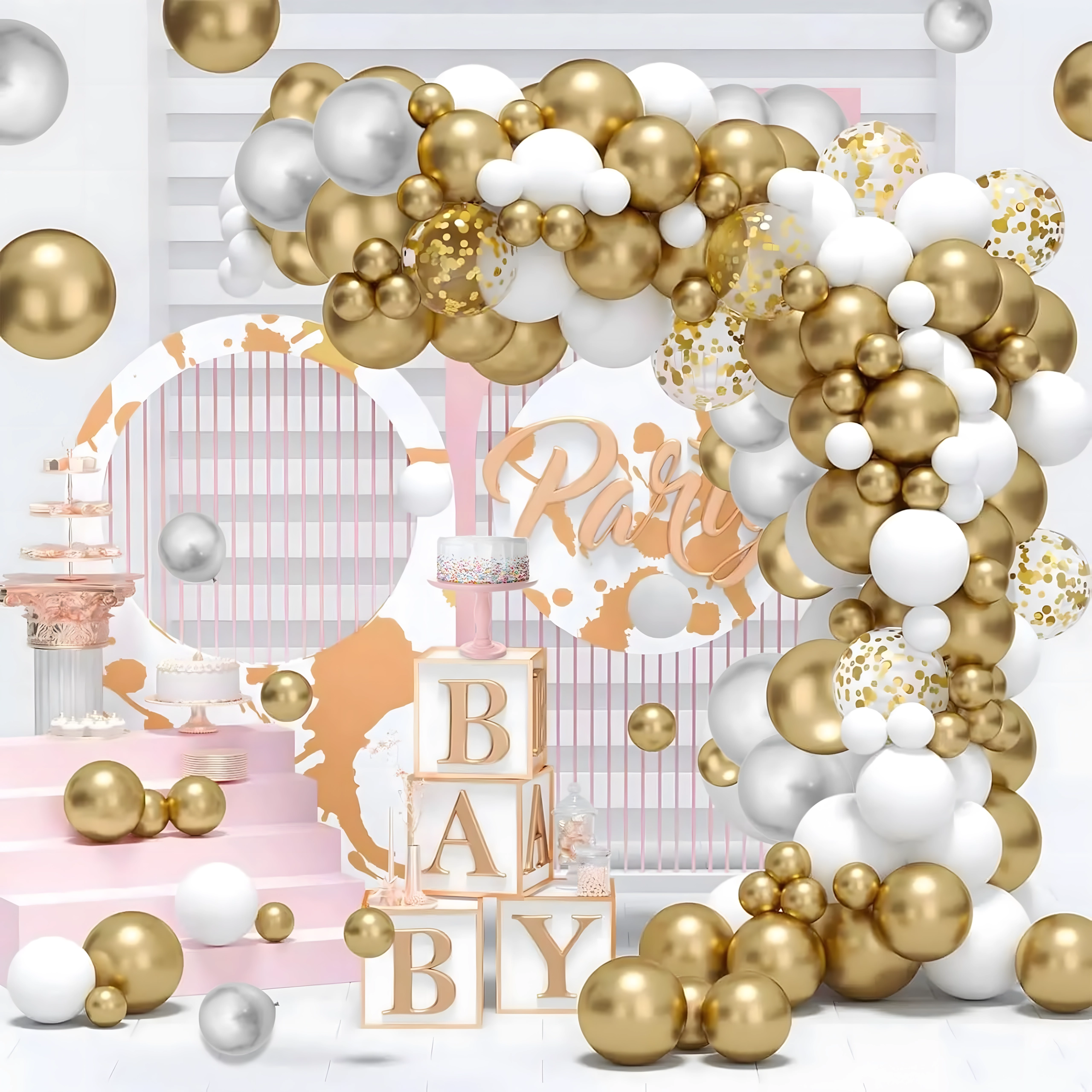Ustvarite impresivno dekoracijo s to belo‑zlato balonasto girlando s 110 deli. Idealno za rojstne dneve, poroke, silvestrovanja in poslovne dogodke. Enostavna montaža, učinkovita barvna kombinacija in popolno fotografsko ozadje za vsako praznovanje.
