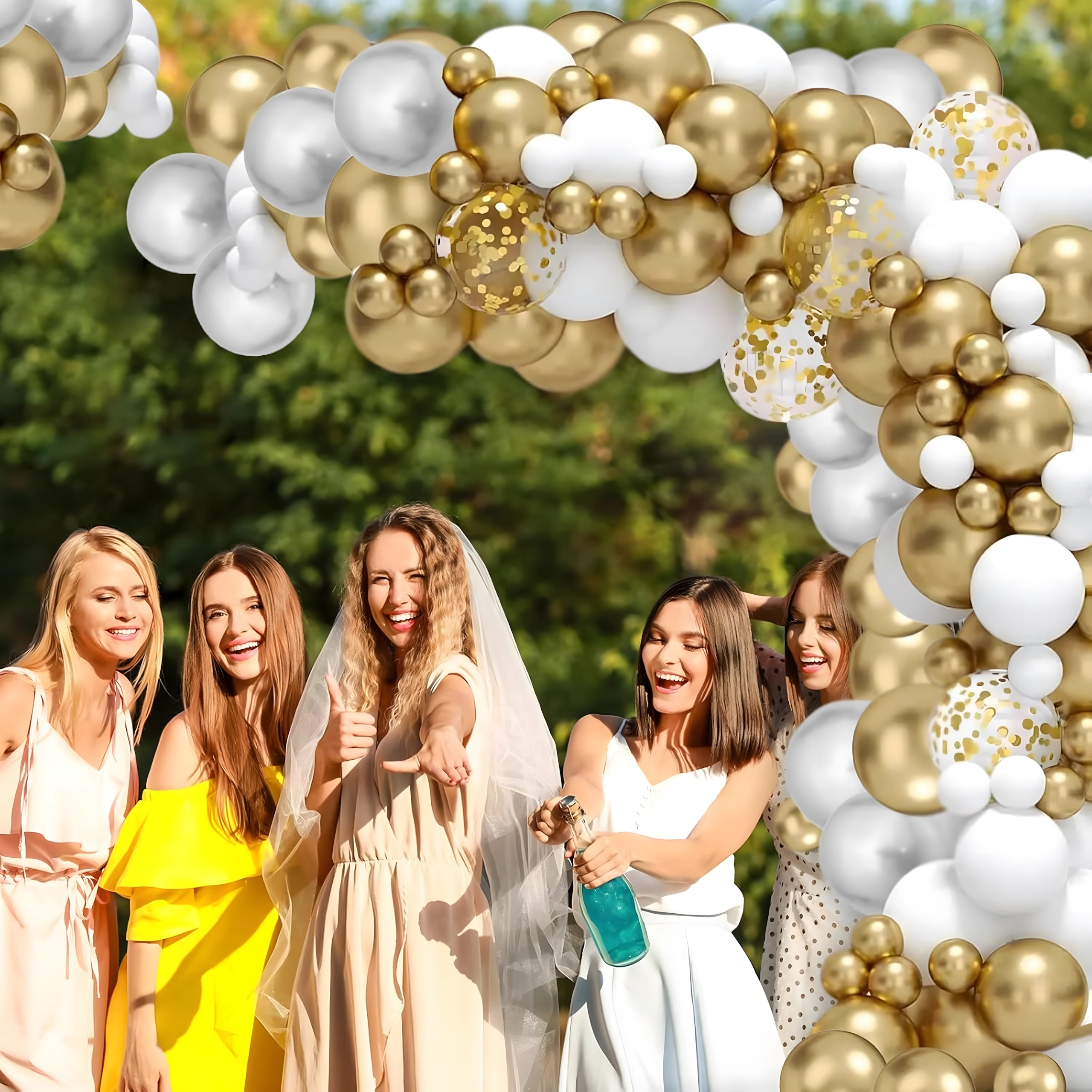 Ta elegantna balonasta girlanda v beli, zlati in prozorni kombinaciji spremeni vsak prostor v slavnostno sceno. Zahvaljujoč premišljenemu naboru balonov zlahka ustvarite dekoracijo, ki očara goste in odlično izpade na fotografijah.
